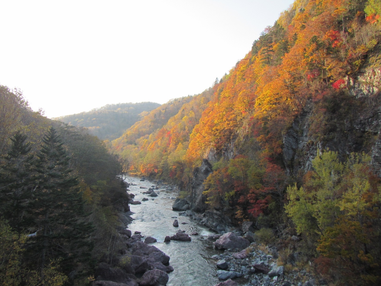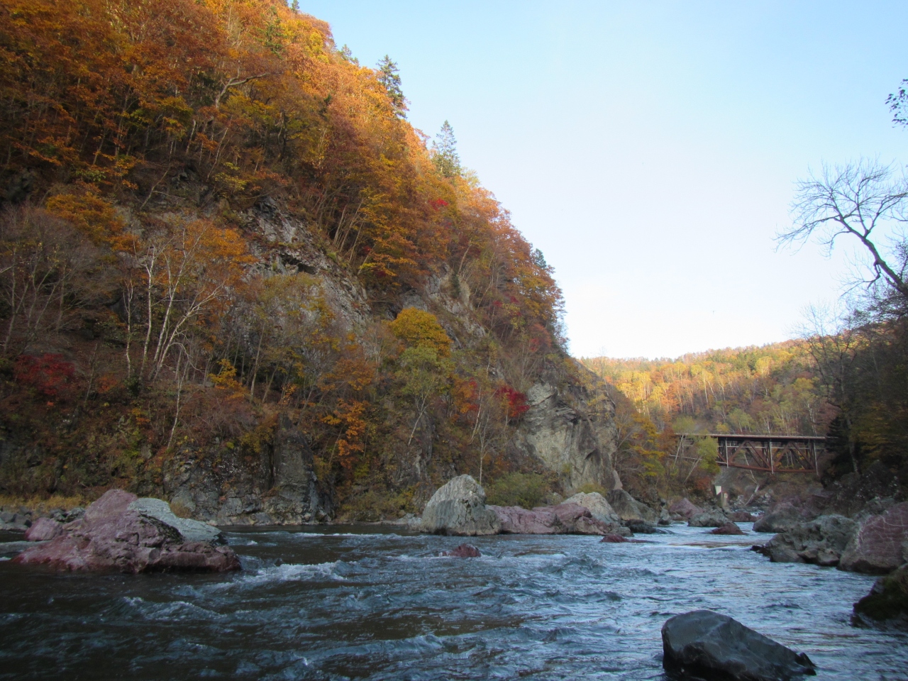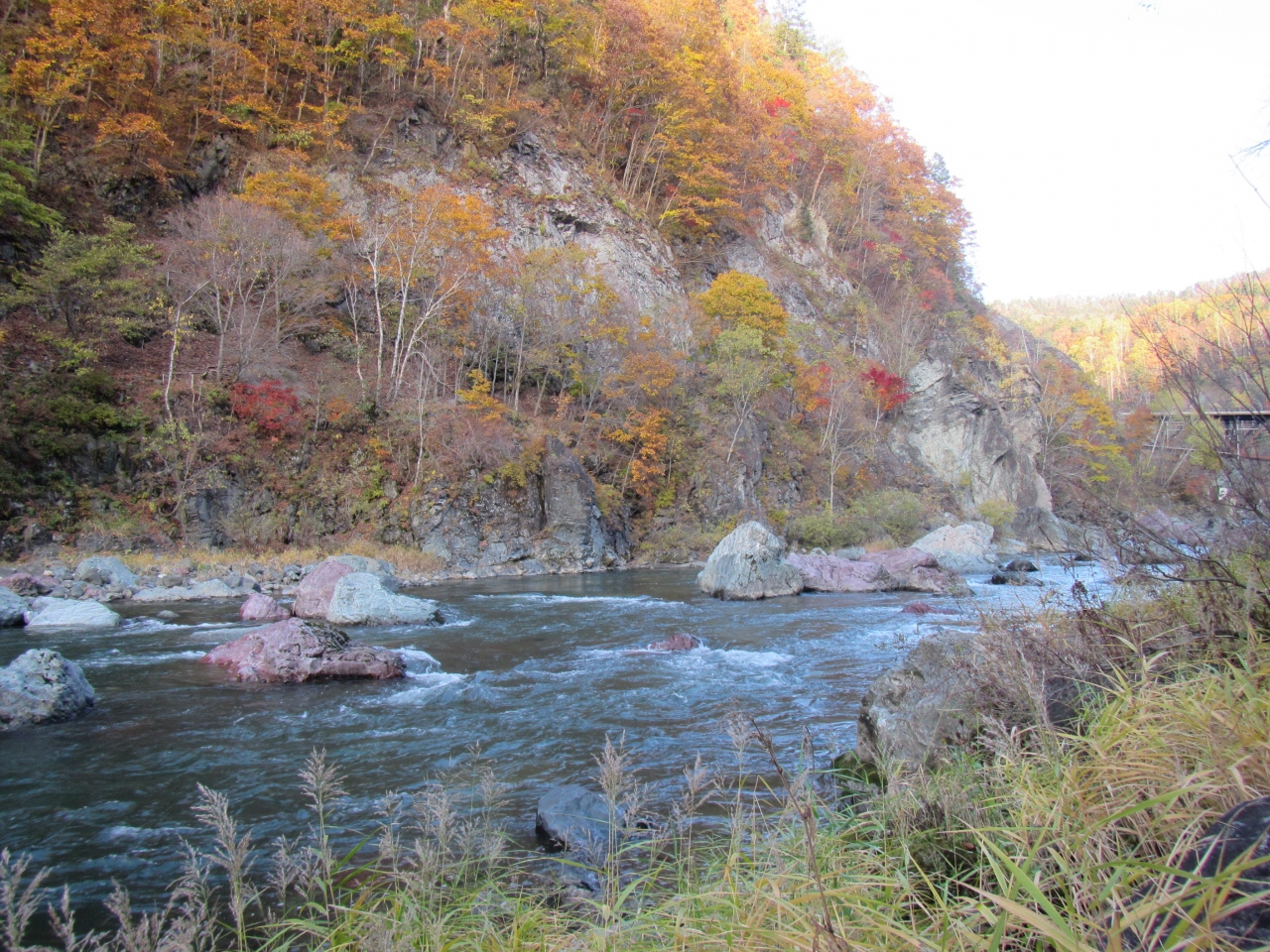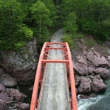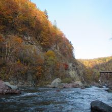 占冠市街へ抜ける道道610号線のトンネル手前の橋の上から、手軽に渓谷を眺めることができるが、ニニウキャンプ場へ進む道道136号線へ折れると、渓谷をより間近で堪能することができる。