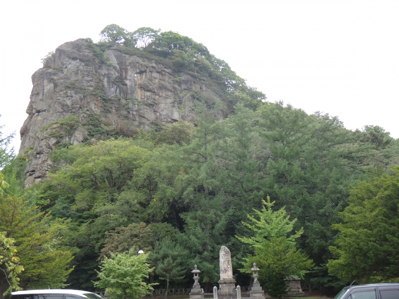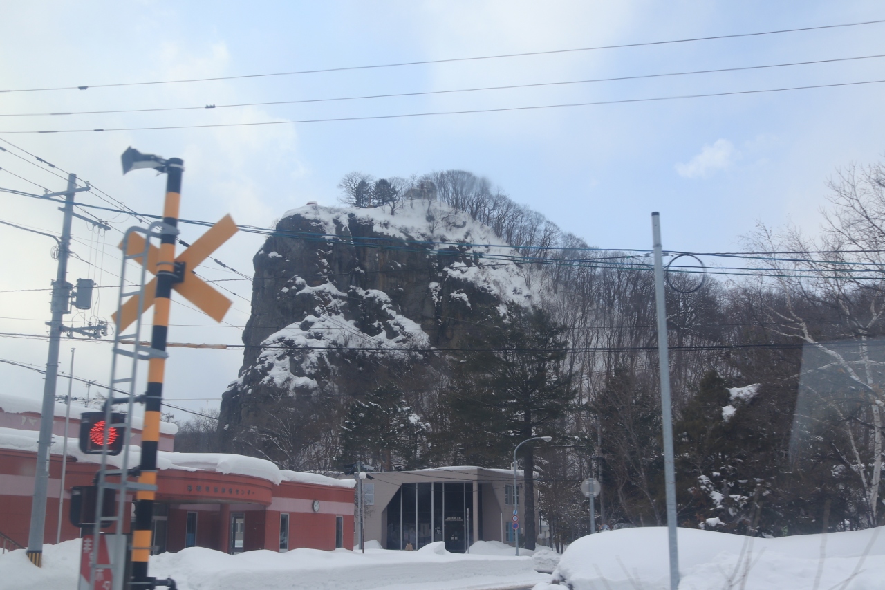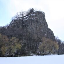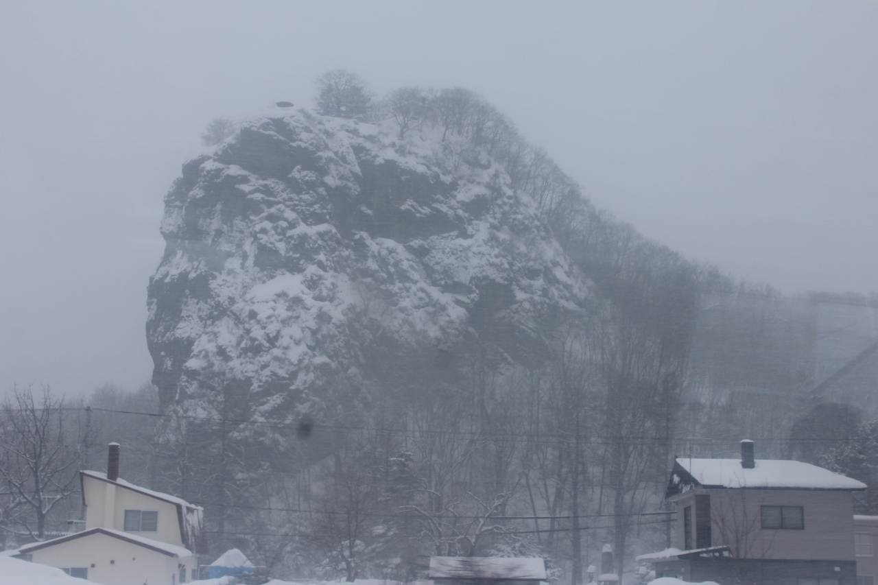 神の棲まう大岩です。頂上部に展望台がありますが大雪のため登頂は断念しました。