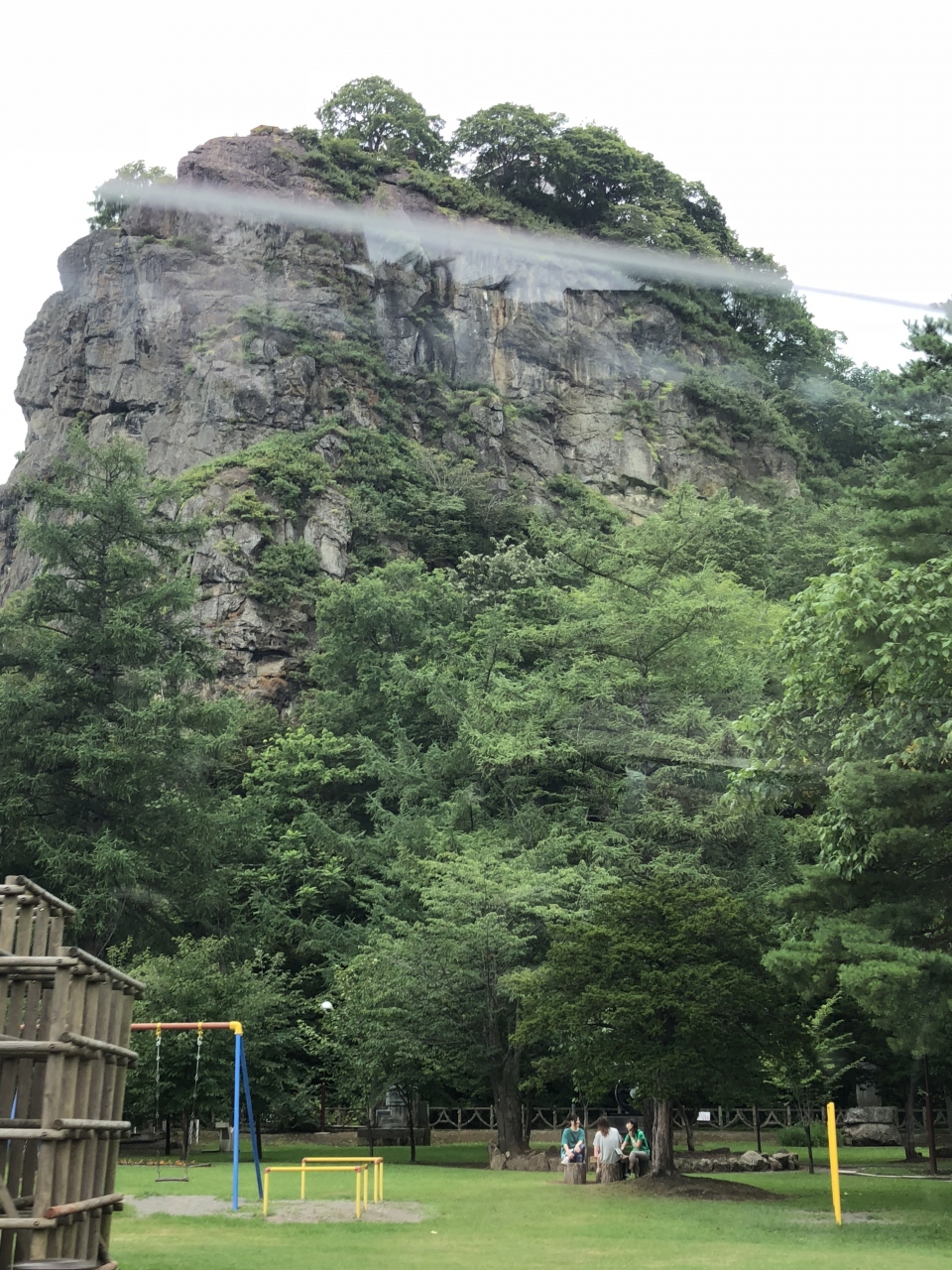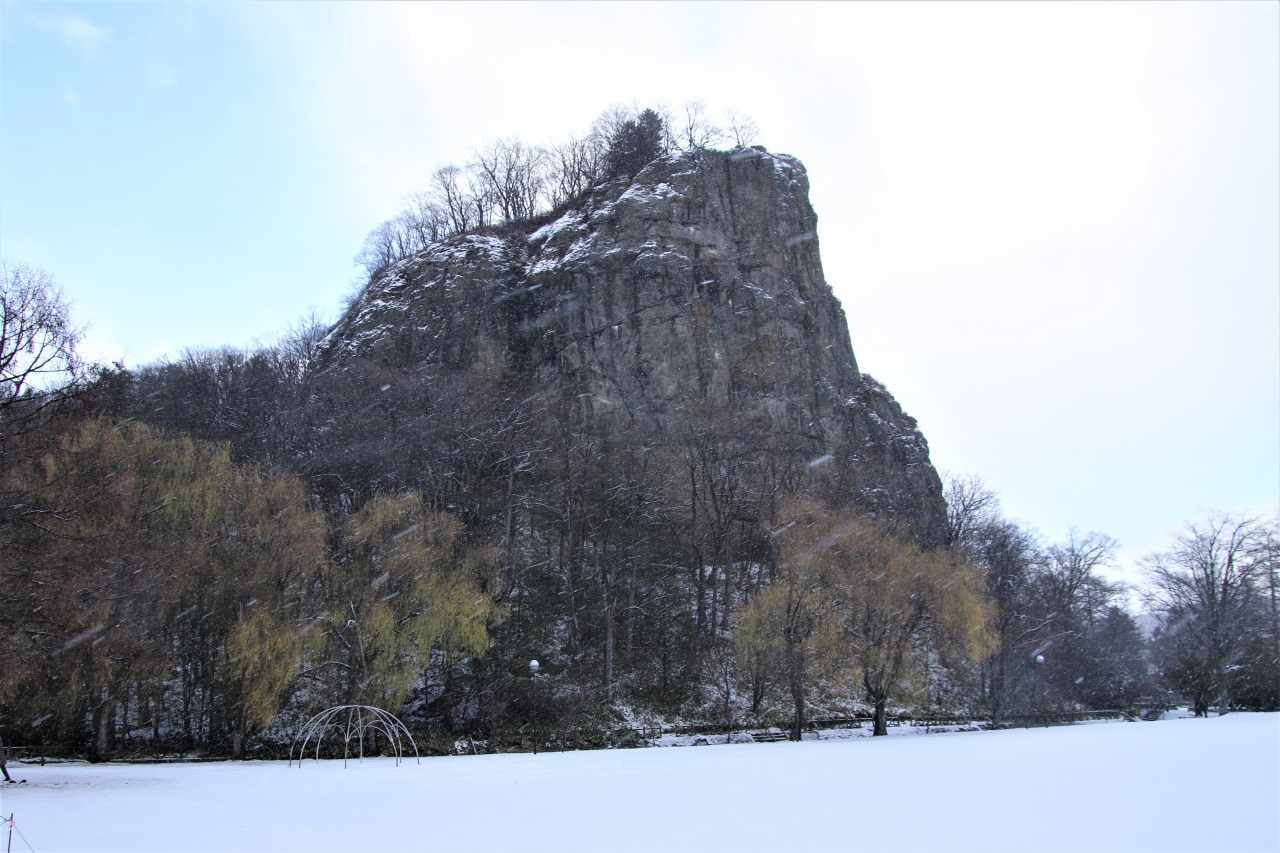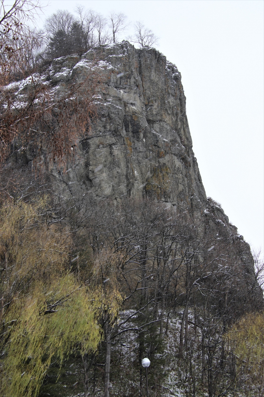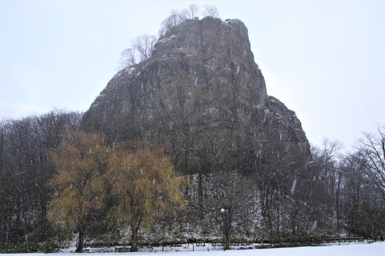 神の棲まう大岩です。頂上部に展望台がありますが大雪のため登頂は断念しました。