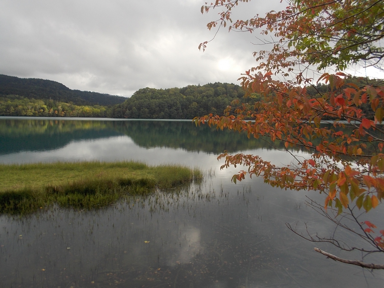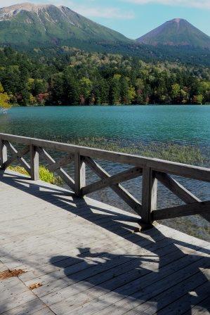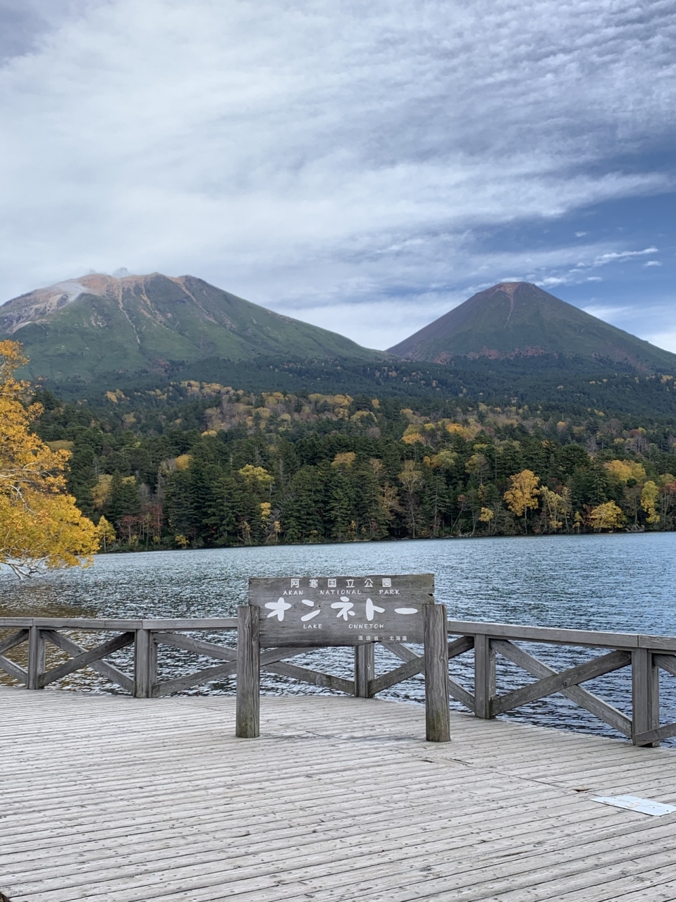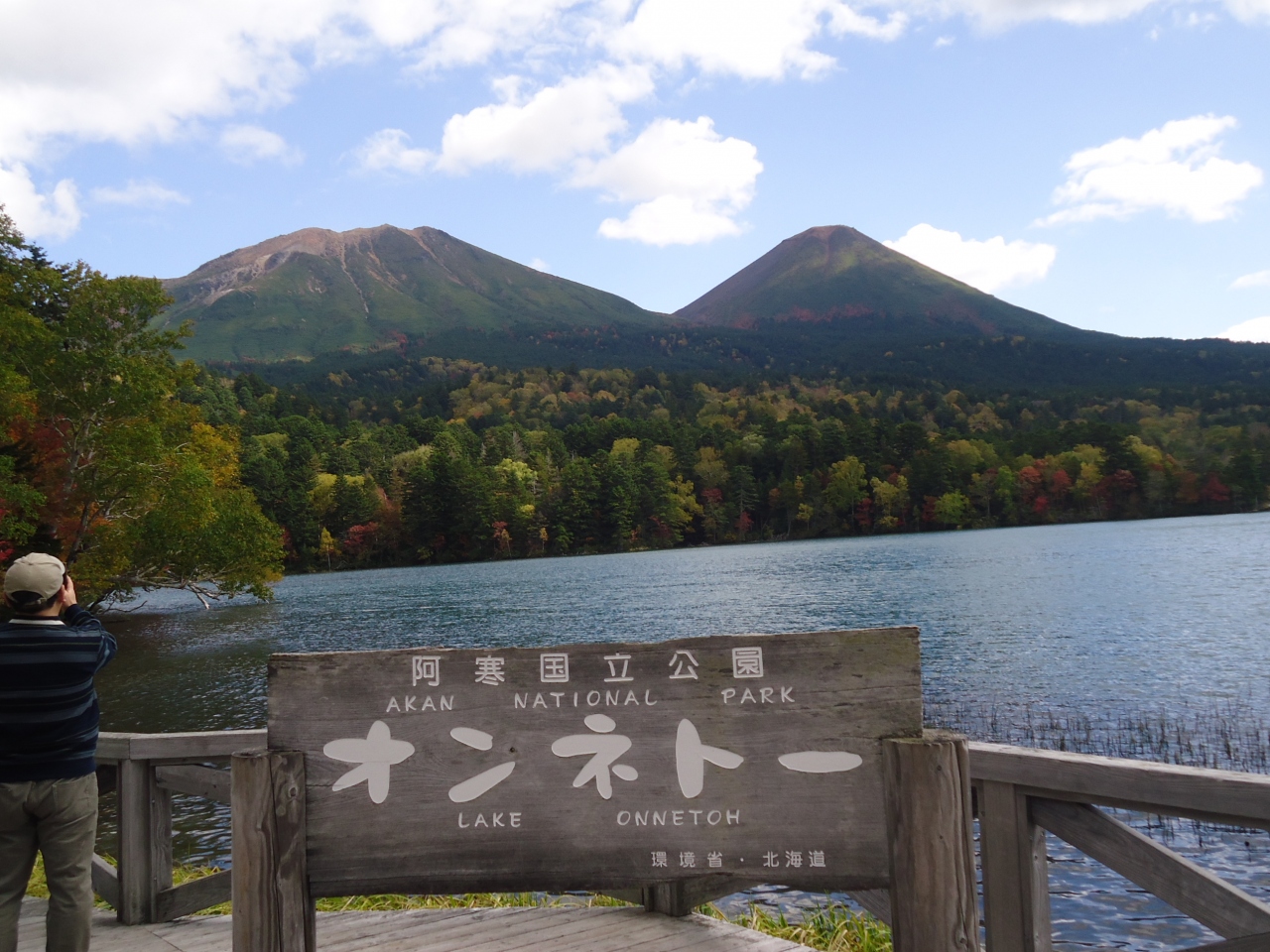 「湖畔展望台」はほぼ湖面レベルですので、朝方の風の条件が良いときなら、雌阿寒岳と阿寒富士の水面への映り込みを見ることができるのですが…今回は十勝川温泉から向かったので到着が11時半になってしまい、そんな光景にはついに会えずじまい。そして10/1現在紅葉はあと少し、という感じでもありました。来年以降のロケハンということで納得することにします。