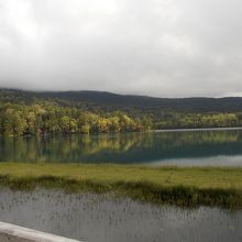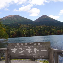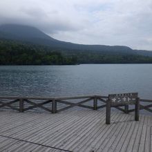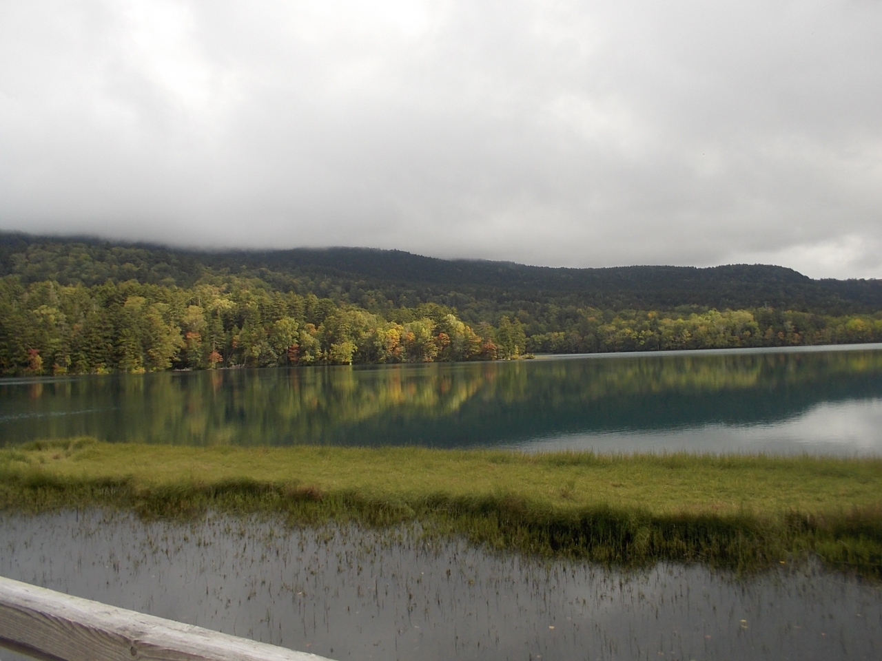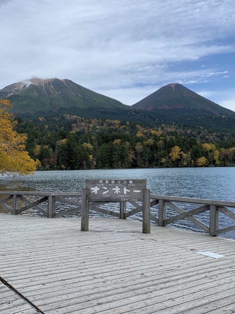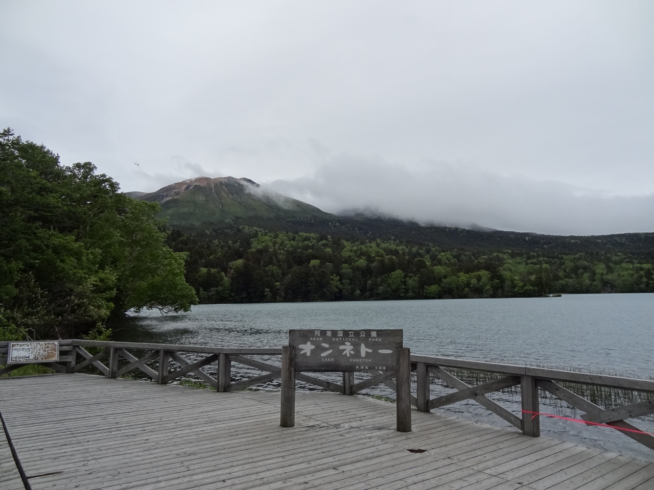 道がオンネトーの湖畔に取っついてから500メートルほど進んだ地点に、非常によく整備された「湖畔展望台」があります。駐車場、... 続きを読む広いです。バリアフリーにもなってます。湖に向けて雰囲気あるウッドデッキが張り出した格好です。そんなわけでオンネトーの中では最も観光客で賑わうスポットになっているようで、湖を背景に置いて記念写真を撮ろうなんて人たちが行列を作っているほどでした。