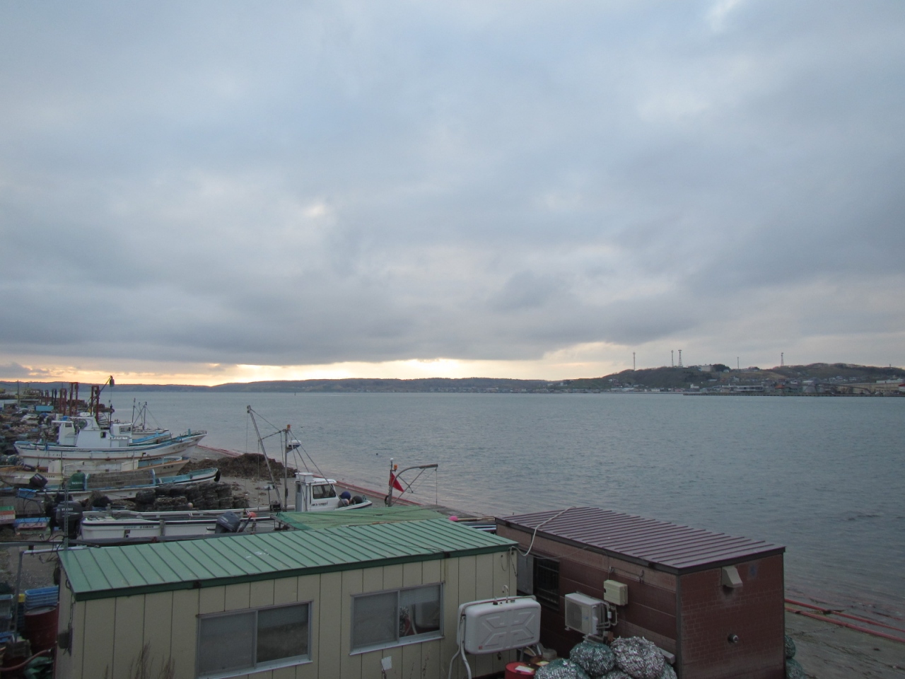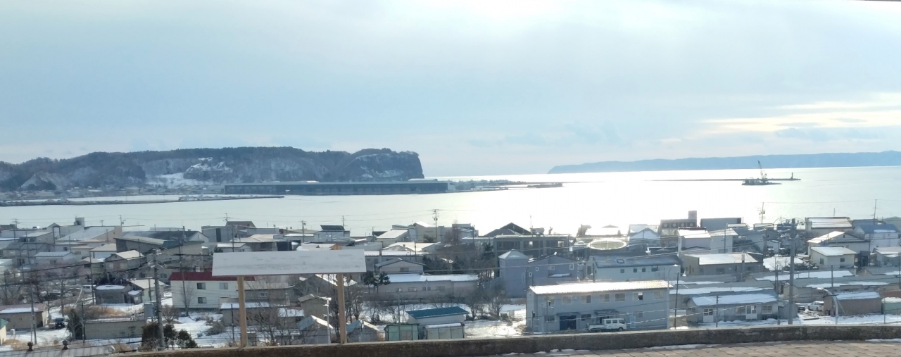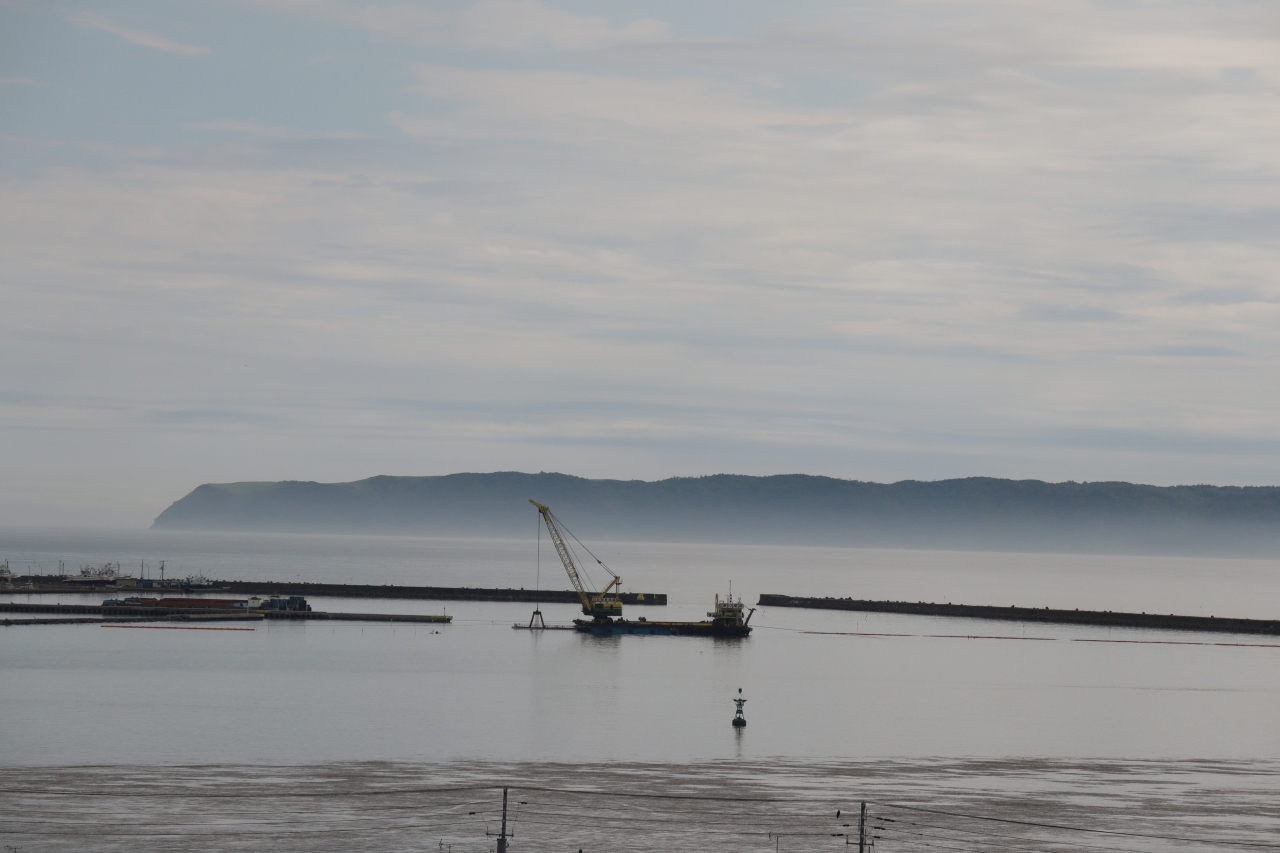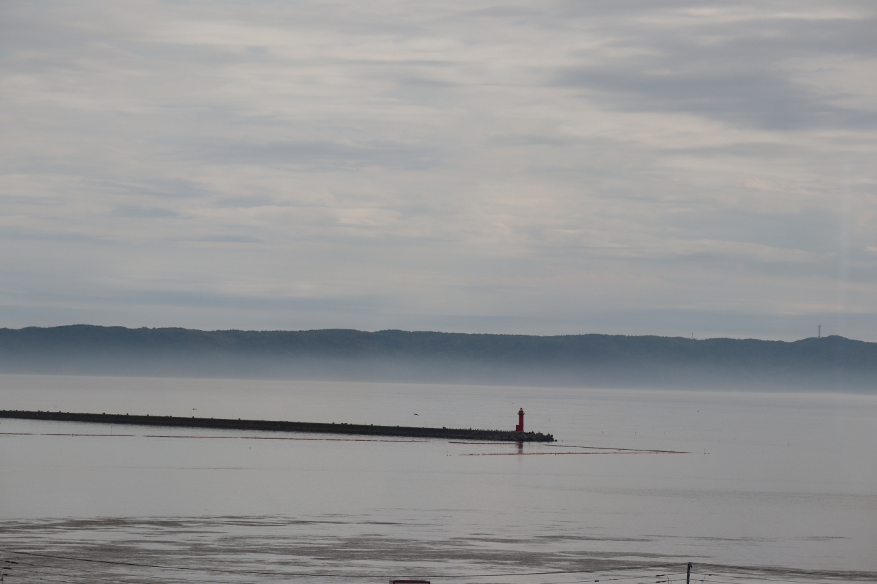 手前に住宅街が広がり港があるようでして、その向こうに小さな灯台がある堤防があり、対岸の半島(頂いた地図を見ますと先端はバラサン岬となっています)に、霧が立ち込めて幻想的な風景が見れました。