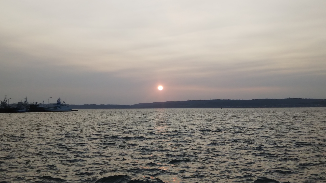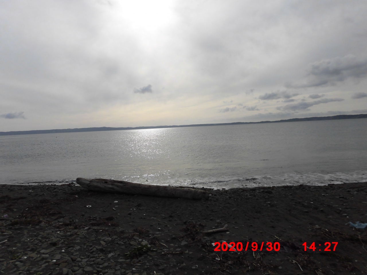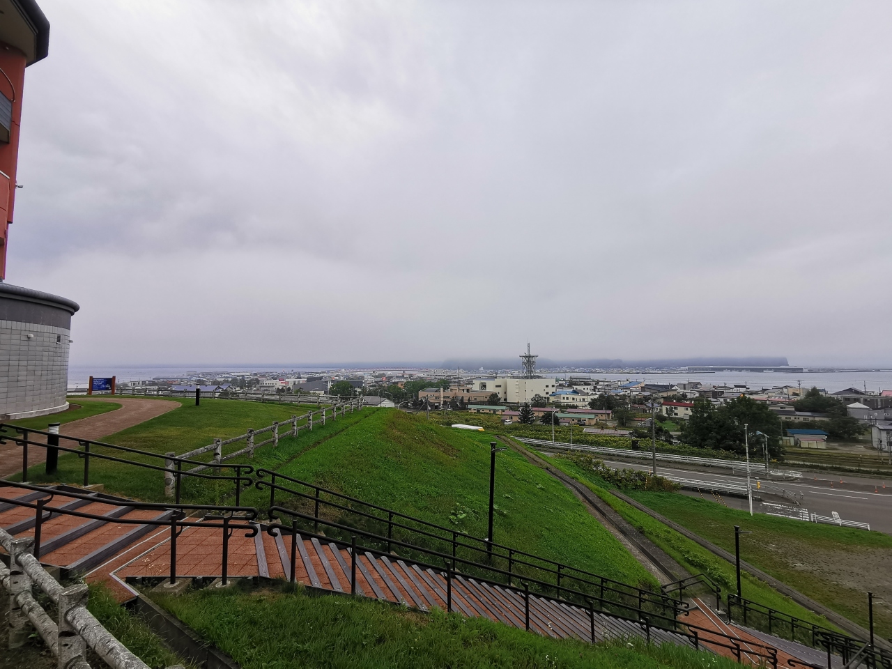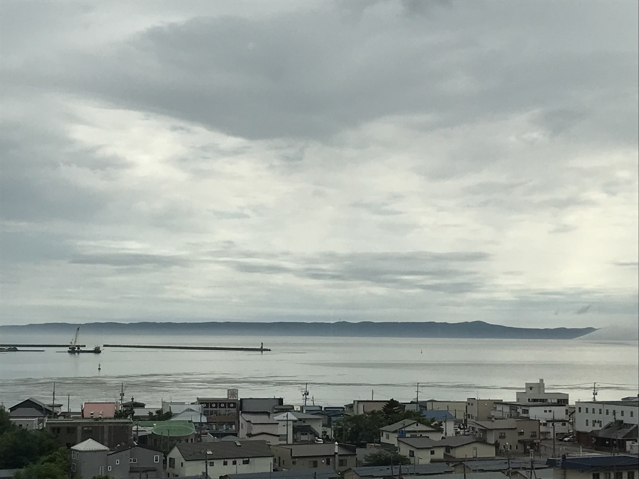 手前に住宅街が広がり港があるようでして、その向こうに小さな灯台がある堤防があり、対岸の半島(頂いた地図を見ますと先端はバラサン岬となっています)に、霧が立ち込めて幻想的な風景が見れました。