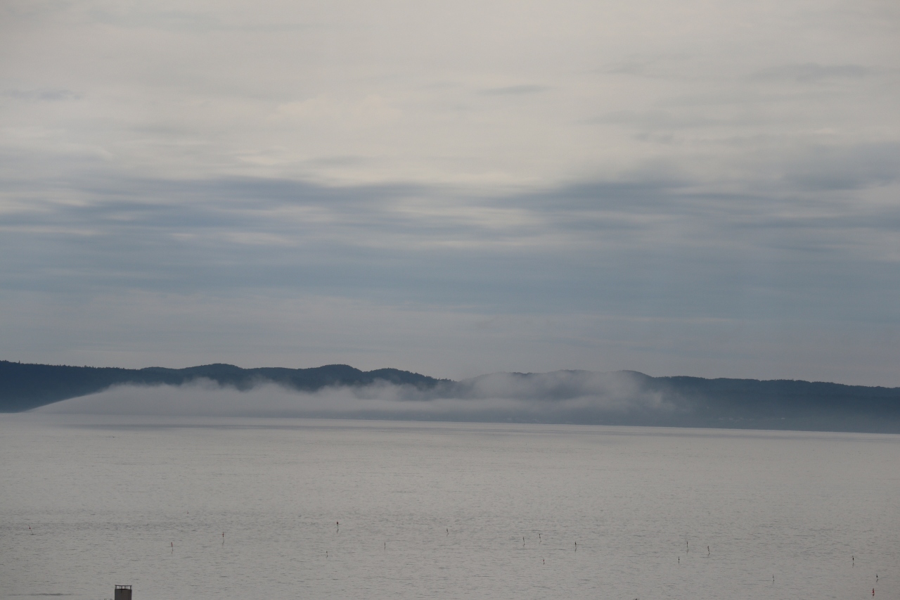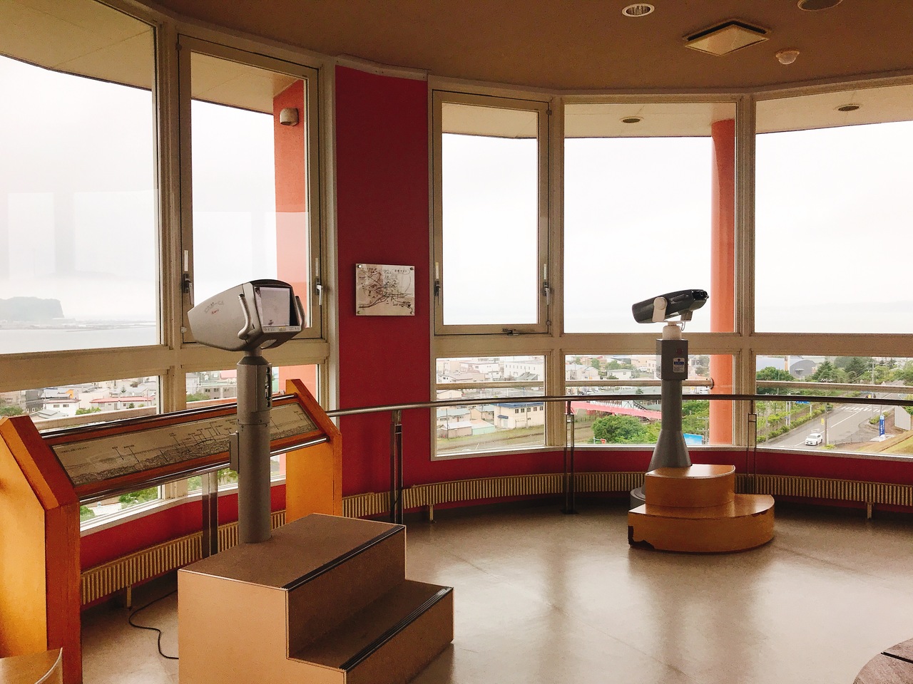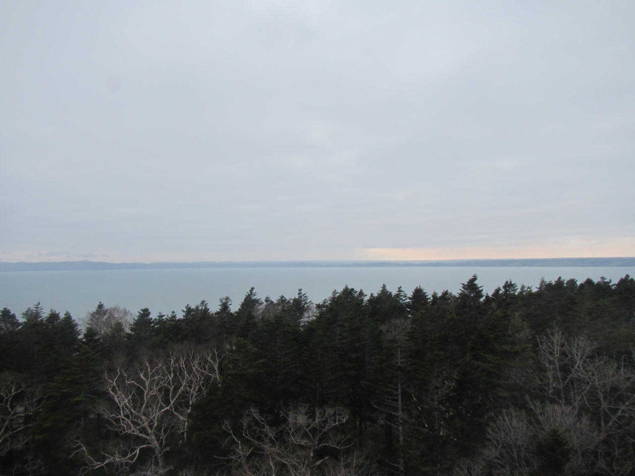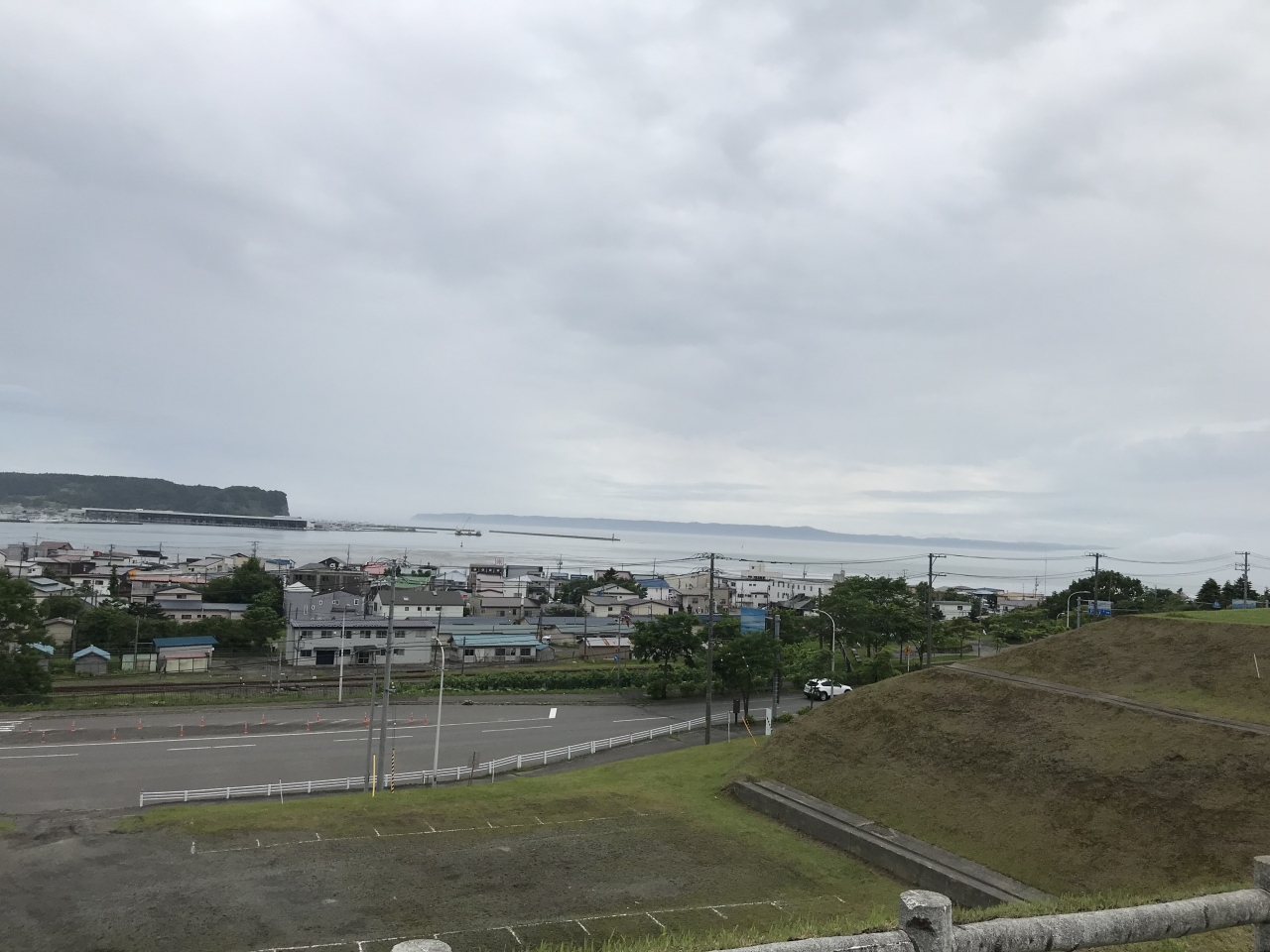 手前に住宅街が広がり港があるようでして、その向こうに小さな灯台がある堤防があり、対岸の半島(頂いた地図を見ますと先端はバラサン岬となっています)に、霧が立ち込めて幻想的な風景が見れました。