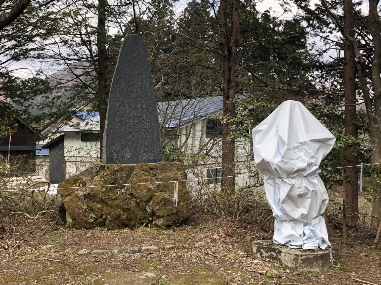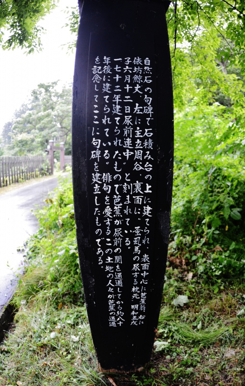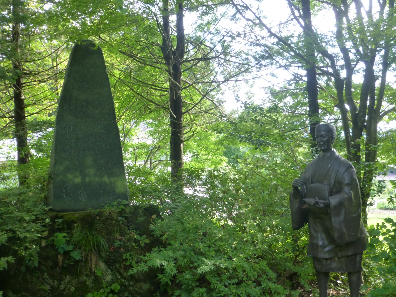 車を止め矢印に従って歩いて行ったがどこにあるのか不明なので、遊んでいる子供たちに尋ねたら父親が出てきてくれて親切に教えてくれた。芭蕉像は補修中でビニールシートが掛けられていたが、親切にも外してくれて写真を撮ることができた。近くに芭蕉の句碑もある。