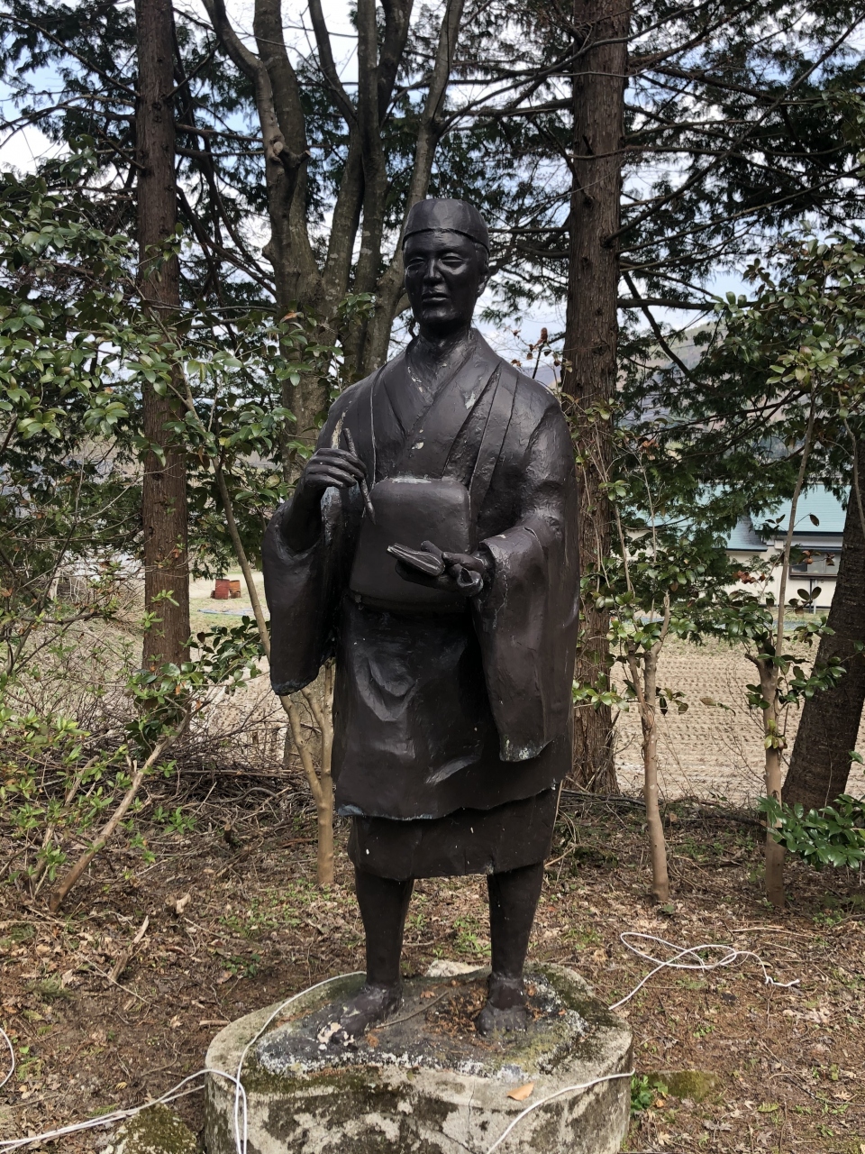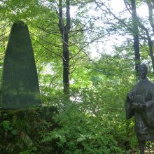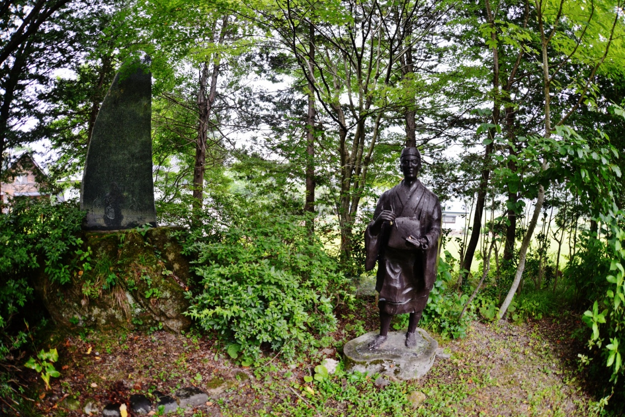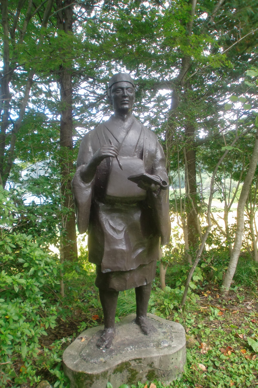 車を止め矢印に従って歩いて行ったがどこにあるのか不明なので、遊んでいる子供たちに尋ねたら父親が出てきてくれて親切に教えてくれた。芭蕉像は補修中でビニールシートが掛けられていたが、親切にも外してくれて写真を撮ることができた。近くに芭蕉の句碑もある。