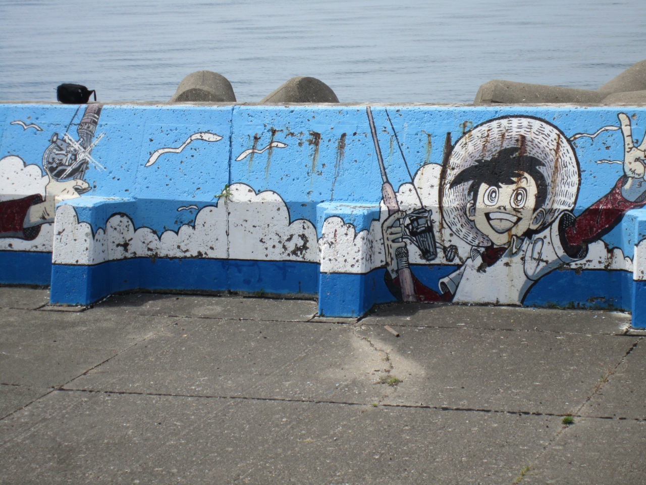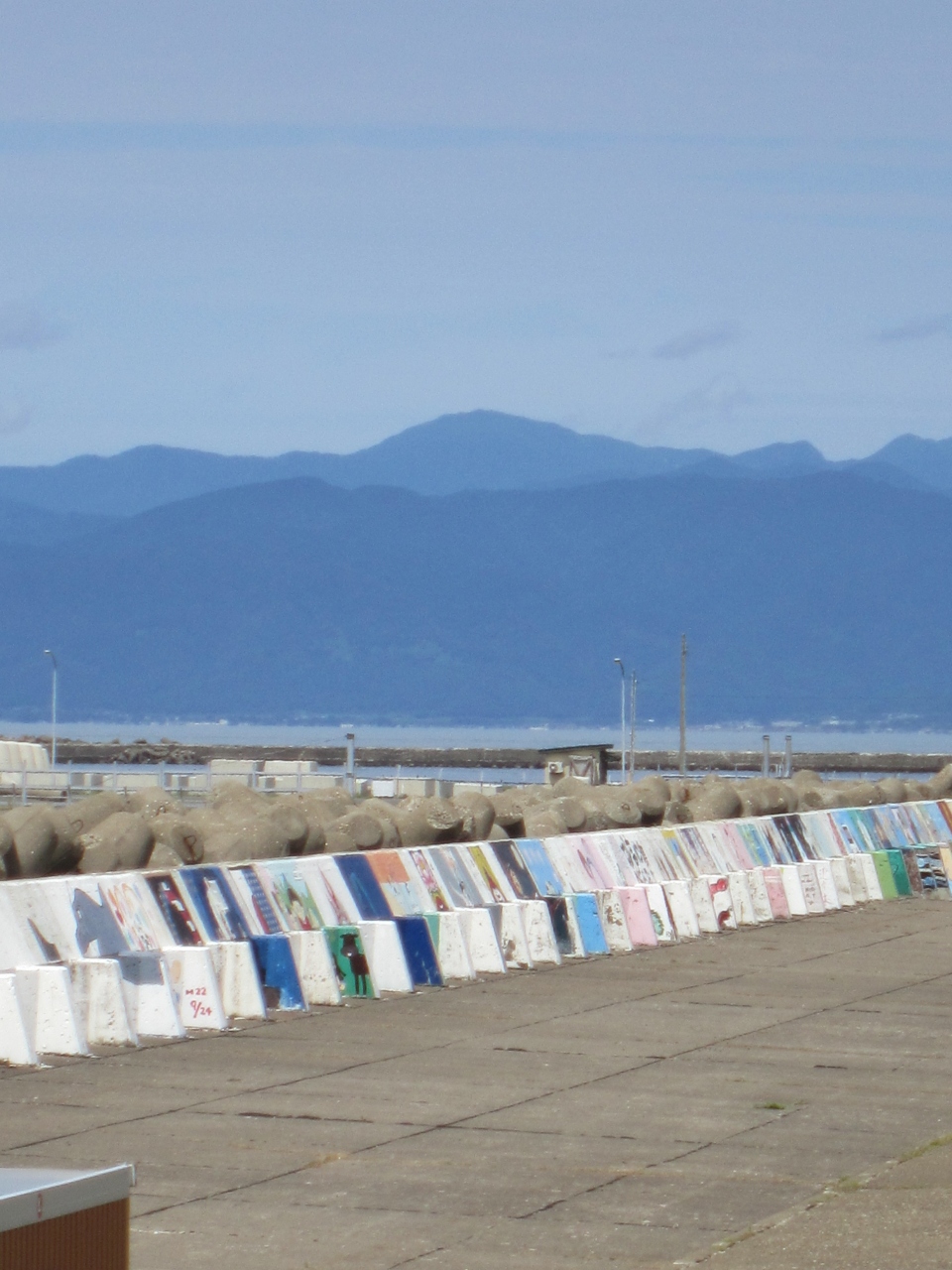 防波堤に描かれた約256点ものにぎやかな絵画展、津波慰霊碑も