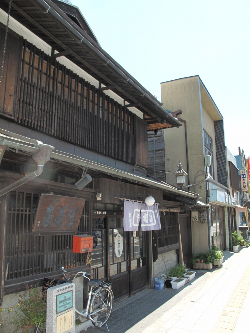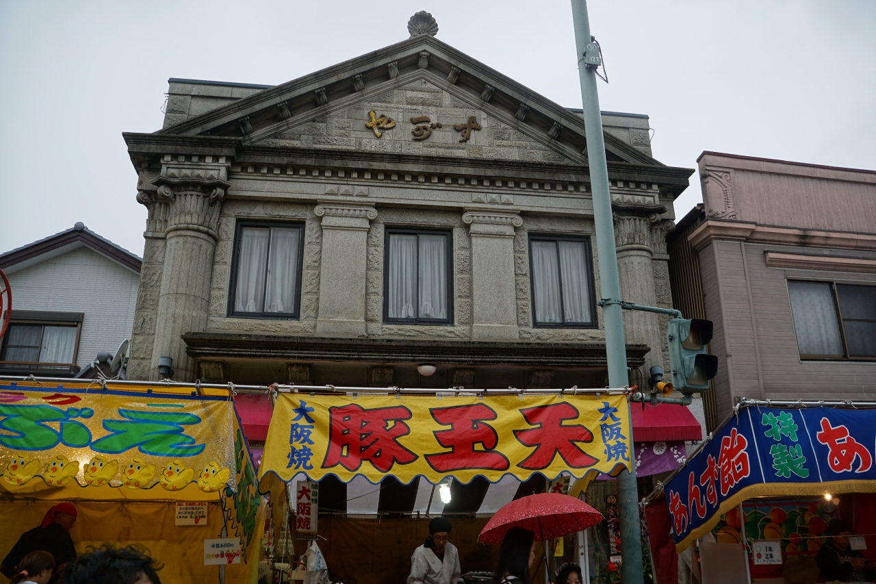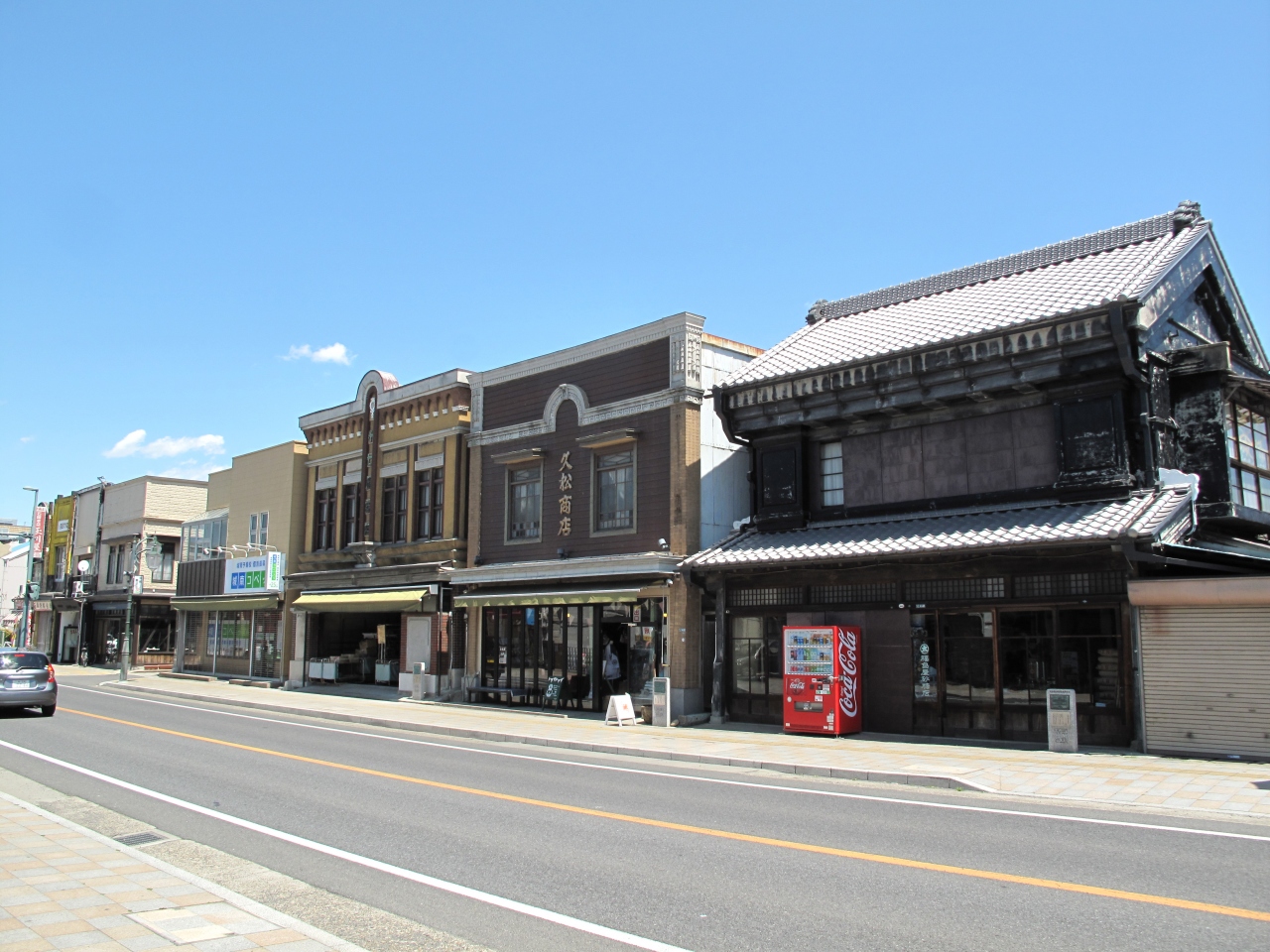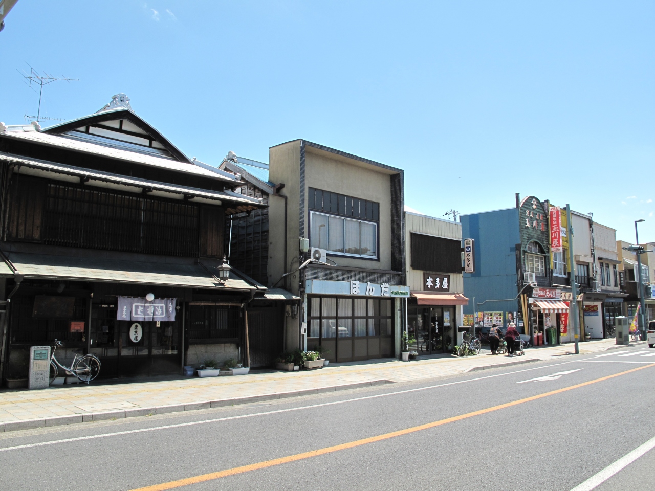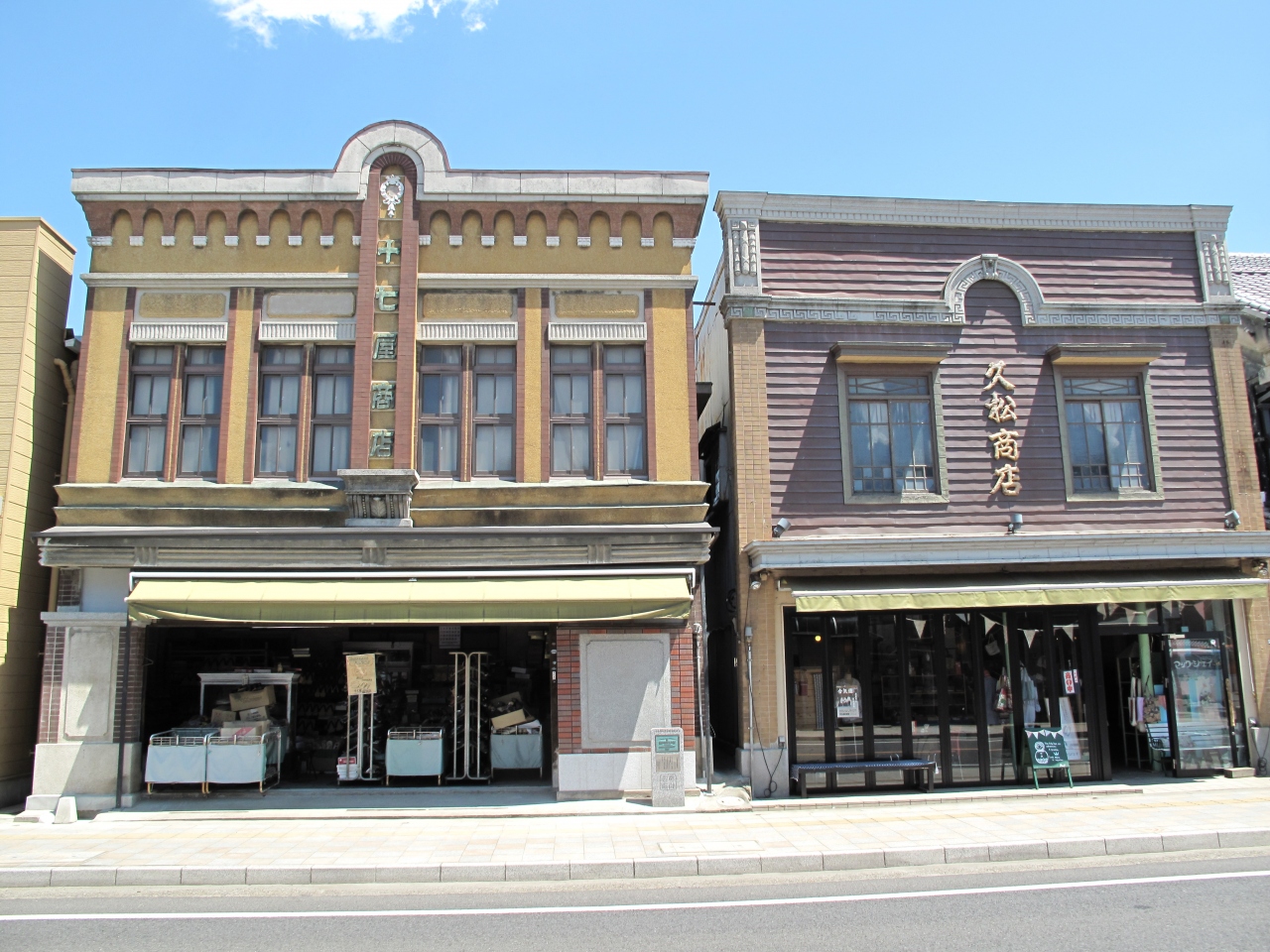 通りには、木造2階建の店舗兼住宅で、建物前面が平坦に仕上げられて装飾された看板建築が見事に並んでいます。