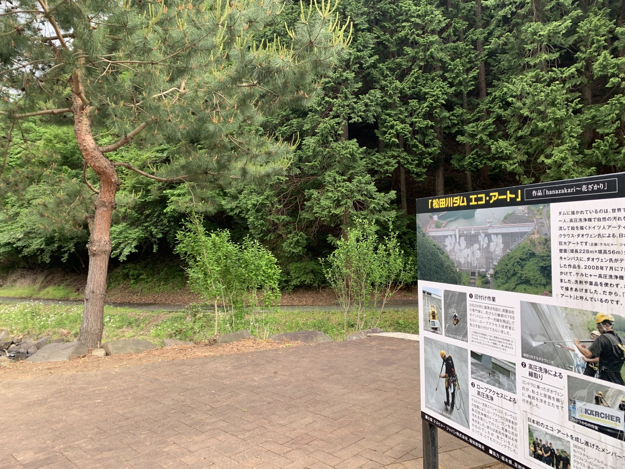 エコアートという企画でダム堤体に高圧洗浄機で花の絵を描いたそうで、描かれた当時の写真は展示してありましたが、月日と言うのは流れるもので、時と共に作品は薄くなり今や全く分かりませんでした。