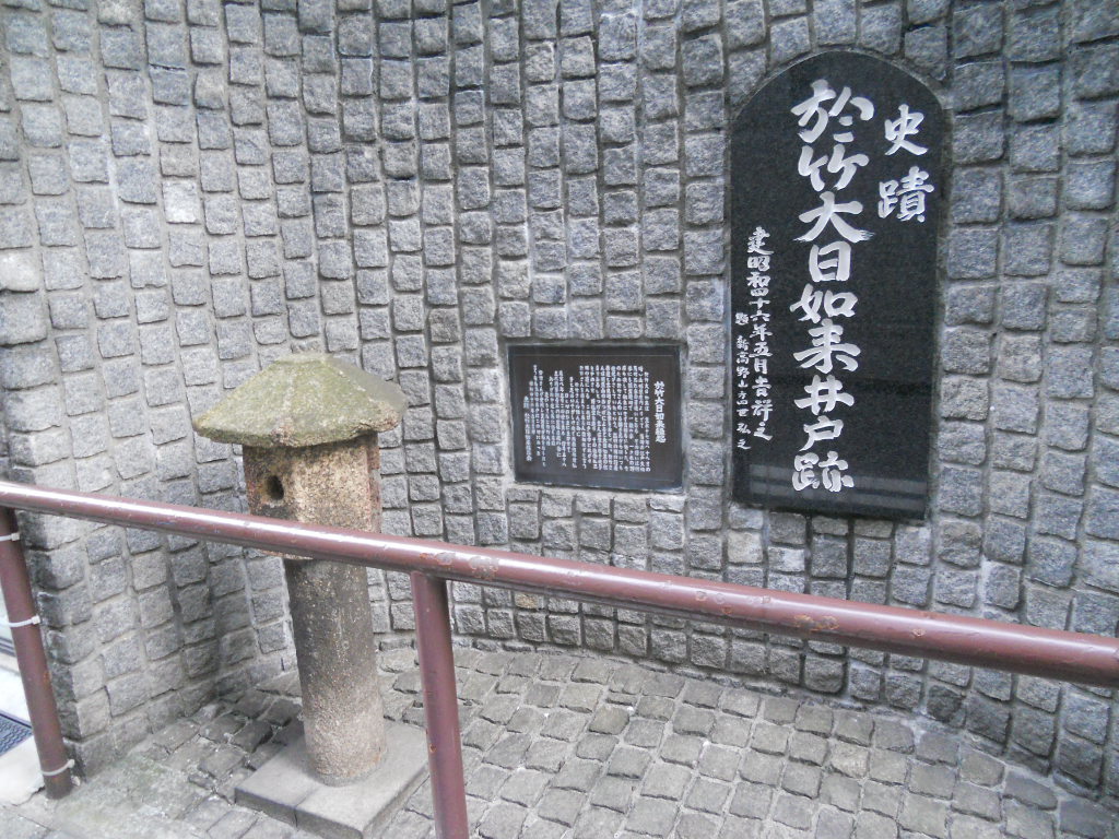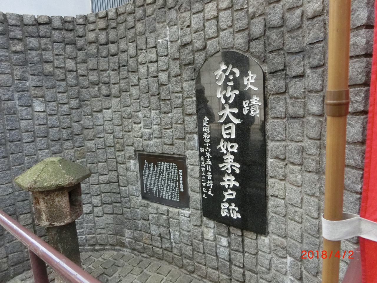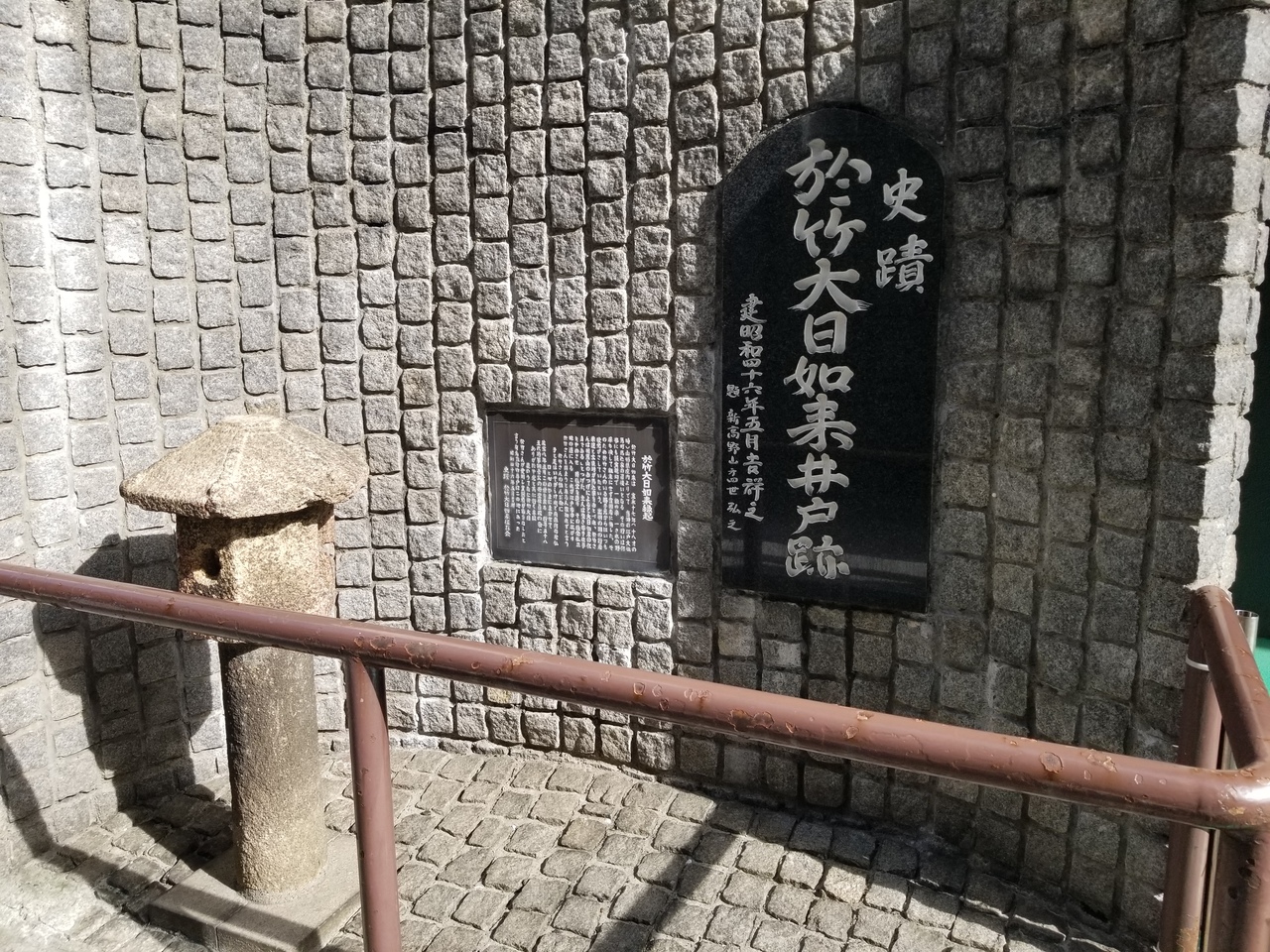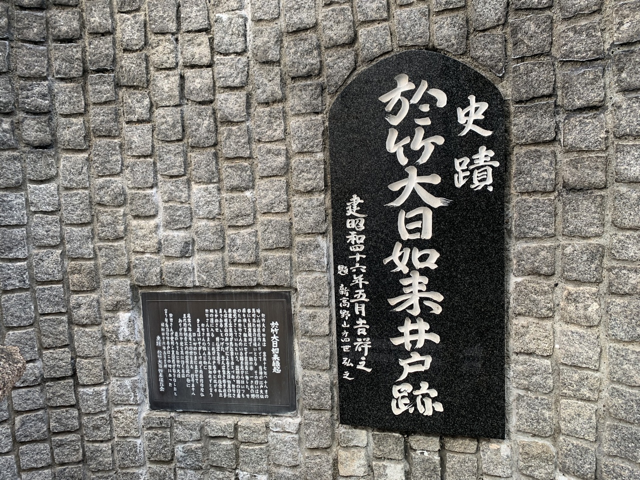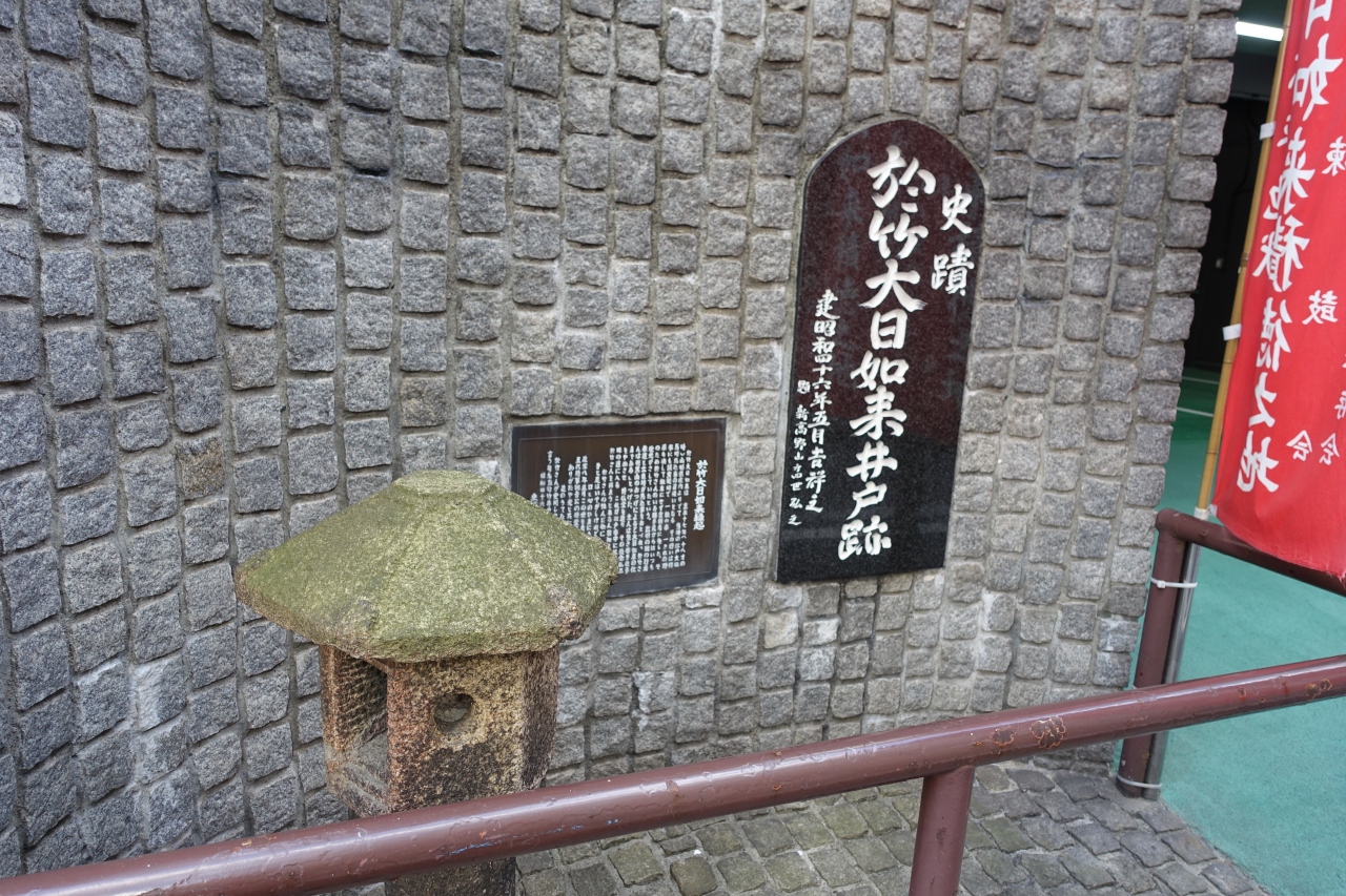 黒の御影石に白文字で【於竹大日如来井戸跡】と書かれた石碑がたっていました。