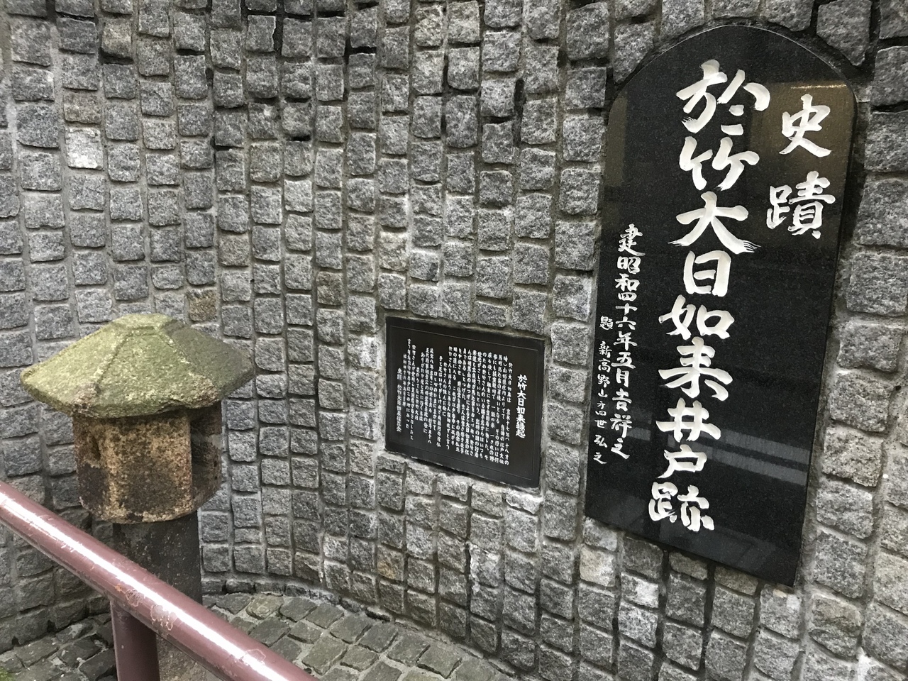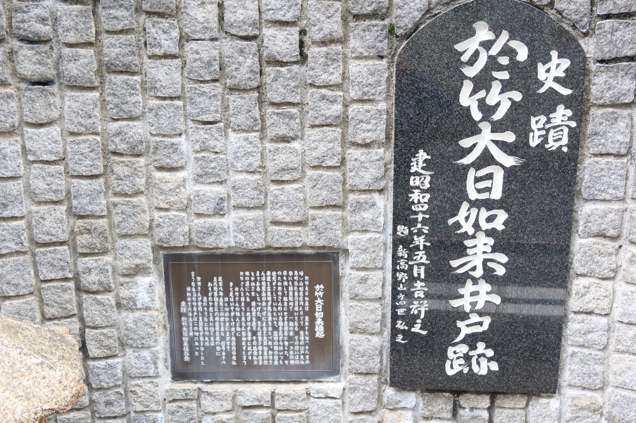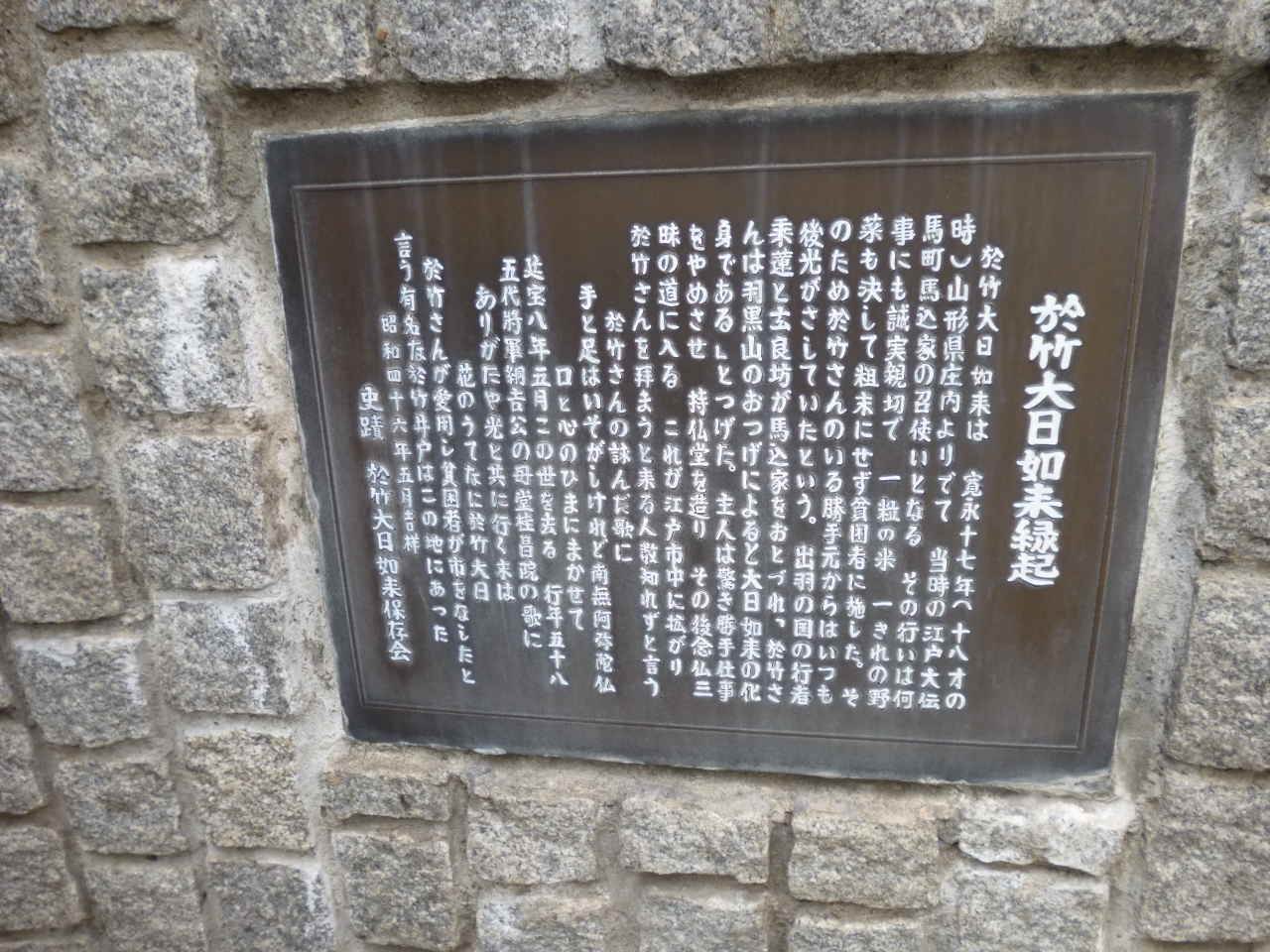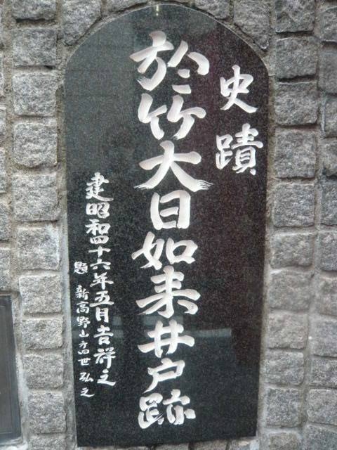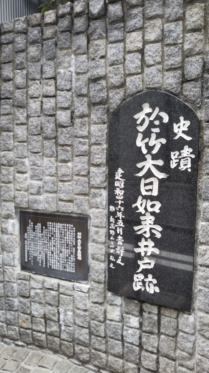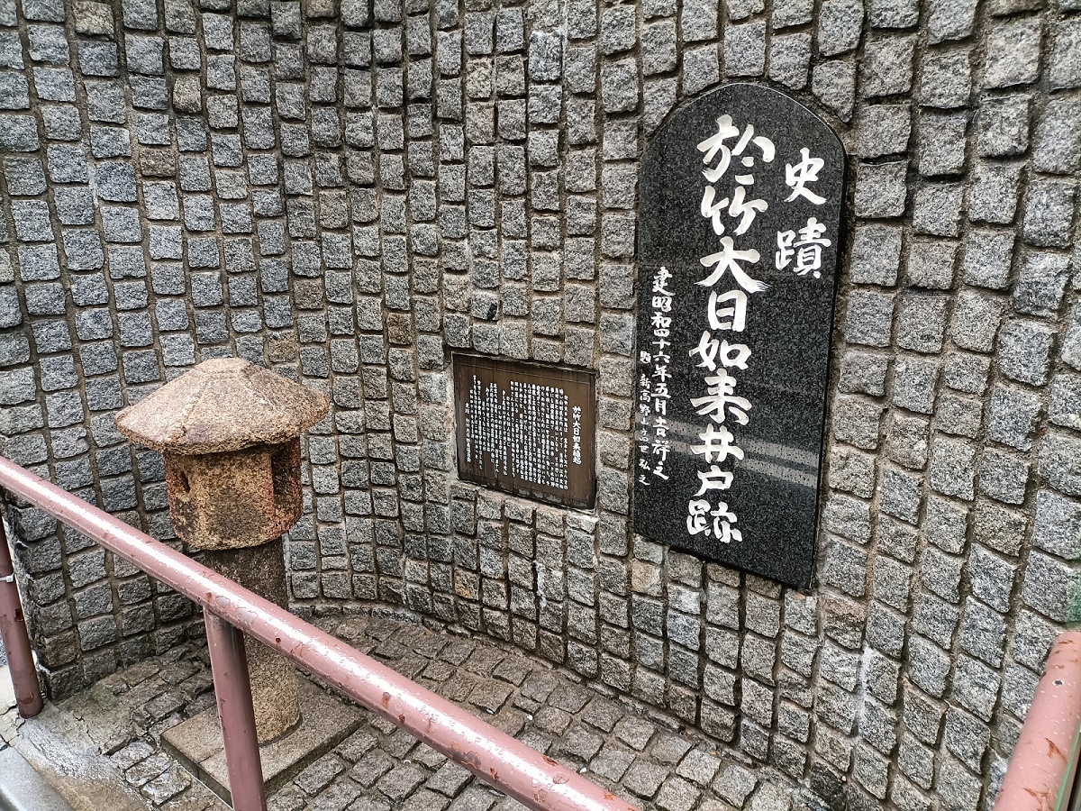 黒の御影石に白文字で【於竹大日如来井戸跡】と書かれた石碑がたっていました。