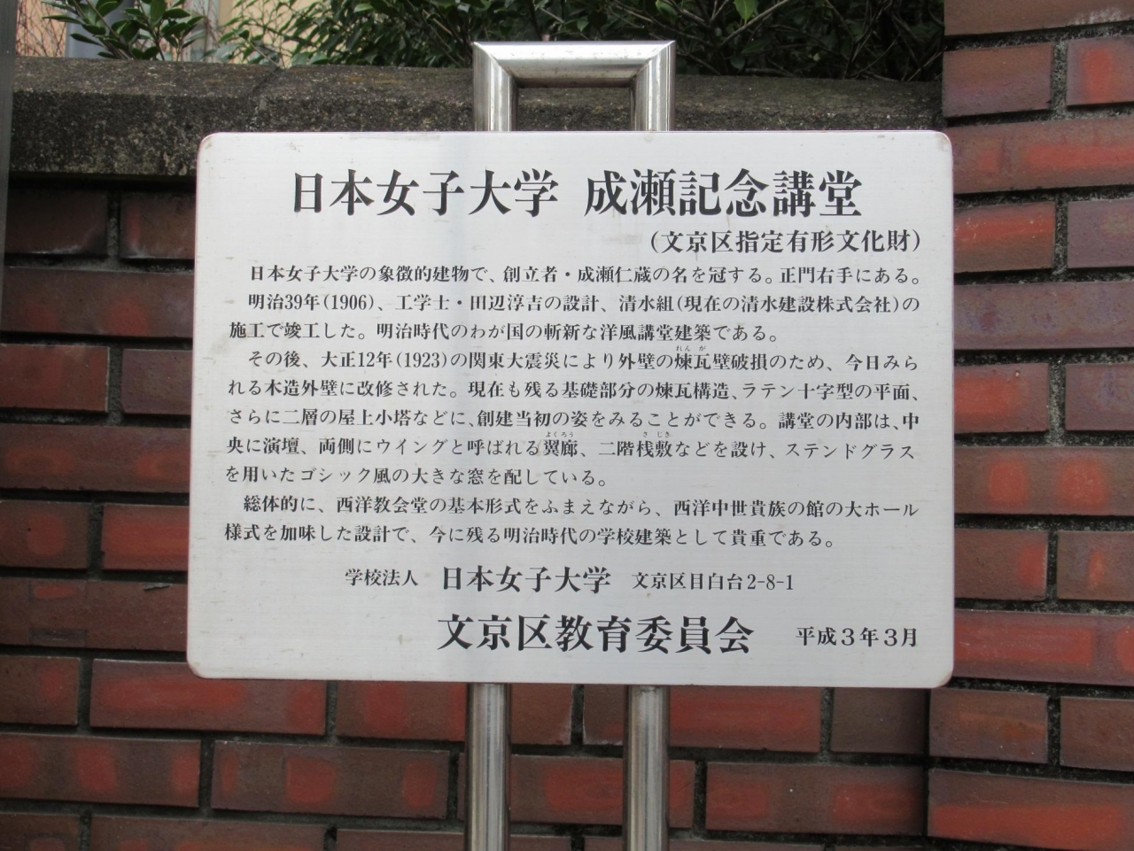 が、正門近くには、文京区指定有形文化財の旧成瀬仁蔵住宅 (成瀬記念館分館) の木造2階建てと成瀬記念講堂があり、ともに大学と同じように歴史がある とのことです。