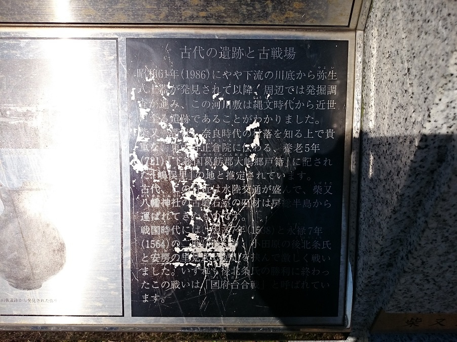 京成金町線柴又駅から徒歩15分程度、葛飾区柴又江戸川河川敷で450年以上前に国府台合戦がありました。大正7年の江戸川改修工... 続きを読む事の際、当時の武器や刀剣類が多数発見されたそうです。天文7年(1538年)と永禄6年(1563年)の二度にわたり北条軍と下総国の里見氏との間で国府台合戦が戦われ、主戦場は江戸川を渡った国府台城近辺でしたが、この江戸川河川敷でも衝突が有ったようです。450年ほど前に合戦が有った場所とは思えないほど、現代ではのどかな雰囲気の河川敷です。説明板とか標識を探しましたが、見つかりませんでした。柴又公園の説明パネルの一部に古戦場の事が記されていたので、写真を投稿します。 閉じる