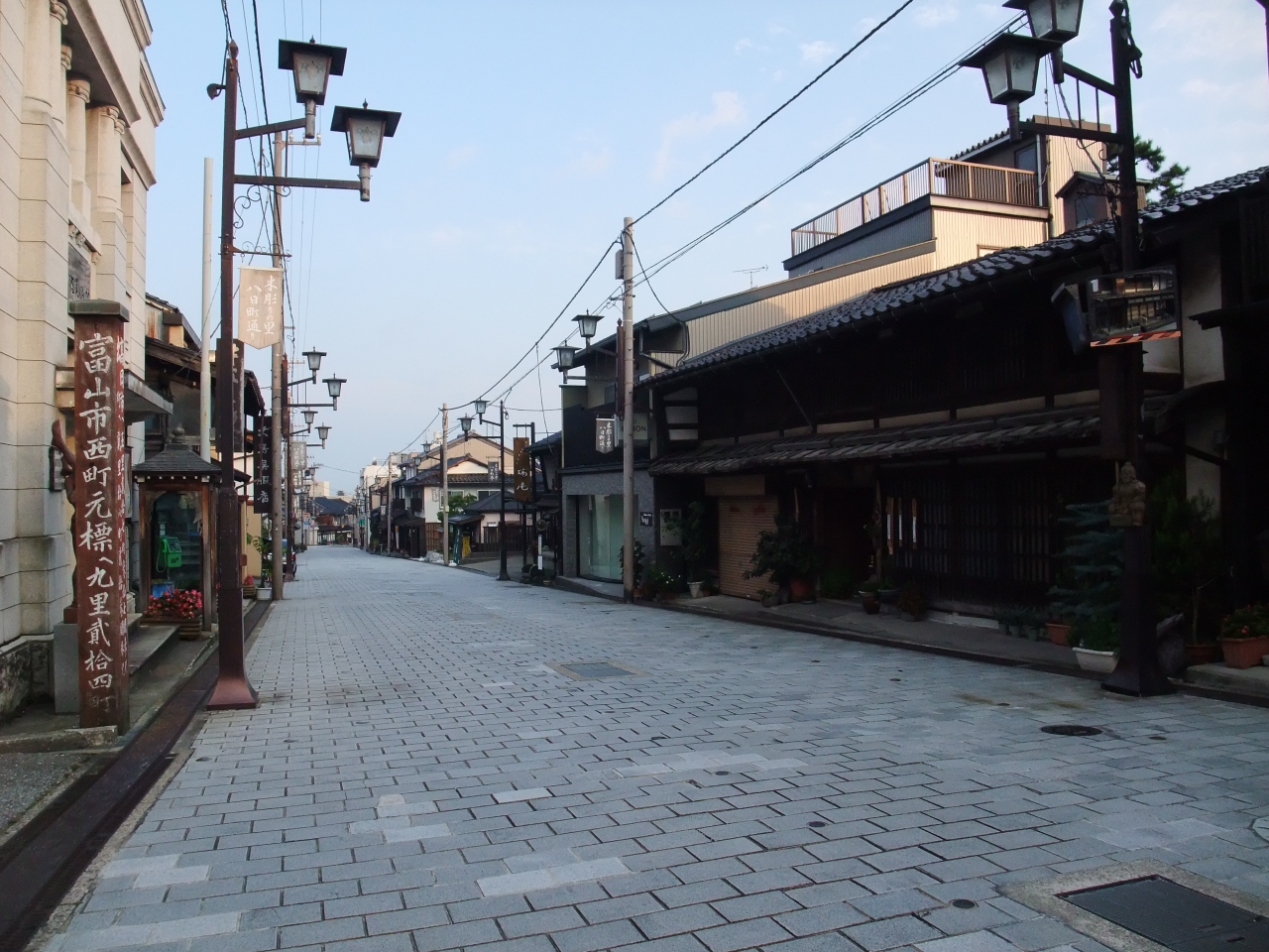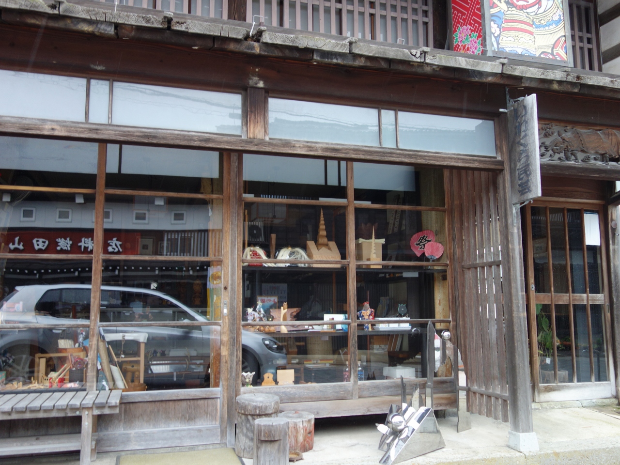 ここはまた沢山の彫刻工房が建ち並び、工房から聞こえる槌音が、「日本の音百選」にも選ばれています。今回、朝早すぎたのか、残念ながら槌音は聞こえてきませんでが、さすが井波は木彫りの里、いたるところに見える木彫り彫刻の数々、石畳の町並みと調和して、とても趣がありました。