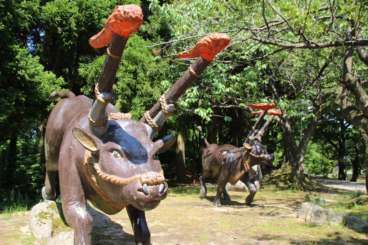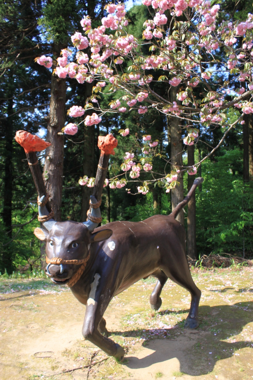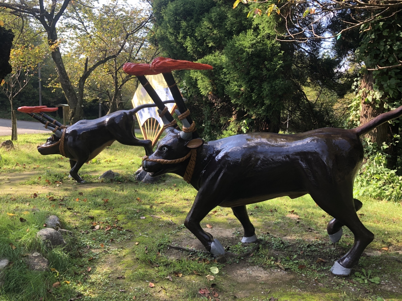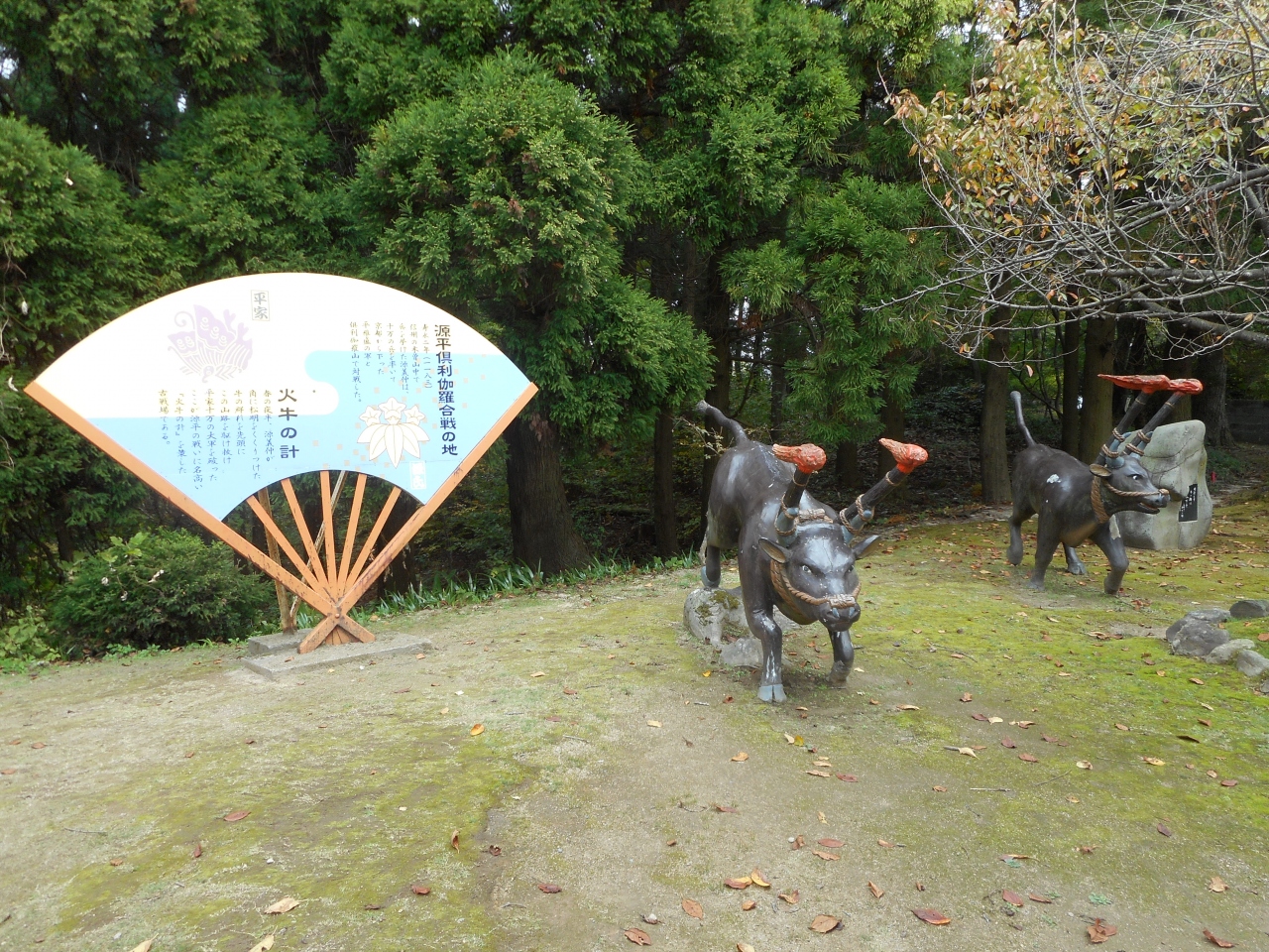 古戦場には、角に松明を付けた牛のモニュメント。ちょっと傷んではいますが、火牛の計の勢いをよく表していると思います。