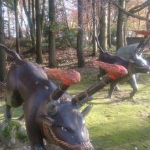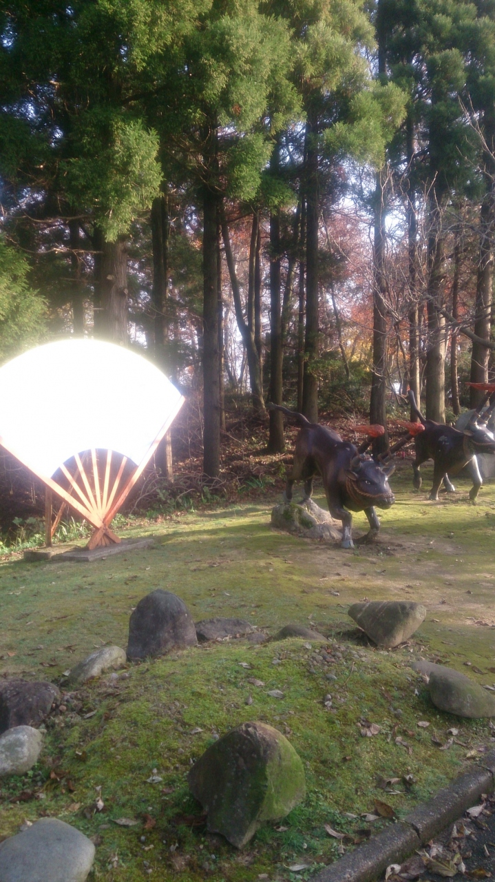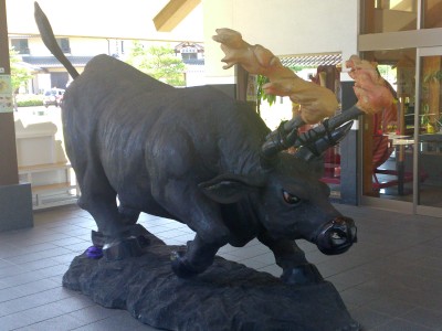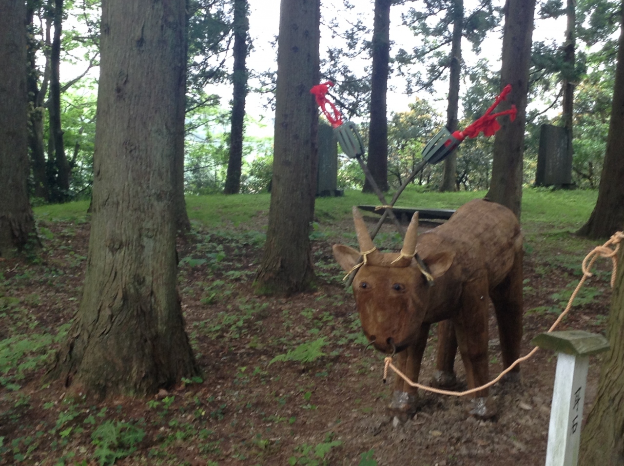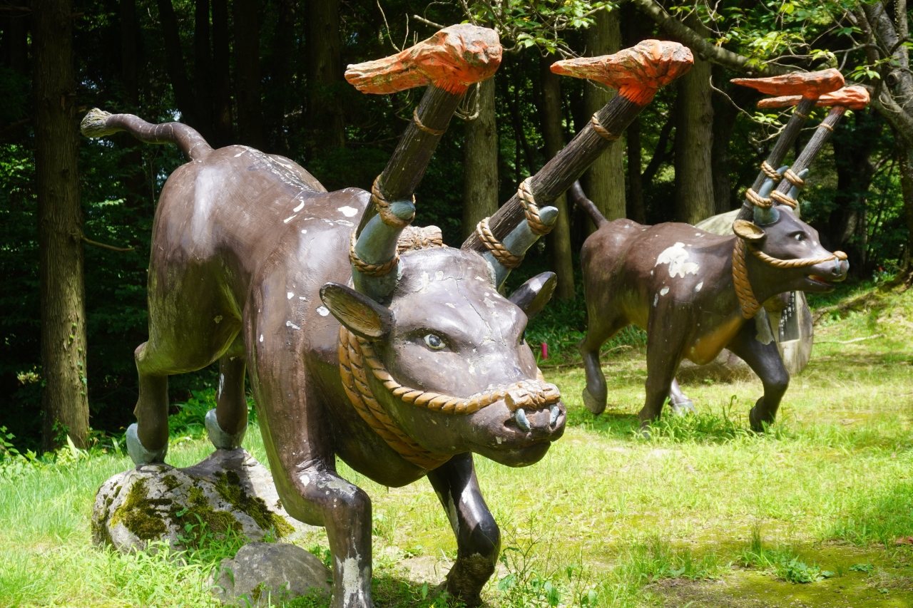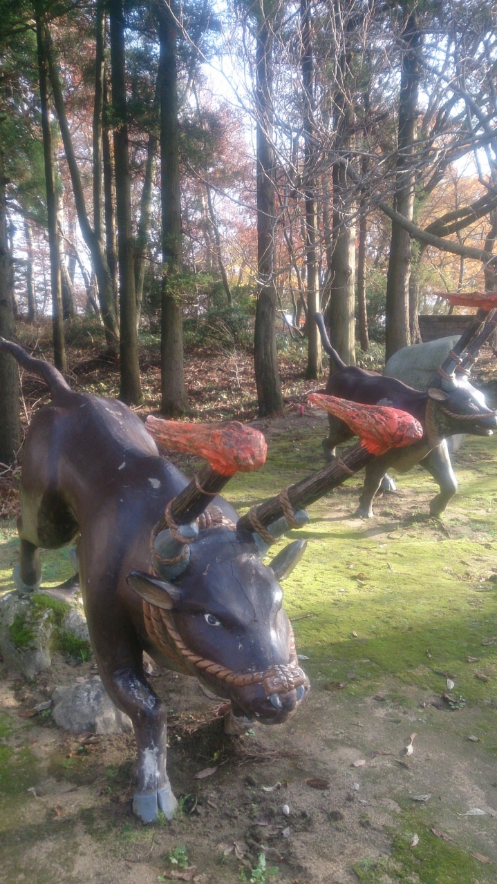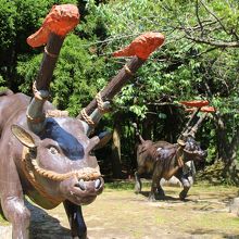 古戦場には、角に松明を付けた牛のモニュメント。ちょっと傷んではいますが、火牛の計の勢いをよく表していると思います。