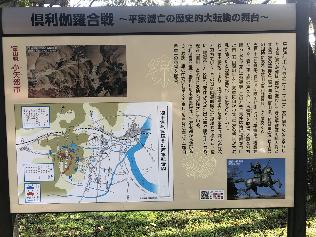 古戦場跡は休憩地点というか一応観光スポットのようになっていて、義仲や倶利伽羅峠の戦に関する数種類の音声ガイドが流れていますが、特に売店や飲食店などはなかったと思います。