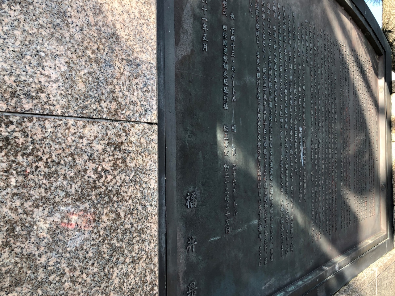 現在では福井県道6号線が通過する橋として鉄筋コンクリート造りに変わっているが、その昔には北半分が木造り、南半分が石造りであった。この理由はいまだに解明はされてはいないが経済的な問題・城下町の防衛・水運を阻害しないためなど様々な説が言われているようだ。真実は分からないがその時代時代に於ける〝思惑〟が理由になっているように思え、歩くだけで歴史歴史を感じることのできる場所というのが楽しかった。 閉じる投稿日:2019/12/23