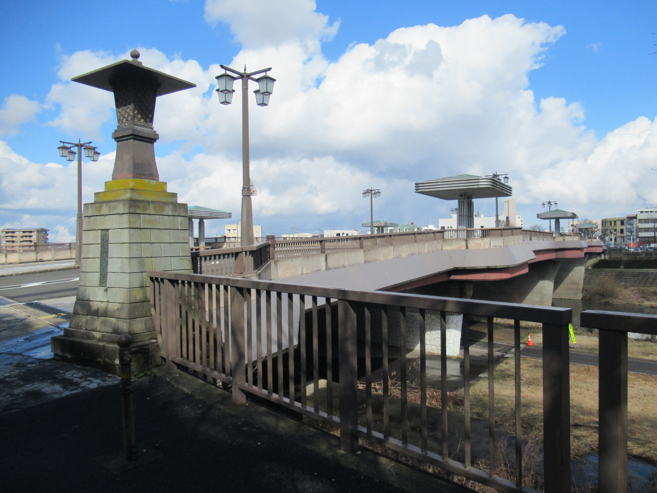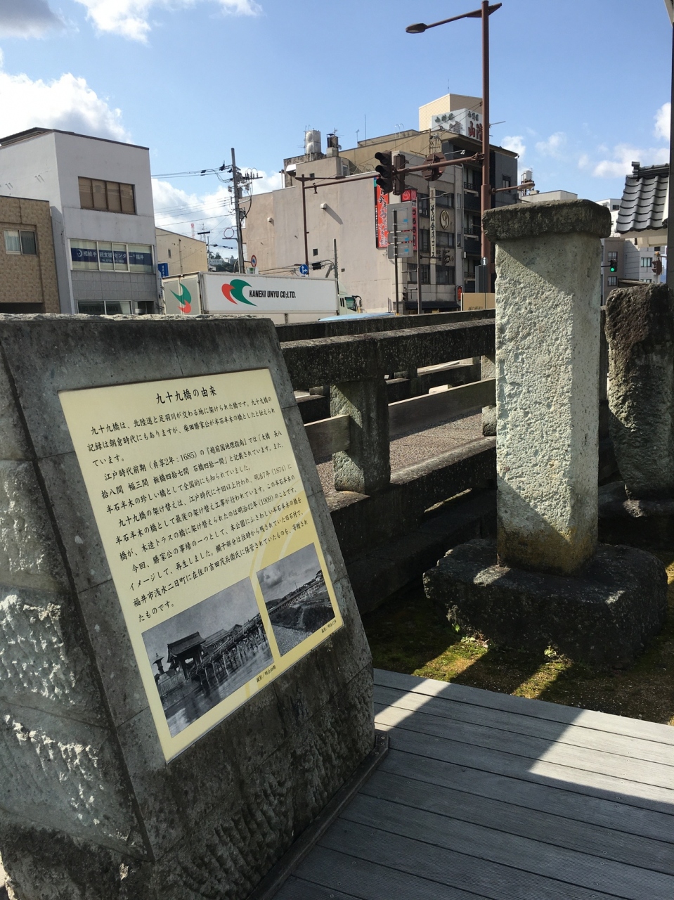この橋から1?程下流に下った北の庄城址柴田公園に九十九橋の半木半石の橋がこじんまりと復元されています。石の部分は福井名産の笏谷石で、欄干部分は実際に九十九橋に使われていた欄干だそうです。これは個人が保管していたものを復元に伴い寄贈していただいたとか。