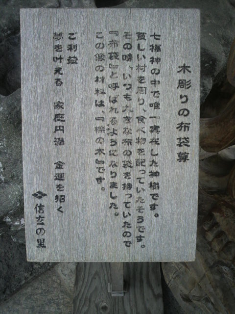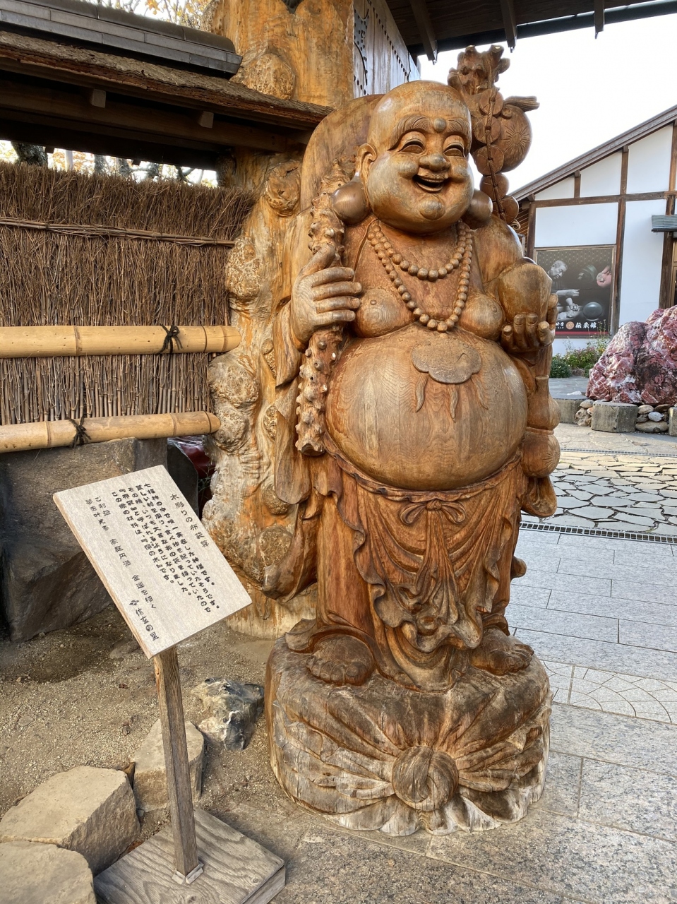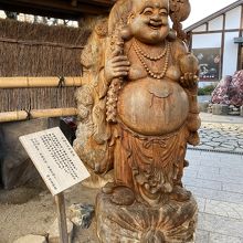 宝石庭園の入口には、大きな櫟の一本彫りの木彫りの布袋様の像が置かれていて、宝石庭園の赤い宝石とともに、入場者を迎えてくれます。