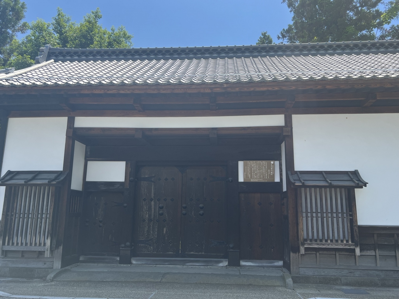 長屋門は、間口13.19メートル、奥行3.72メートル、高さ6.83メートルで、屋根は入母屋造の瓦葺です。門の両側に武者窓を備えた同心部屋を配しています。城門の様な格式のある門ですね。