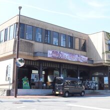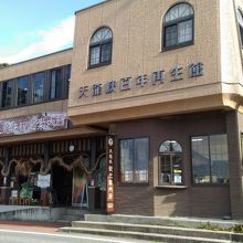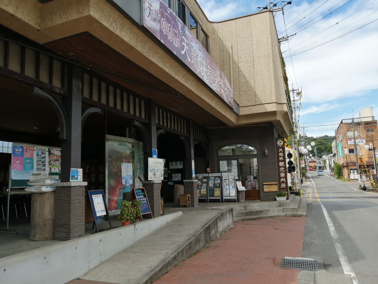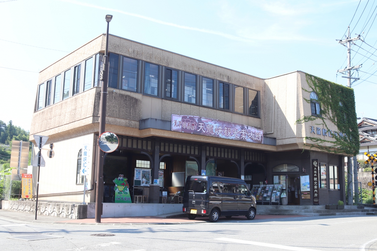 観光案内所が併設された施設。レトロな建物内では、天龍峡の100年の歴史がパネルや写真で紹介されています。