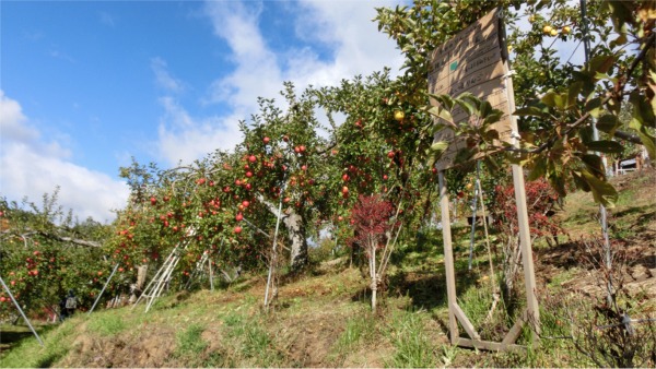 リンゴ園は、斜面の段々になった場所にありますので、少し坂道を登らないとりんごの木のところまでは行かれません。