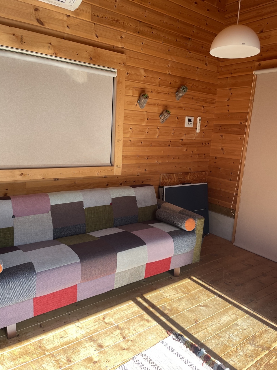 部屋は一階にベットが2つある部屋が独立してあるのと2階には10人くらい寝れるフローリングの部屋があります。とってもひろいです。残念ながらスリッパがないので、持参してください。リビングにはキッチンがありまずまず大きな冷蔵庫もあります。電子レンジ、電気ポット、炊飯器、オーブントースト、食器、コップ、グラス、はし、スプーン、とたいていのものはありますが、やかんはありませんでした。9月におとずれたのですが、標高がたかくないので、気候・気温も一緒で、夜も半袖で就寝できるくらいです。