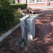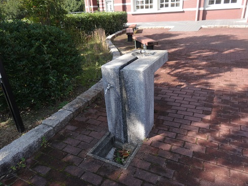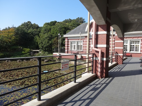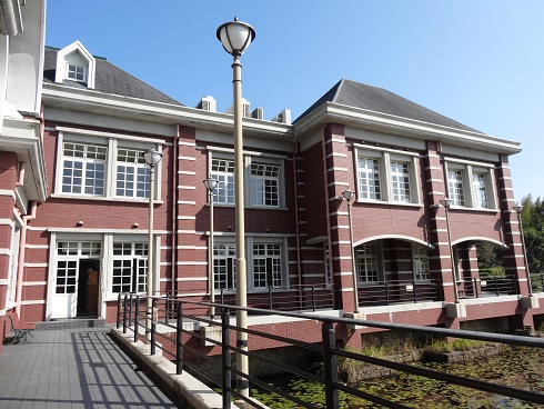 建物が素敵な図書館、前には大きな池があります