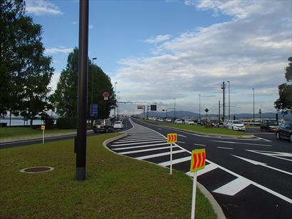 滋賀県の政治・経済・文化の中心地である大津市と、産業経済の発展著しい湖南・湖東を結ぶ幹線道路である国道1号のバイパスとして昭和49年9月に上下二車線開通。交通量のの増加に対処するため、平成7年4月、四車線共用されました。曲線を描く優美な姿と周辺を彩るケヤキやクスノキなどの緑が美しい景観をなしています。