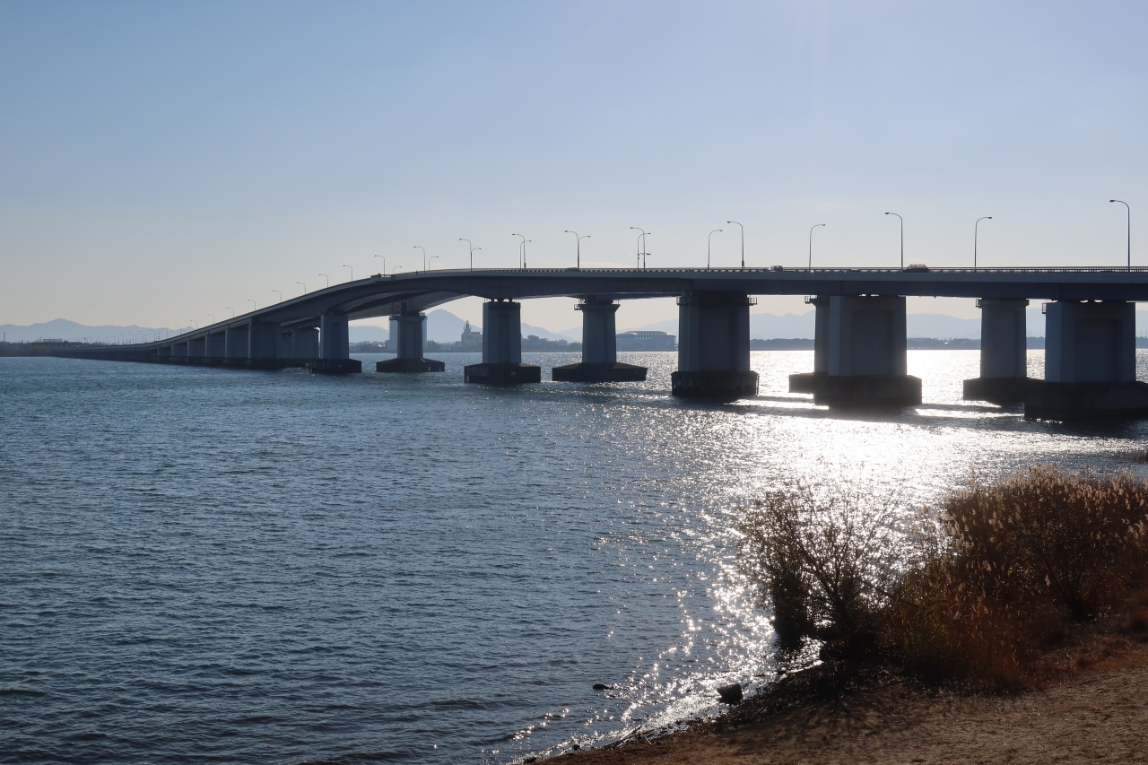 ... 続きを読む全長は1,350m(反対車線は1,400m)最高部は26.3m、橋脚の最も開いている場所は幅140mあり、湖内に浮かぶ大型船でも通行可能となっています