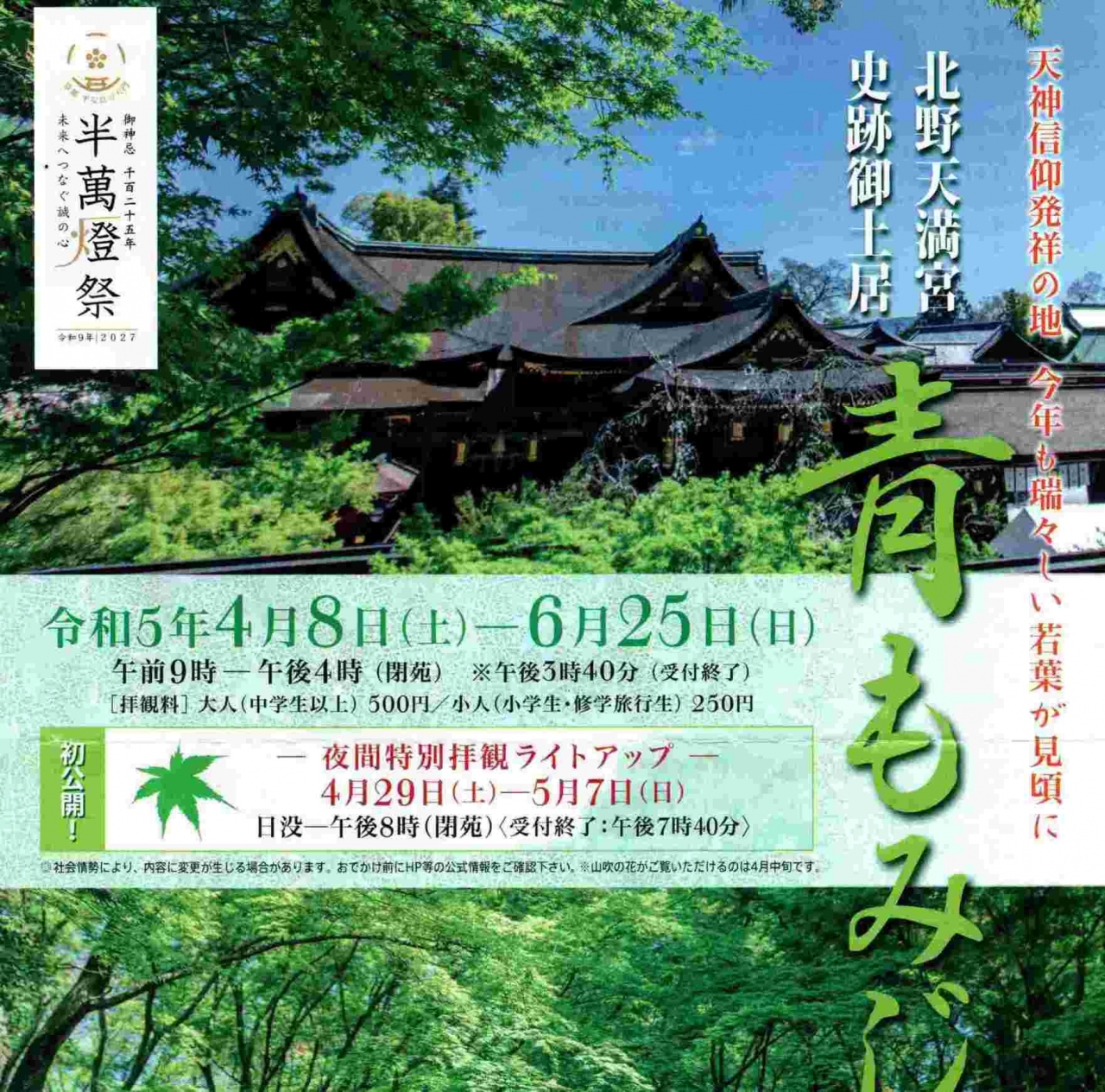 「北野天満宮」は菅原道真公をまつり「学問の神様」として知られていますが、もうひとつお薦めの場所が「史跡御土居」です。境内の... 続きを読む西側にある御土居は天正19年(1591)に豊臣秀吉が洛中洛外の境界として築いた土塁の一部で現在も自然林が残り四季折々の美しさを感じることができます。特に紅葉が有名なのですが現在は新緑の美しい「青もみじ」を見ることができ、夜間はライトアップで幻想的な姿も見ることができます。期間限定になっていますので注意くださいね。期間は写真をご確認ください。 閉じる