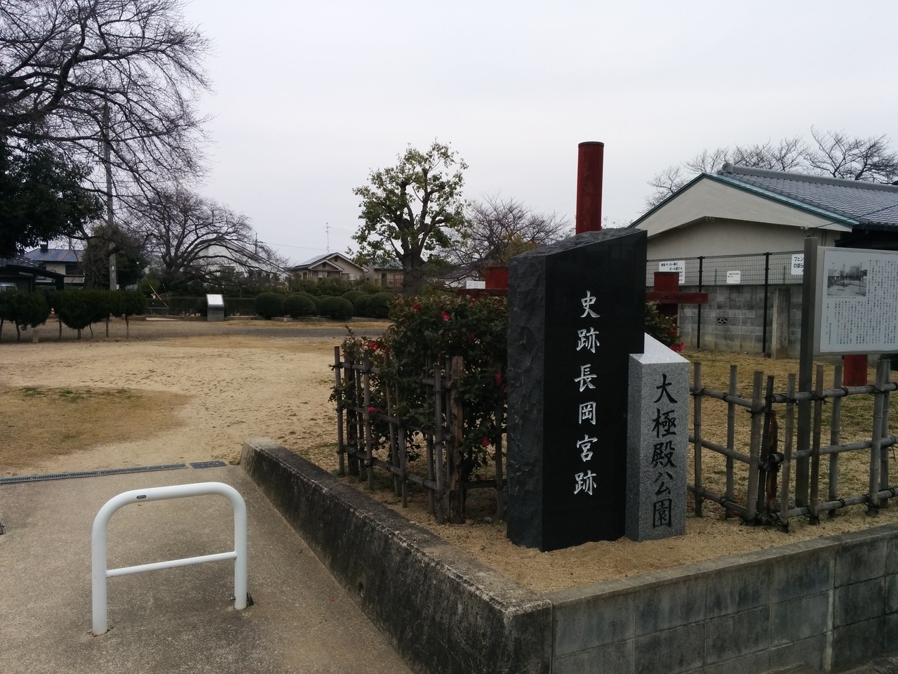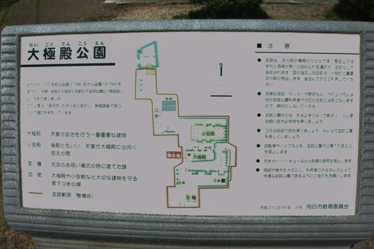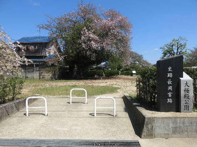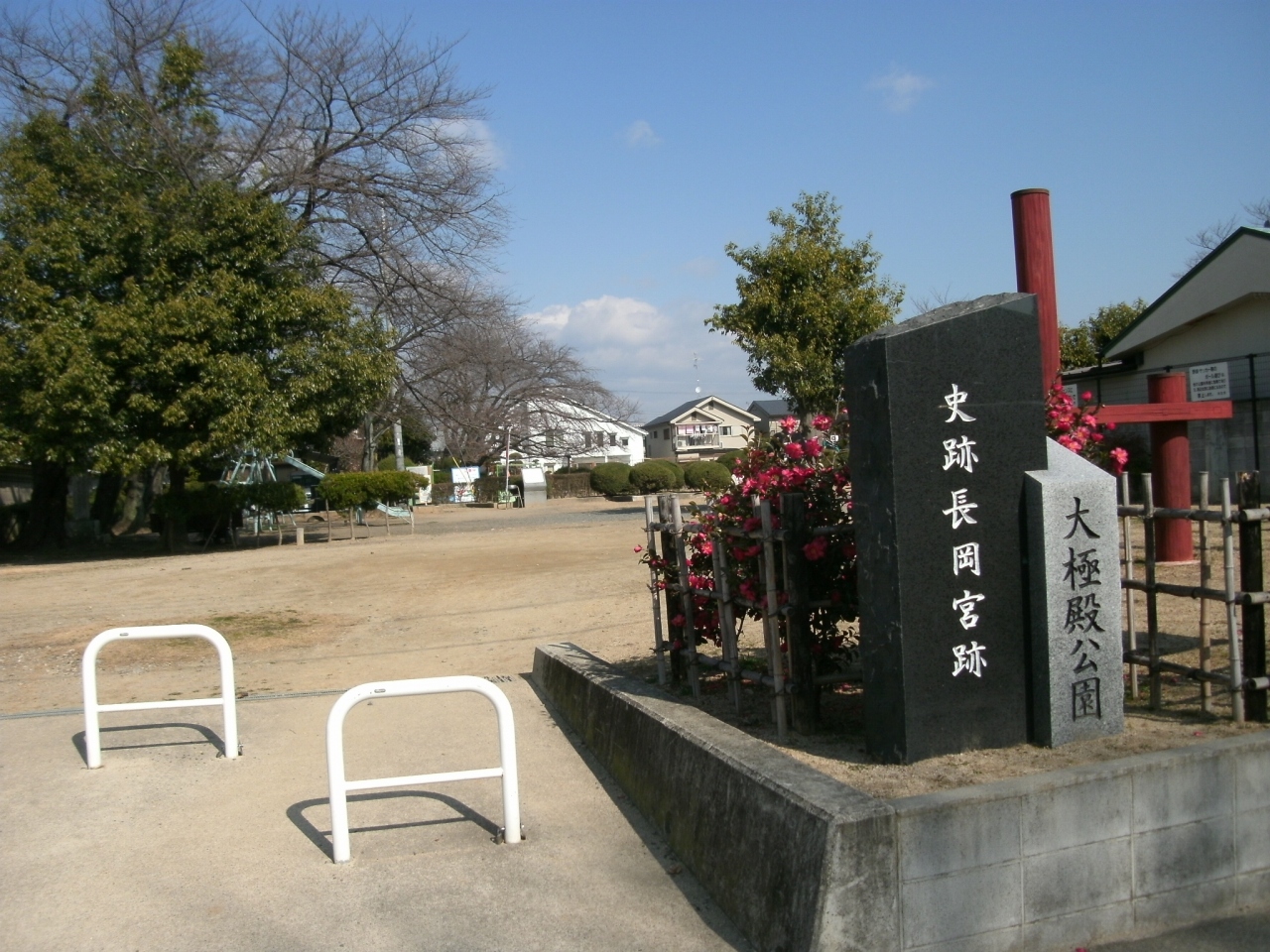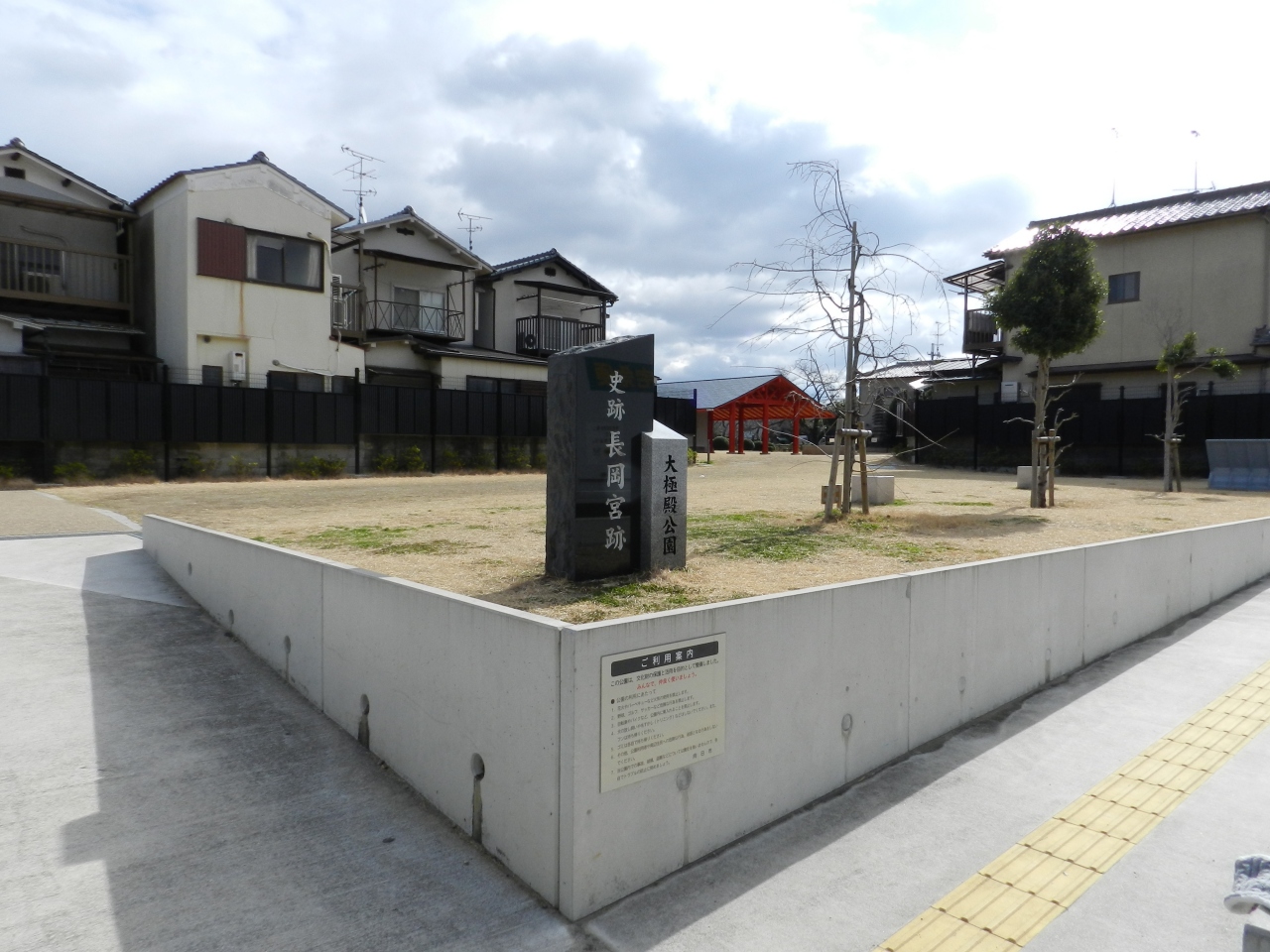延暦3年(784)から10年間にわたって都がおかれた長岡京の大内裏跡。昭和29年(1954)、大極殿跡を中心に発掘調査がはじめられ、発掘された木簡などの遺物は向日市文化資料館に展示されている。大極殿跡は昭和40年(1965)、史跡公園に指定され、道路を隔てて南北に分けられた公園は南側に大極殿、北側に小安殿が整備・復元されている。平成19年(2007)には、日本の歴史公園100選に選定されている。