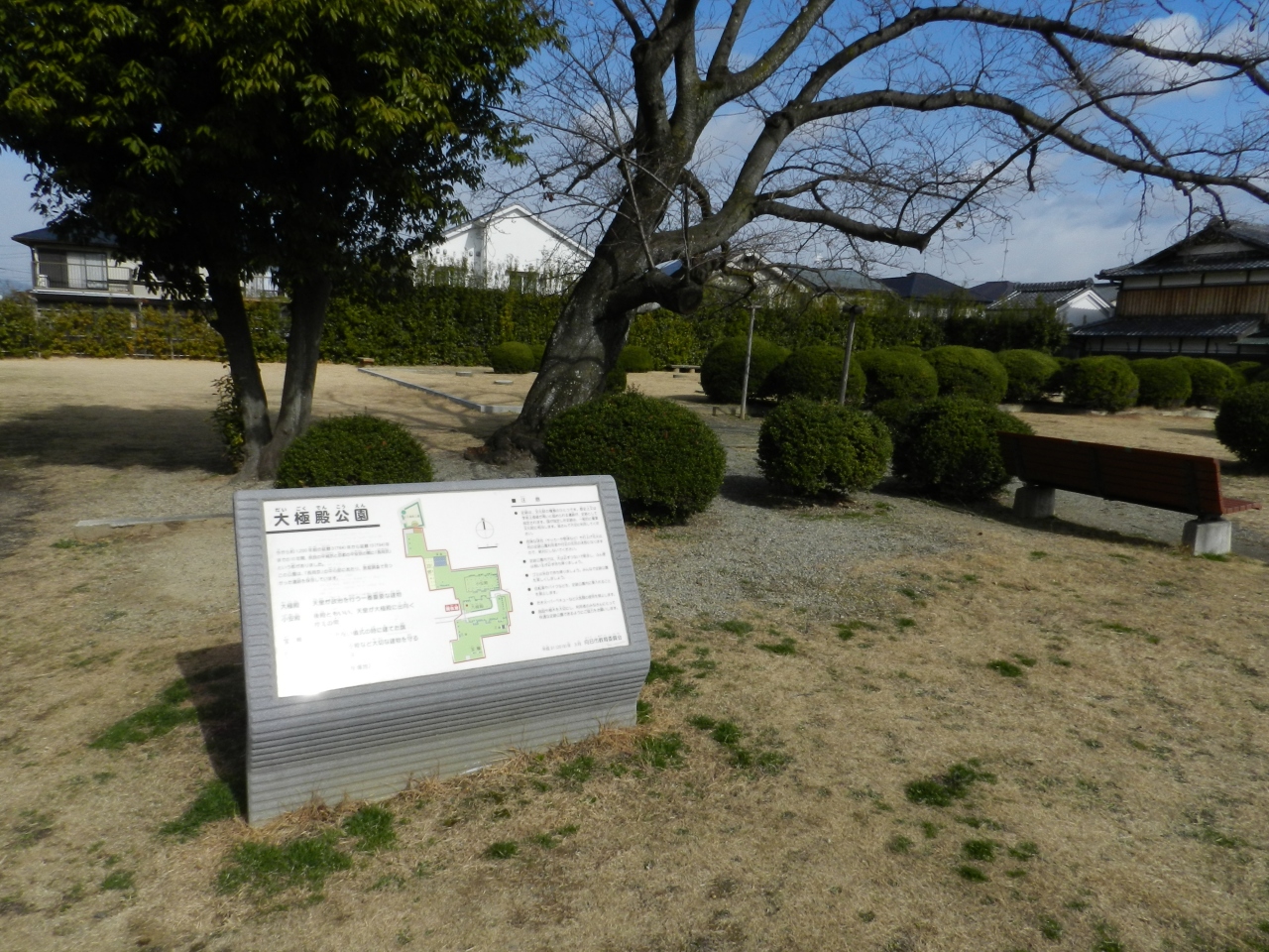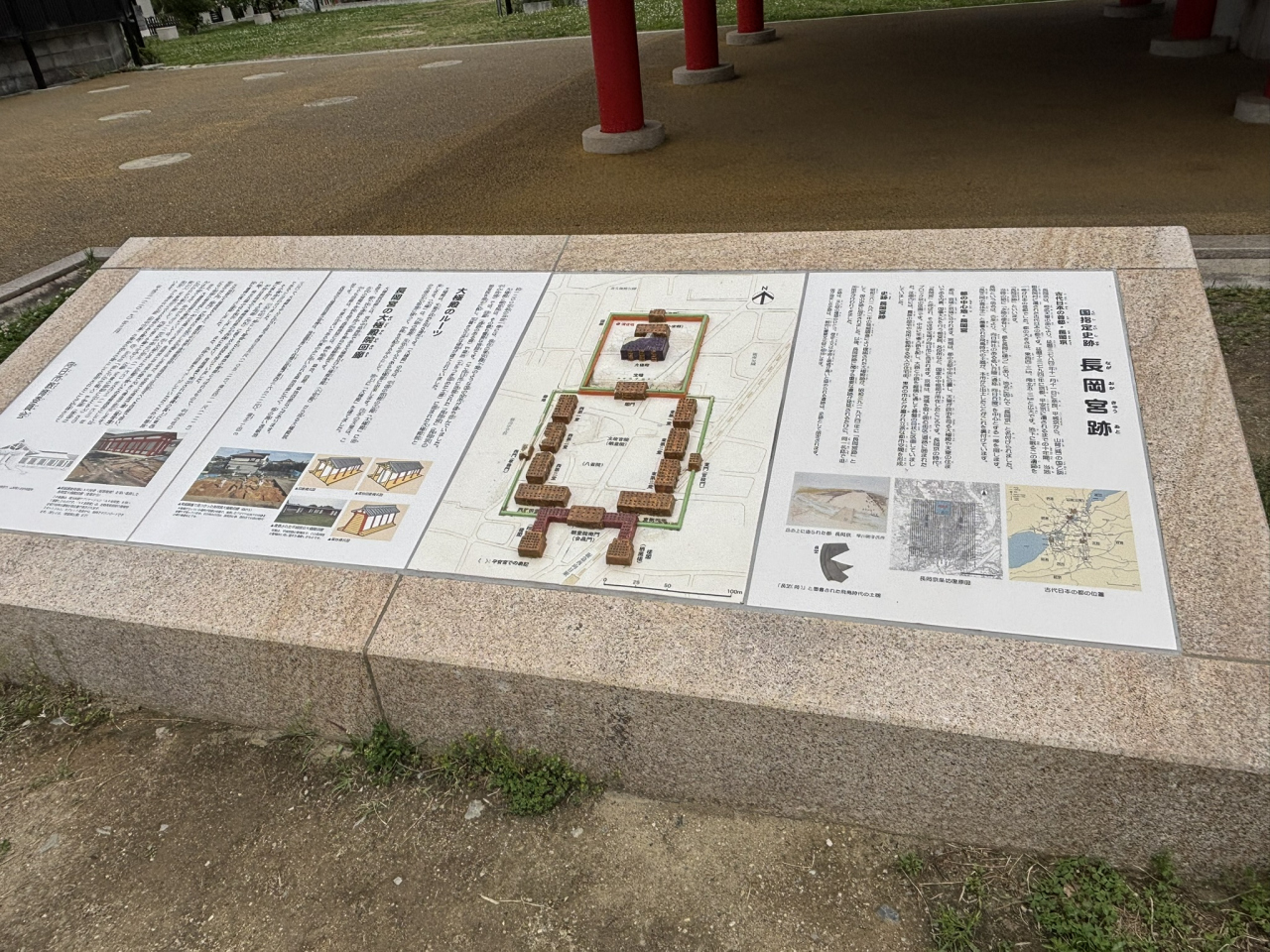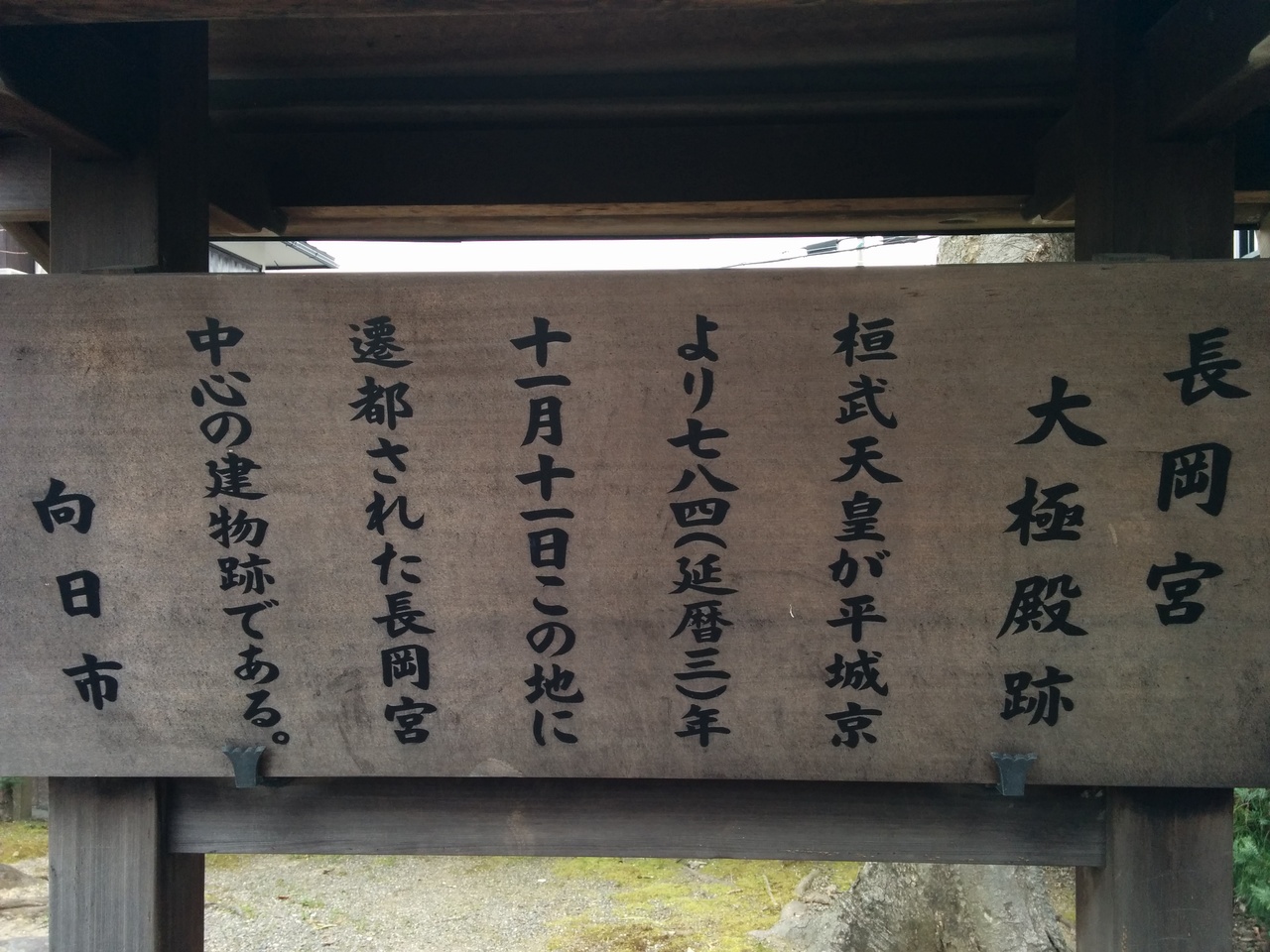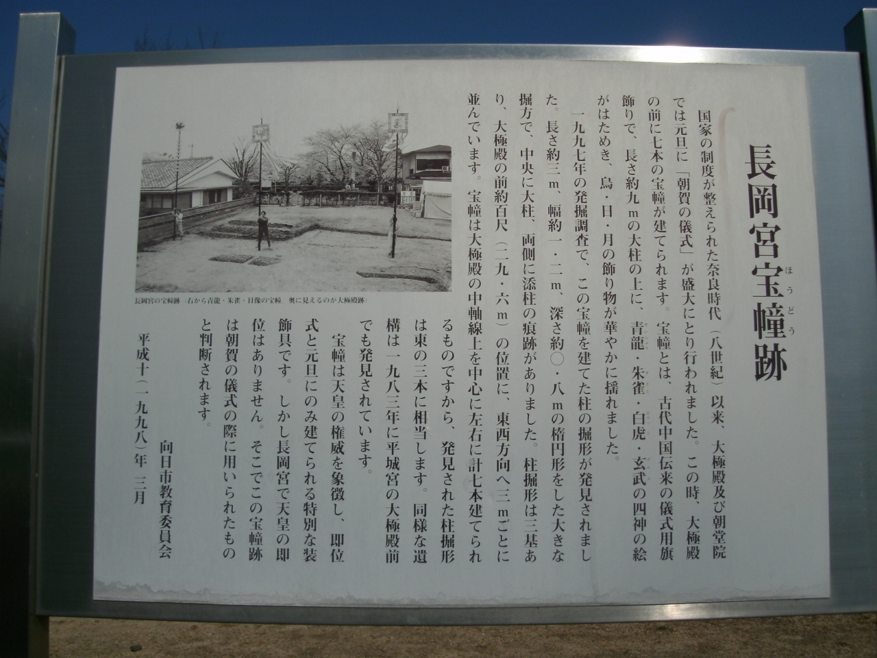 延暦3年(784)から10年間にわたって都がおかれた長岡京の大内裏跡。昭和29年(1954)、大極殿跡を中心に発掘調査がはじめられ、発掘された木簡などの遺物は向日市文化資料館に展示されている。大極殿跡は昭和40年(1965)、史跡公園に指定され、道路を隔てて南北に分けられた公園は南側に大極殿、北側に小安殿が整備・復元されている。平成19年(2007)には、日本の歴史公園100選に選定されている。
