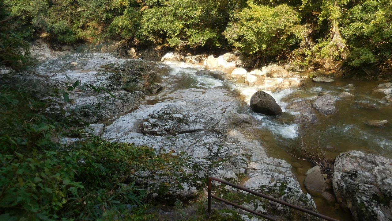 白く輝く岩盤川床の甌穴群