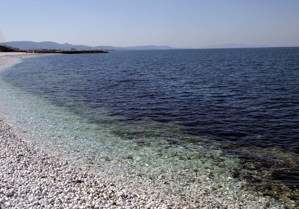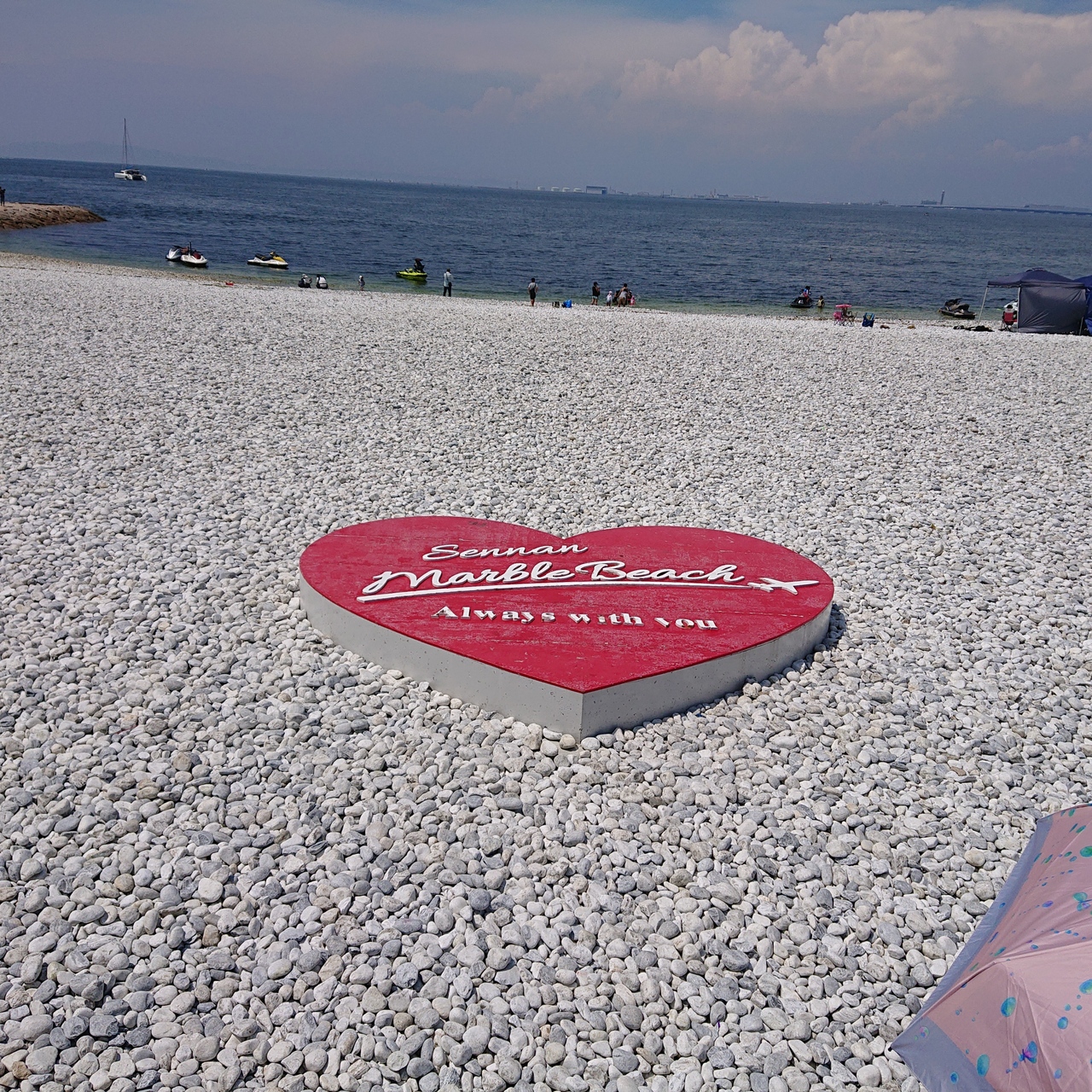 白砂青松をイメージした松と白い大理石の玉石を敷き詰めた真っ白なロングビーチ。関西空港を望みながらの夕景が最高のスポット。 マーブルビーチは、りんくうタウンの海岸線に沿って、泉佐野市、田尻町、泉南市の二市一町にまたがる白い大理石の人工渚。泉佐野市・田尻町のビーチは、背後に青い松林が続くおよそ900mの海岸で、夏になると、駐車場は連日満員になるほどデートにも人気な場所。泉南市のビーチは、関空島を背景としたロマンチックな景観から「恋人の聖地」に認定され、”Sennan Marble Beach”(せんなんマーブルビーチ)と”always with you”(いつもあなたと)の白い文字の浮彫が施されたハート型の大きなモニュメントが設置されている。泉南市のビーチは、隣接するタルイサザンビーチとともに「日本の夕陽百選」に選定された絶景で知られ、カップルや家族連れでにぎわう人気のフォトスポットになっている。