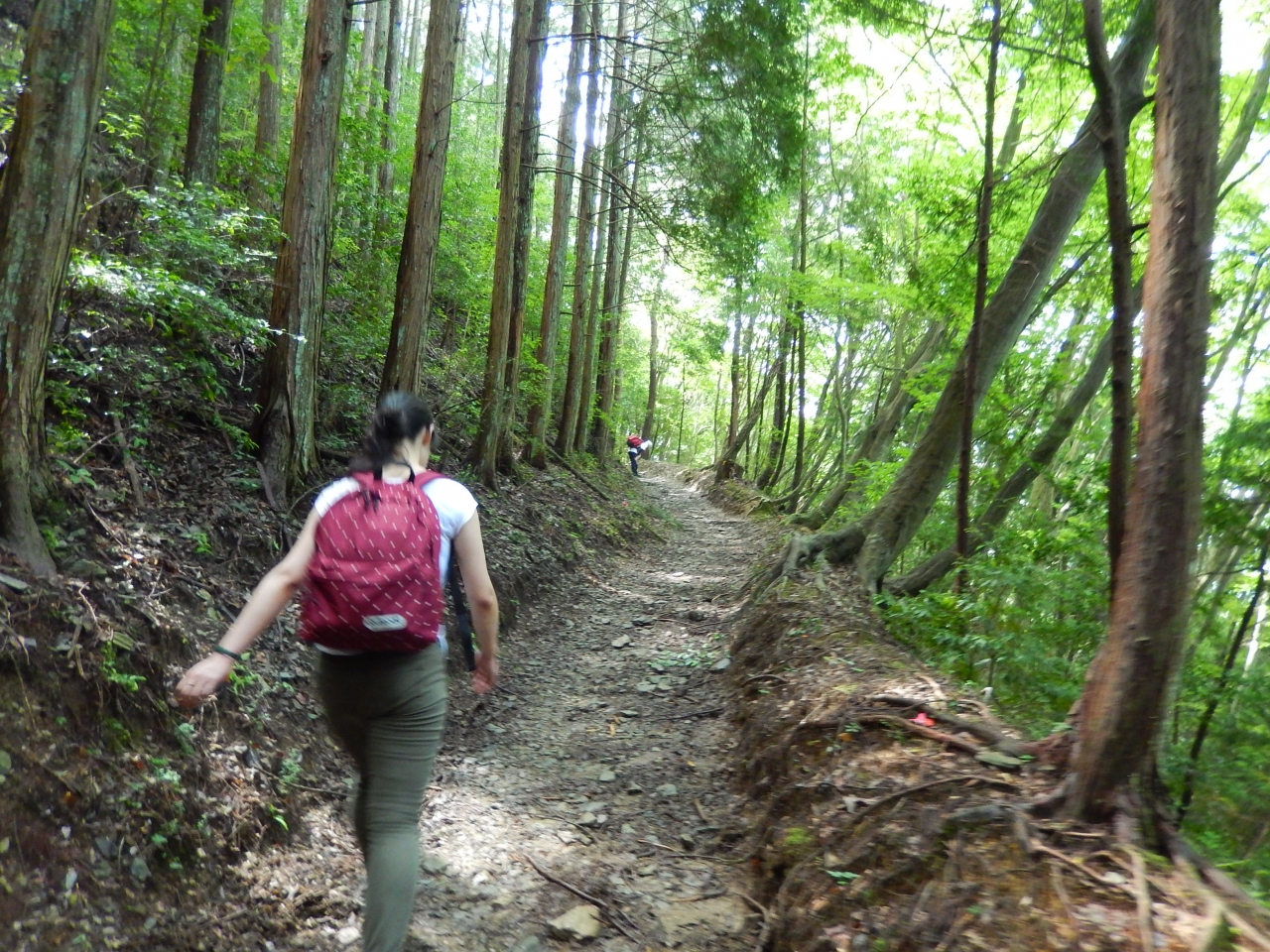 ですが登り切れたのは普段小学生向けのキャンプ体験を指導してらっしゃる方がいたことが大きいです。その方なしでは絶対に不可能でした。登山雑誌などでは初心者でもぎりぎり登れる道として紹介されているようですが、本当にぎりぎりです。(とはいえ、壮年の男性が一人で悠々と私たちを追い越していくことが何度かあったので、慣れている方には本当に易しい道なのでしょう・・・。)本当に傾斜が急なのは最初と最後の一時間なので、それをあらかじめ知って心構えをしておけば幾分楽かもしれません。ちなみに挙げた写真では比較的歩きやすそうな道が映っていますが、これは写真を撮る余裕があったのが楽な道の時だけだったからです・・・。