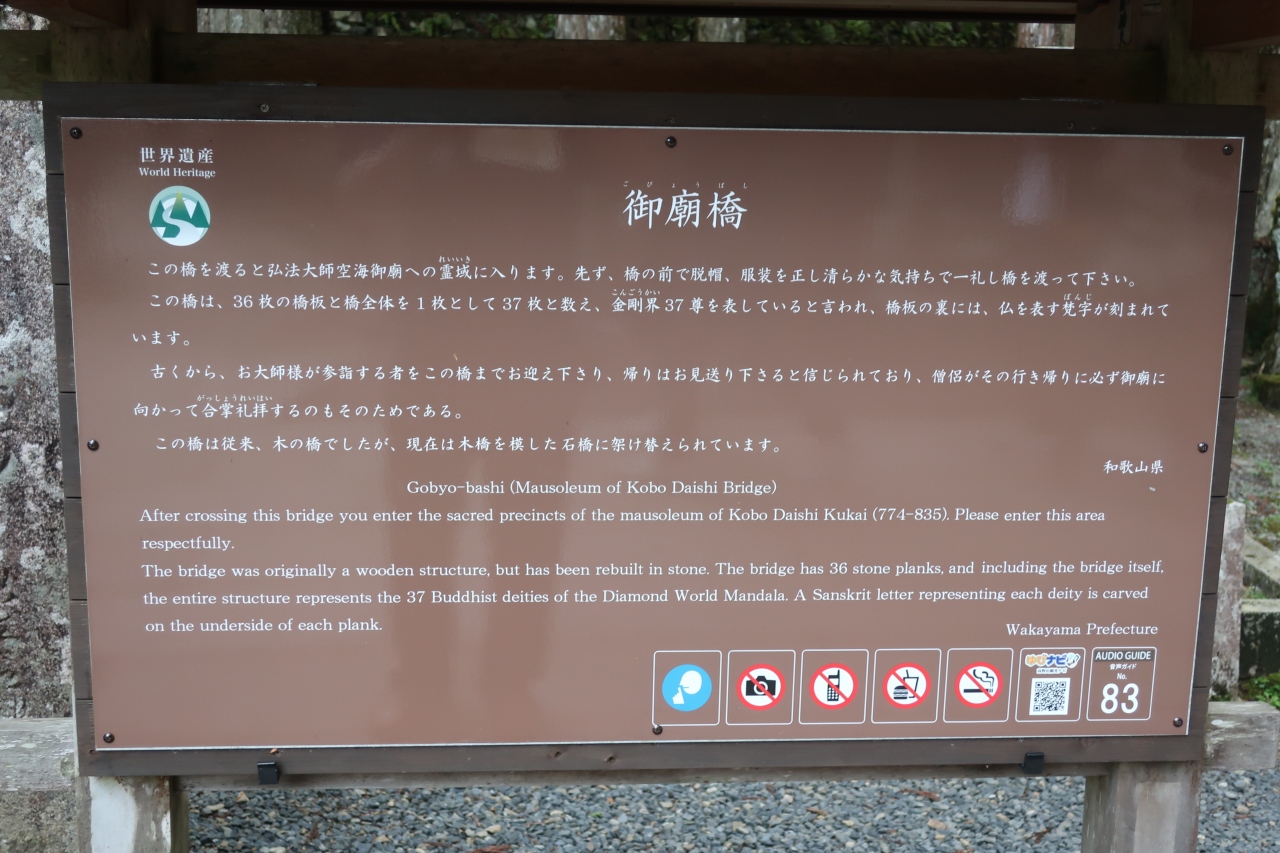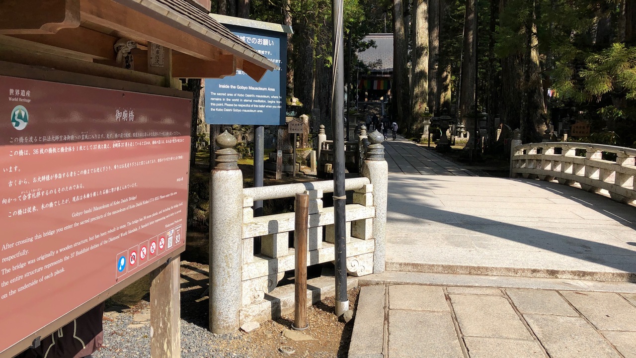『御廟橋』は、真言宗の開祖である平安時代・初期の僧「空海(諡号:弘法大師)」上人が中国王朝「唐」の都「長安(現:陝西省西安... 続きを読む市)」の「青龍寺」において学んだ「密教」の教えを基盤に大成した「真言密教」における修禅の根本道場として開創した「高野山」の地で、「真言密教」の悟りを得るための修行の場として「高野山・奥之院」の巌窟に入定し、現在も禅定(永遠の瞑想)し続けていると伝わる日本仏教の神聖な霊域とされる「弘法大師御廟」に通じる石橋として霊域との境界を流れる清流「玉川」に架けられており、『御廟橋』から先の霊域エリアとなる「弘法大師御廟」は撮影禁止となっています。