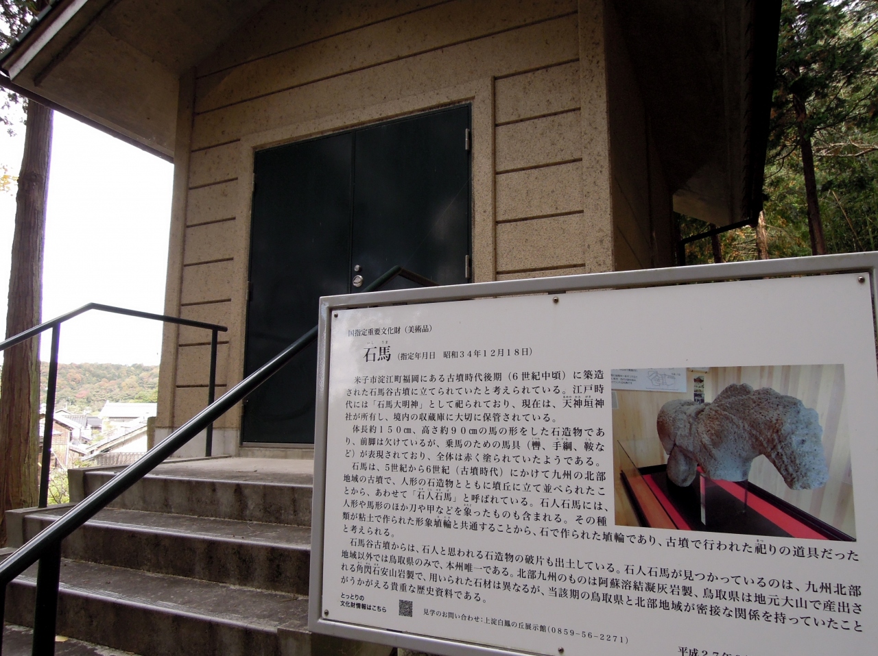 古墳から出土した巨大な埴輪のような石像で、本州ではこの石馬しか出土例が確認されていない不思議な埋蔵文化財だ。以前は近くの... 続きを読む展示館に飾られており観賞可能だったが、現在は天神垣神社(米子市淀江町福岡)の収蔵庫に保管されている。この神社のすぐ近くには上淀廃寺跡があるほか、大型古墳も点在している。古代、この辺りの墓制や祭事が独特だったことがうかがえるようだ。 閉じる