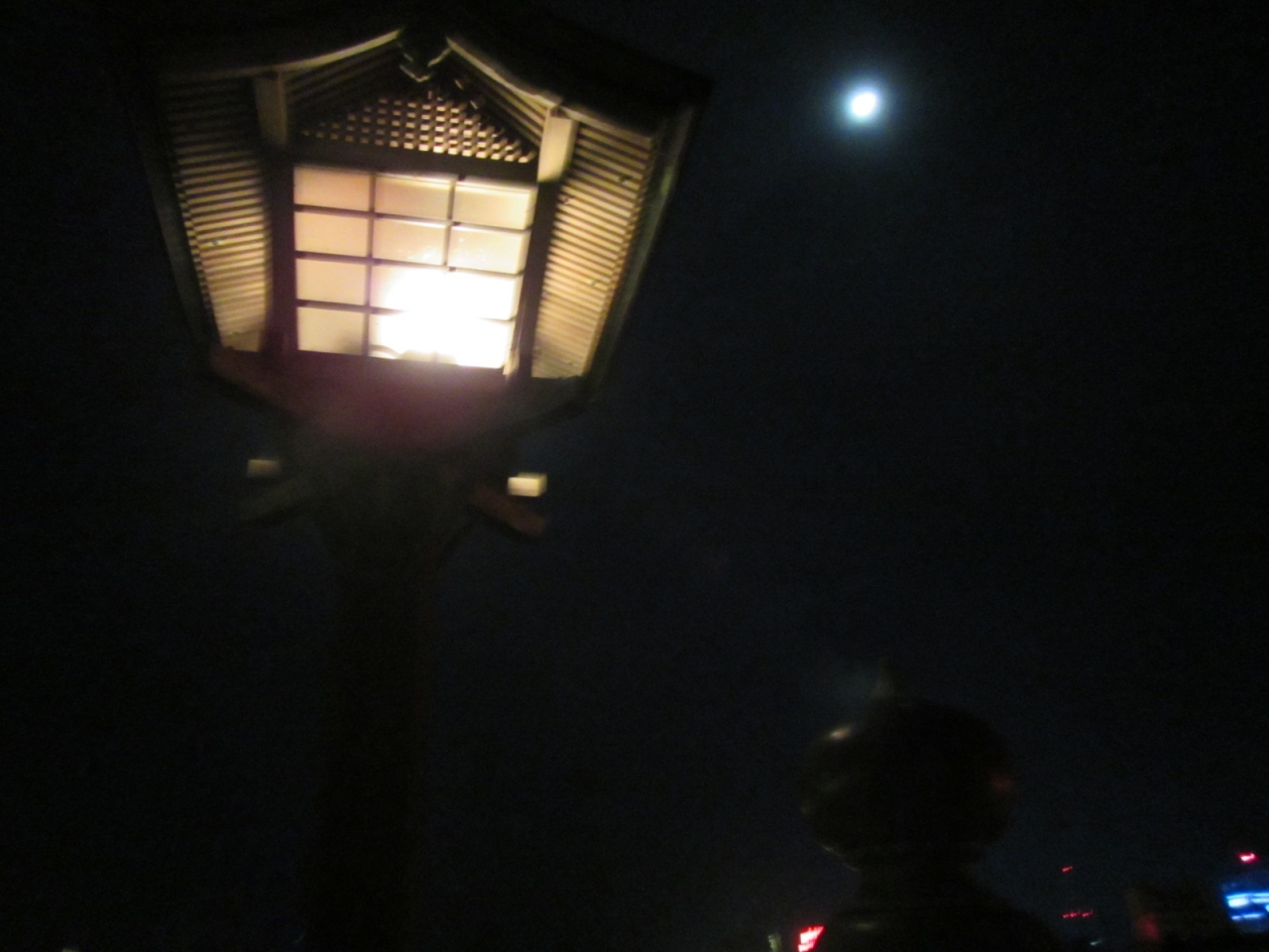 松江大橋の照明、対岸の夜景、柳の並木、満月が水面を照らす風情が楽しめました。