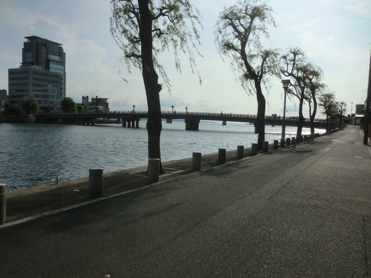 橋の北詰を少し行くと、飲食店やお土産屋などが点在する京店通り、カラコロ広場があって、京橋川沿いの風情が楽しめますが、松江大橋北詰からも柳の並木が植わる川沿いの道が続いていて、大橋川沿いの風情が楽しめます。