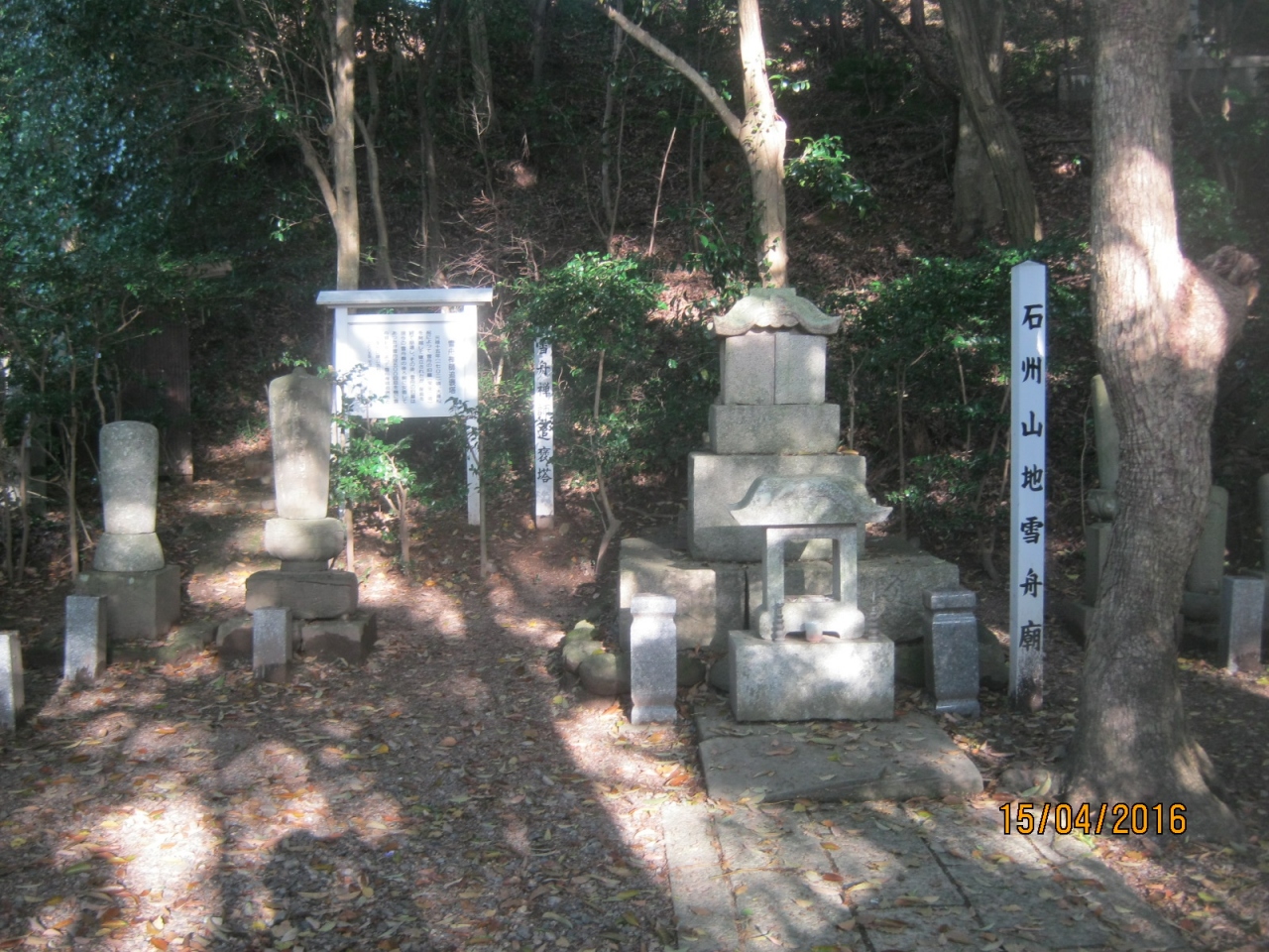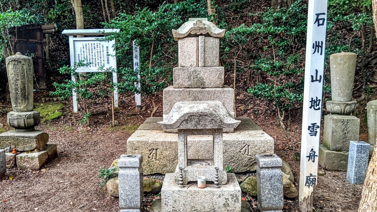 益田の大喜庵に雪舟の墓がありました。雪舟のお墓とされるところは何ヶ所かありますが、ここは1番有力とされるところです。大喜庵... 続きを読むの歴代の住職のお墓が並ぶ一画にありました。2段の墓石の上に扉の付いた小さな祠が乗っていました。雪舟はここにあった、当時の益田氏の菩提寺・東光寺で1506年(永正3年)に亡くなったとされています。当時としてはたいへん長寿で86歳だったとのことです。医光寺で火葬され、遺骨は東光寺に埋葬され宝篋印塔が建てられたとのことです。東光寺は焼失してしまい、益田氏も須佐に移ってしまって衰退し、その地に大喜庵という庵が結ばれたのは、雪舟200回忌を契機として、1702年(元禄15年)のことです。そして、1754年(宝暦4年)には、宝篋印塔の痛みが激しくなったので、地元の人々の手で現在のお墓に直されたそうです。小さな祠の中には宝篋印塔の1番上の相輪が収められているそうです。