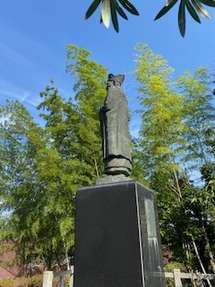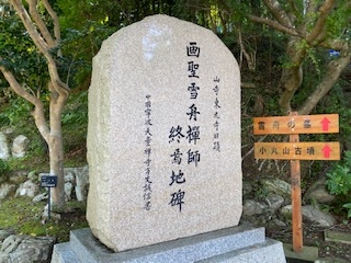 墓所への入口に「画聖雪舟禅師終焉地碑」と刻まれた石碑がありました。これも没後500年記念事業として、2005年(平成17年)に建立されたものだそうです。良く見ると、中国寧波天童禅寺方丈誠信書と刻まれていました。雪舟が中国の明に渡った時に、禅の修行をした天童寺の163世住職の誠信さんの揮毫なのですね。益田市と中国寧波市とは雪舟の縁で姉妹都市だそうです。