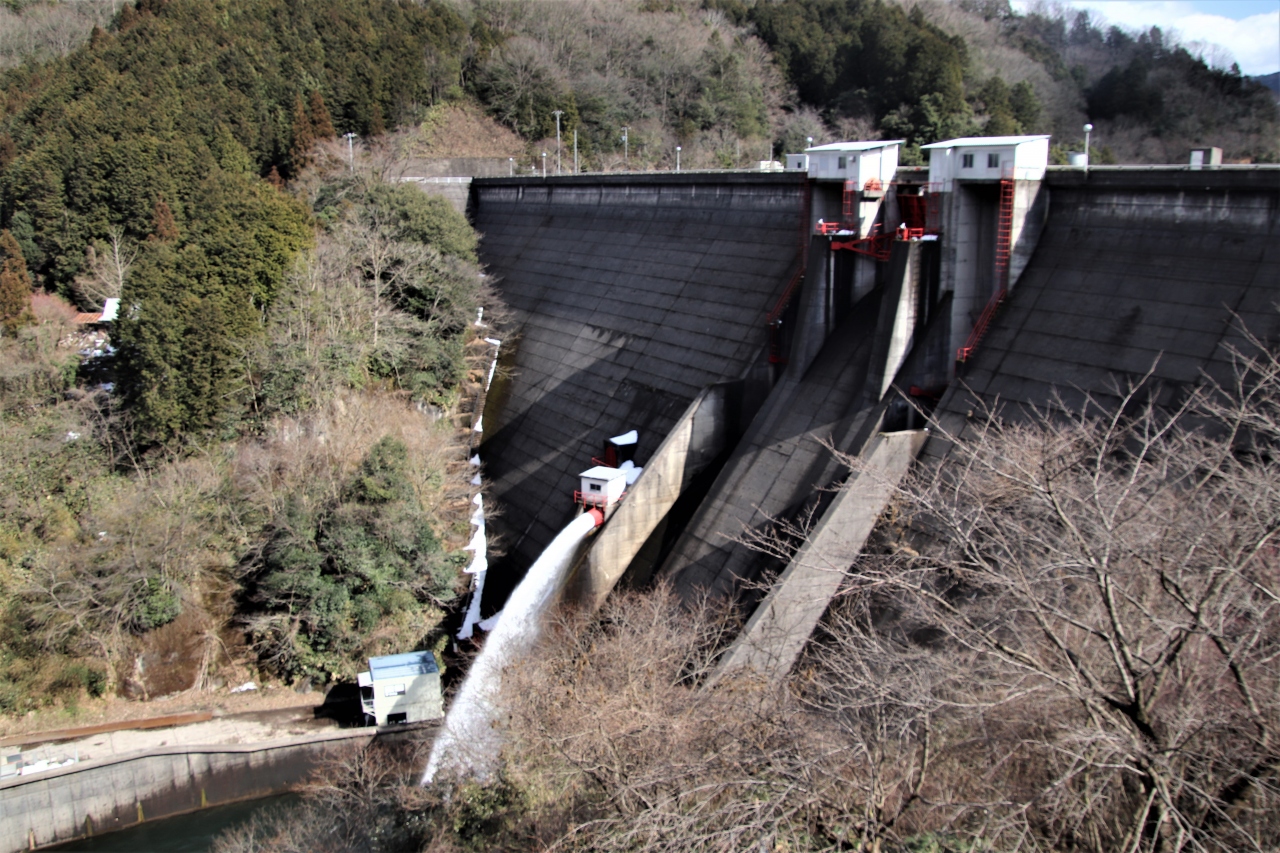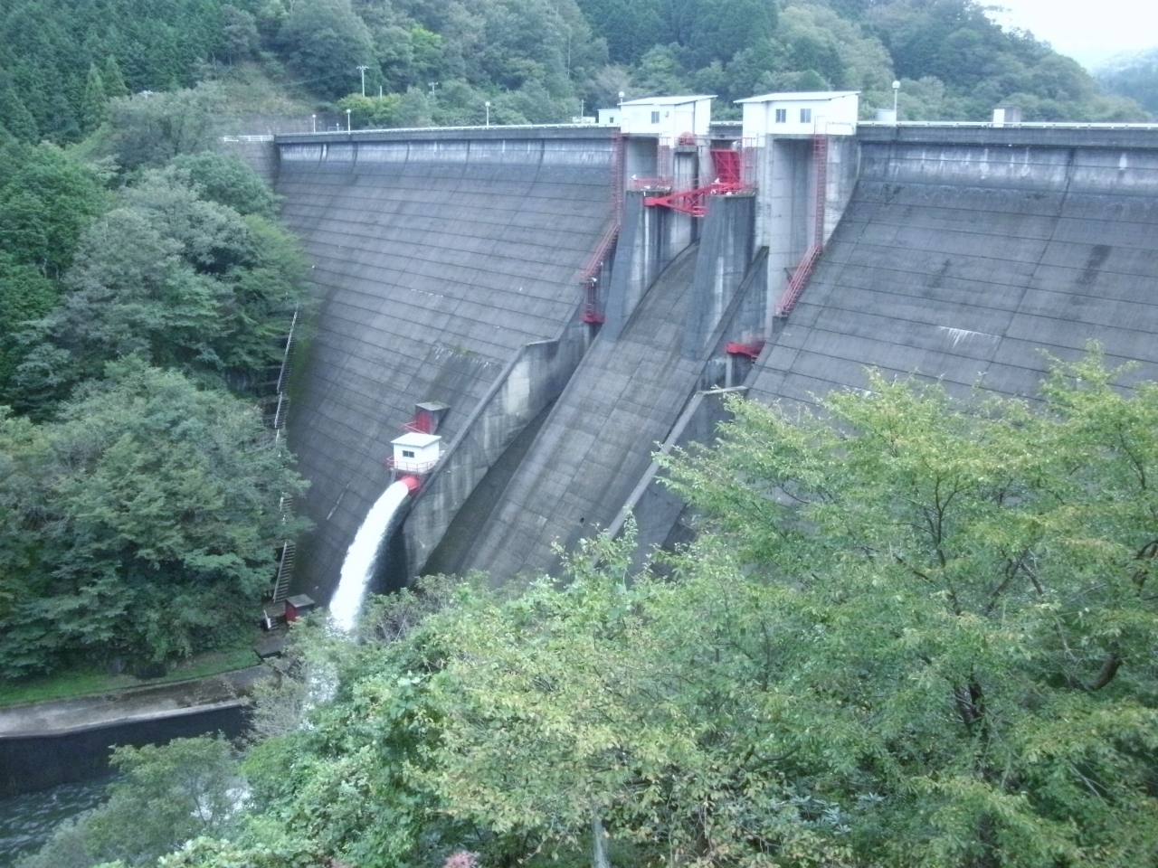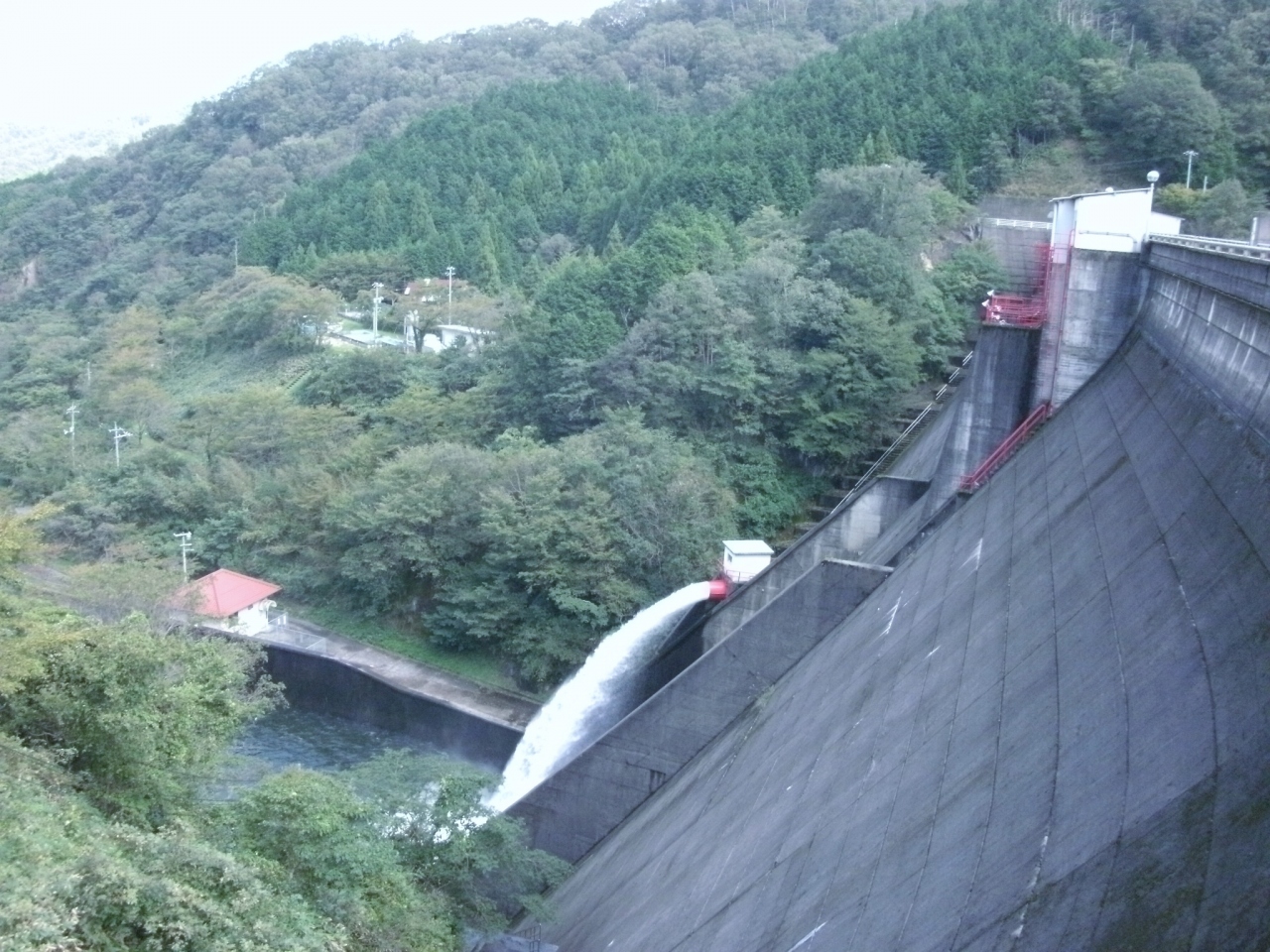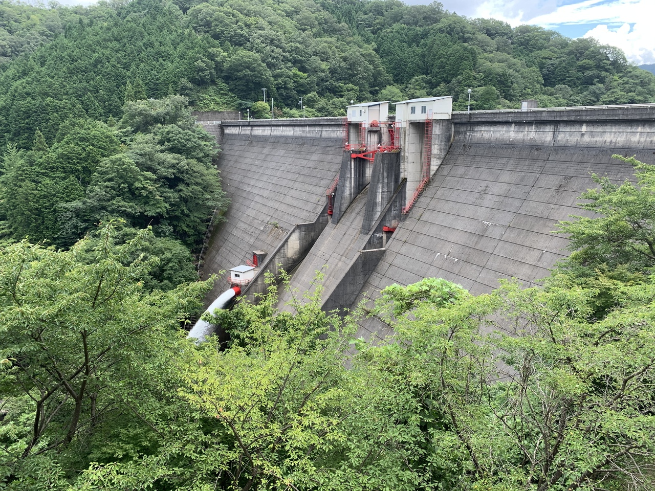 洪水調節、上水道・工業用水、発電を目的とした堤高55.9m、堤頂長190mmの重力式コンクリートダムです。訪れたときは、水... 続きを読む量がかなりあり、堤体下流面中段に設けられたバルブから導流壁を跳び越して放流する豪快なシーンを見ることができてとてもよかったです。