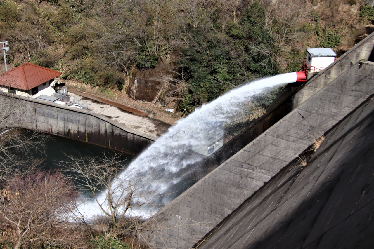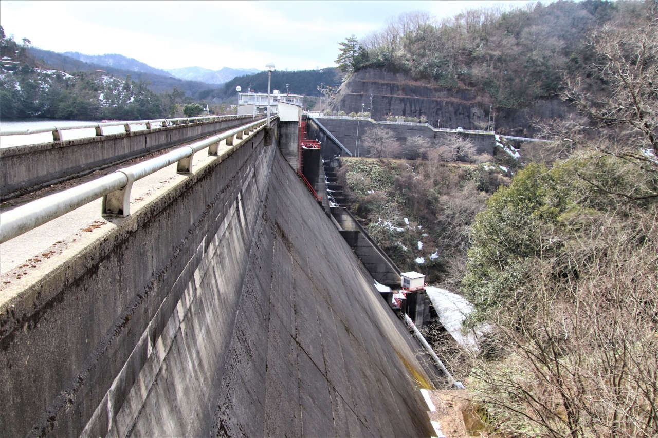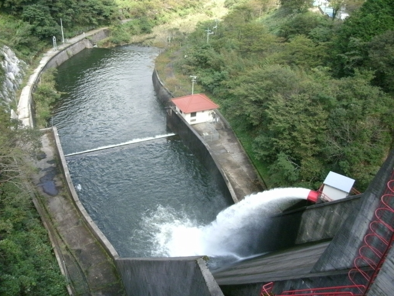 洪水調節、上水道・工業用水、発電を目的とした堤高55.9m、堤頂長190mmの重力式コンクリートダムです。訪れたときは、水... 続きを読む量がかなりあり、堤体下流面中段に設けられたバルブから導流壁を跳び越して放流する豪快なシーンを見ることができてとてもよかったです。