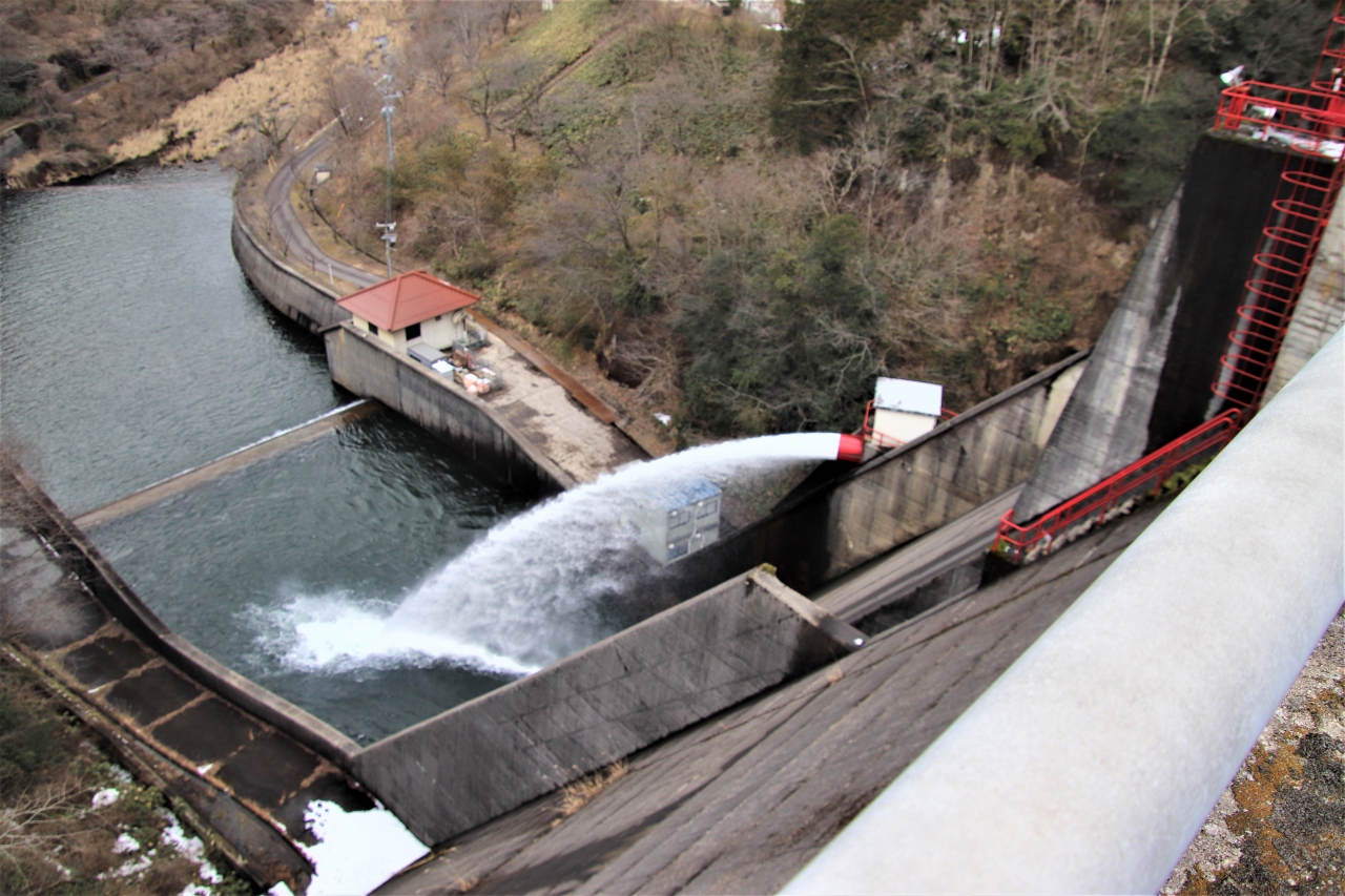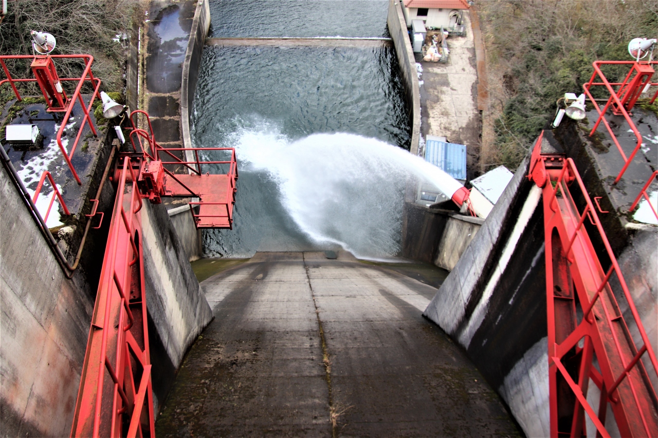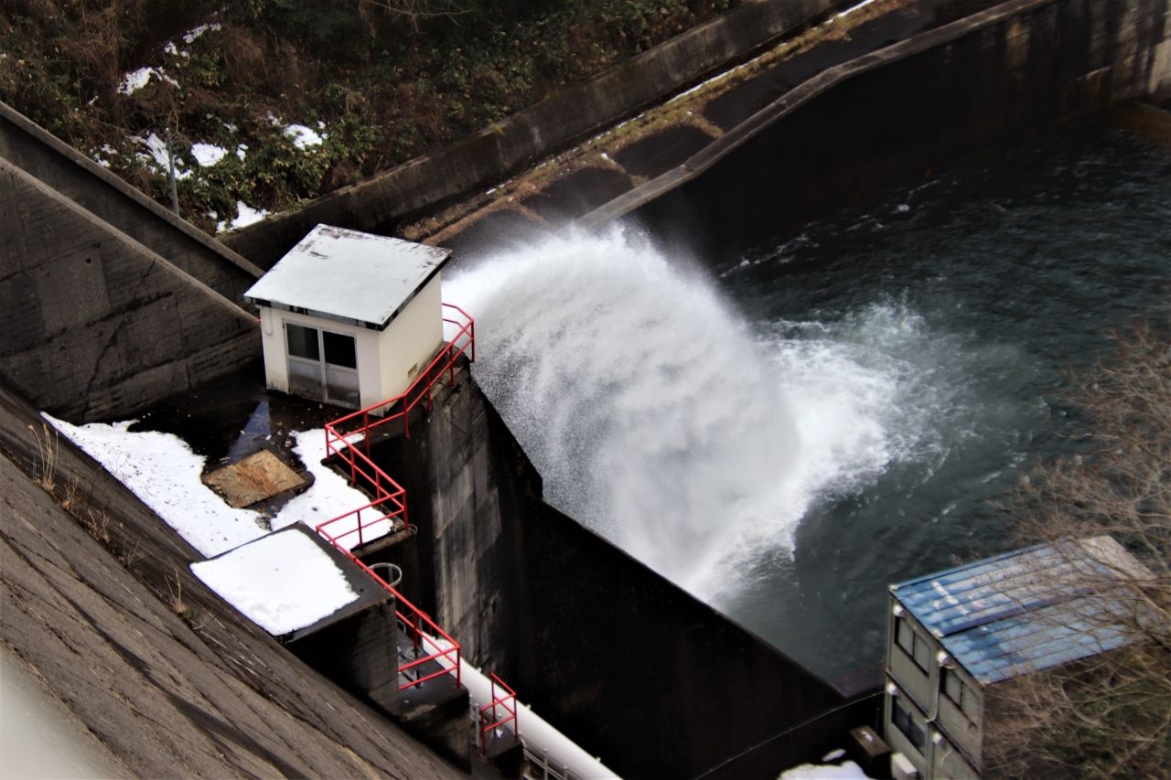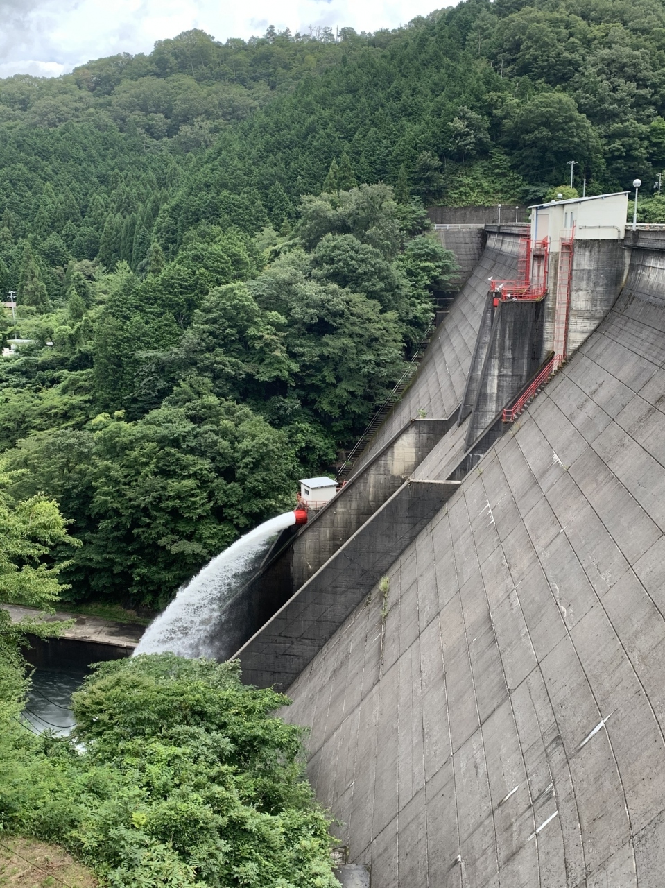 洪水調節、上水道・工業用水、発電を目的とした堤高55.9m、堤頂長190mmの重力式コンクリートダムです。訪れたときは、水... 続きを読む量がかなりあり、堤体下流面中段に設けられたバルブから導流壁を跳び越して放流する豪快なシーンを見ることができてとてもよかったです。