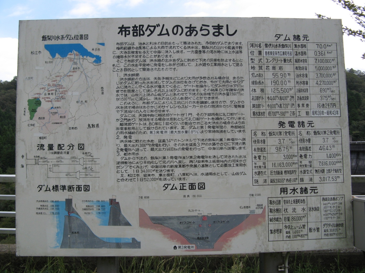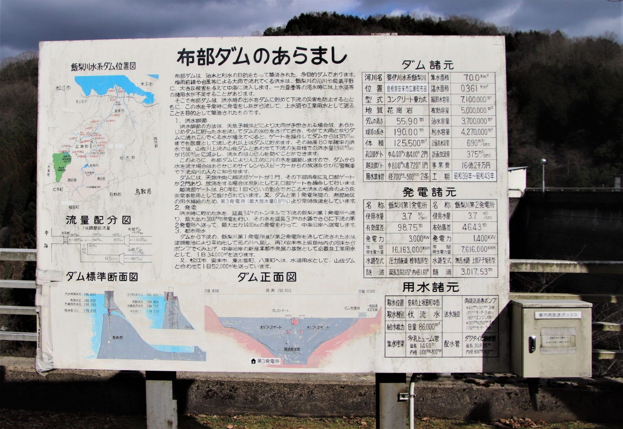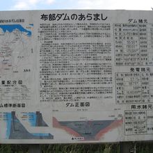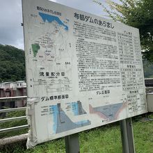 ダムサイト左岸に管理所や駐車場があり、ダムの構造や仕様を示す説明板があります。