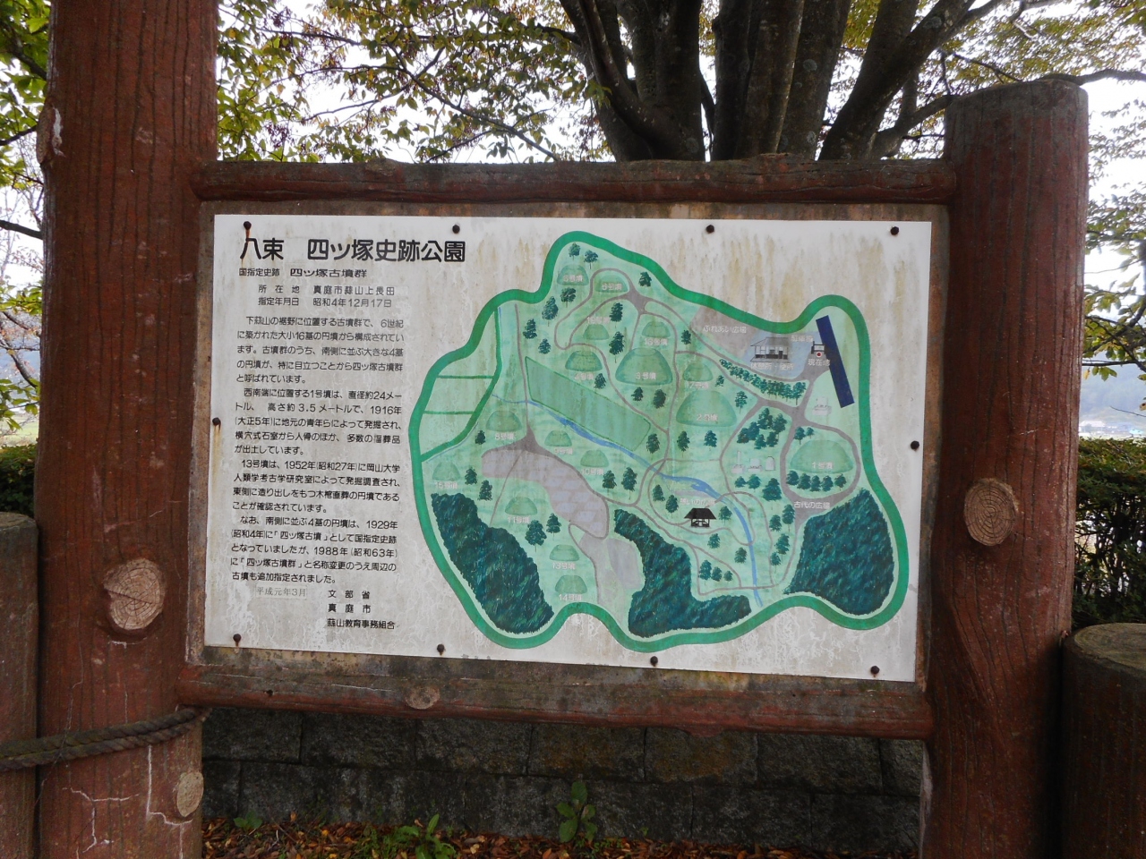 四つ塚古墳群は、中国山地に囲まれた蒜山盆地の旭川左岸域の段丘上に築かれた、大小16基から成る古墳群です。古墳時代後期の紀元500年ころ、19基の古墳が次々と築かれましたが、現存するのは16基で、中でも古墳群の南側に東西方向に横一列に並んだ4基の古墳が特に大形で目立つことから、古くから「四つ塚さま」と呼ばれて地元の人に親しまれてきました。 蒜山盆地には全部で170余りの古墳がありますが、その中でも四つ塚古墳群は最大の規模を誇り、山間盆地の古墳群としてはまれに見る雄大な規模の一大古墳群として考古学上でも注目を集め、国指定史跡に認められました。現在は「四つ塚史跡公園」として古墳を散策する遊歩道をはじめ広場や休憩所などが整備されています。
