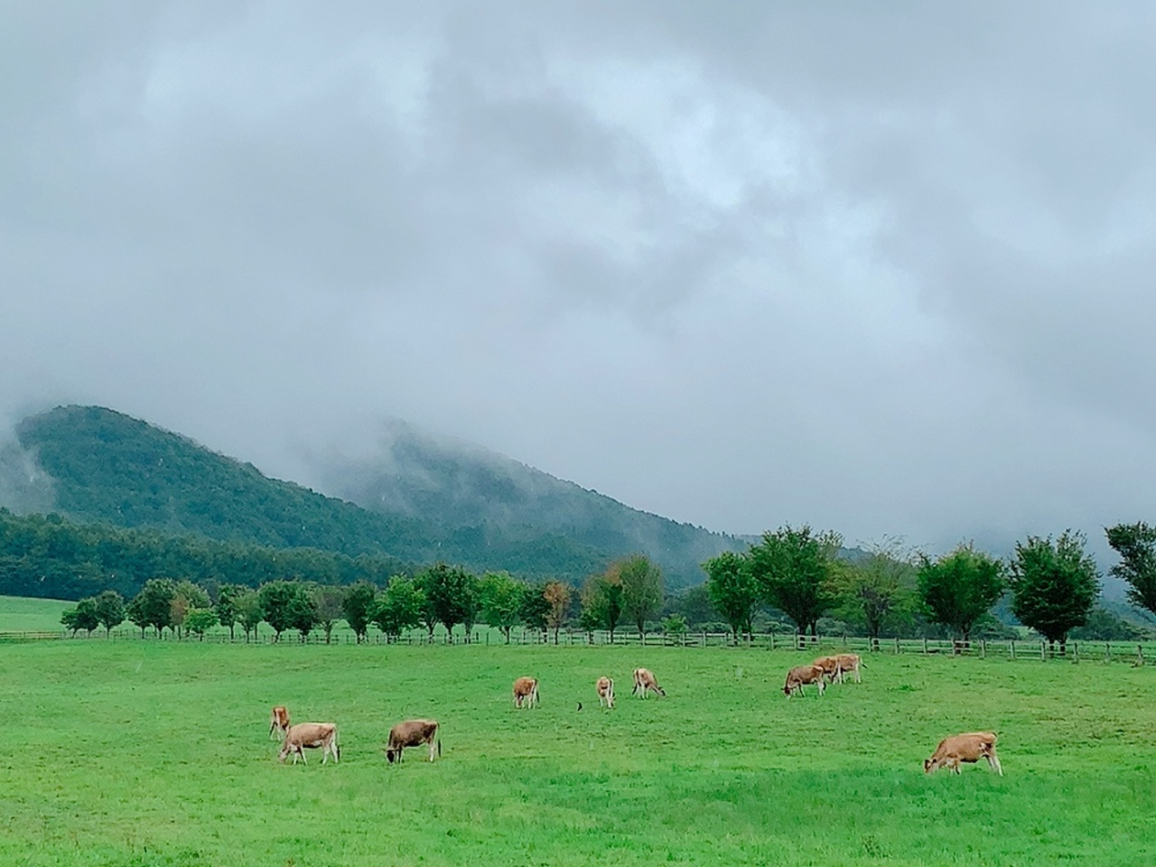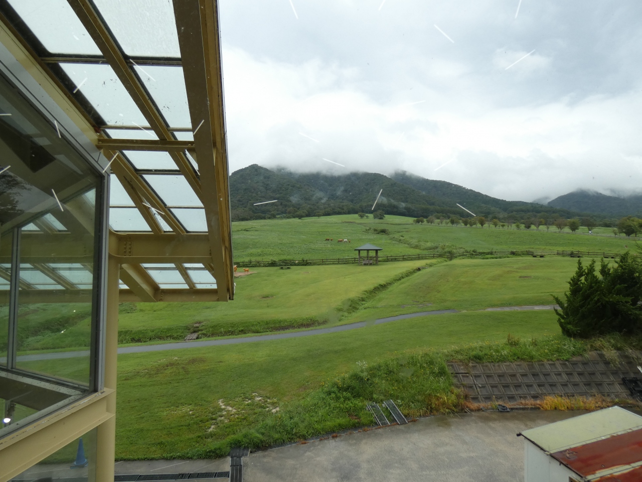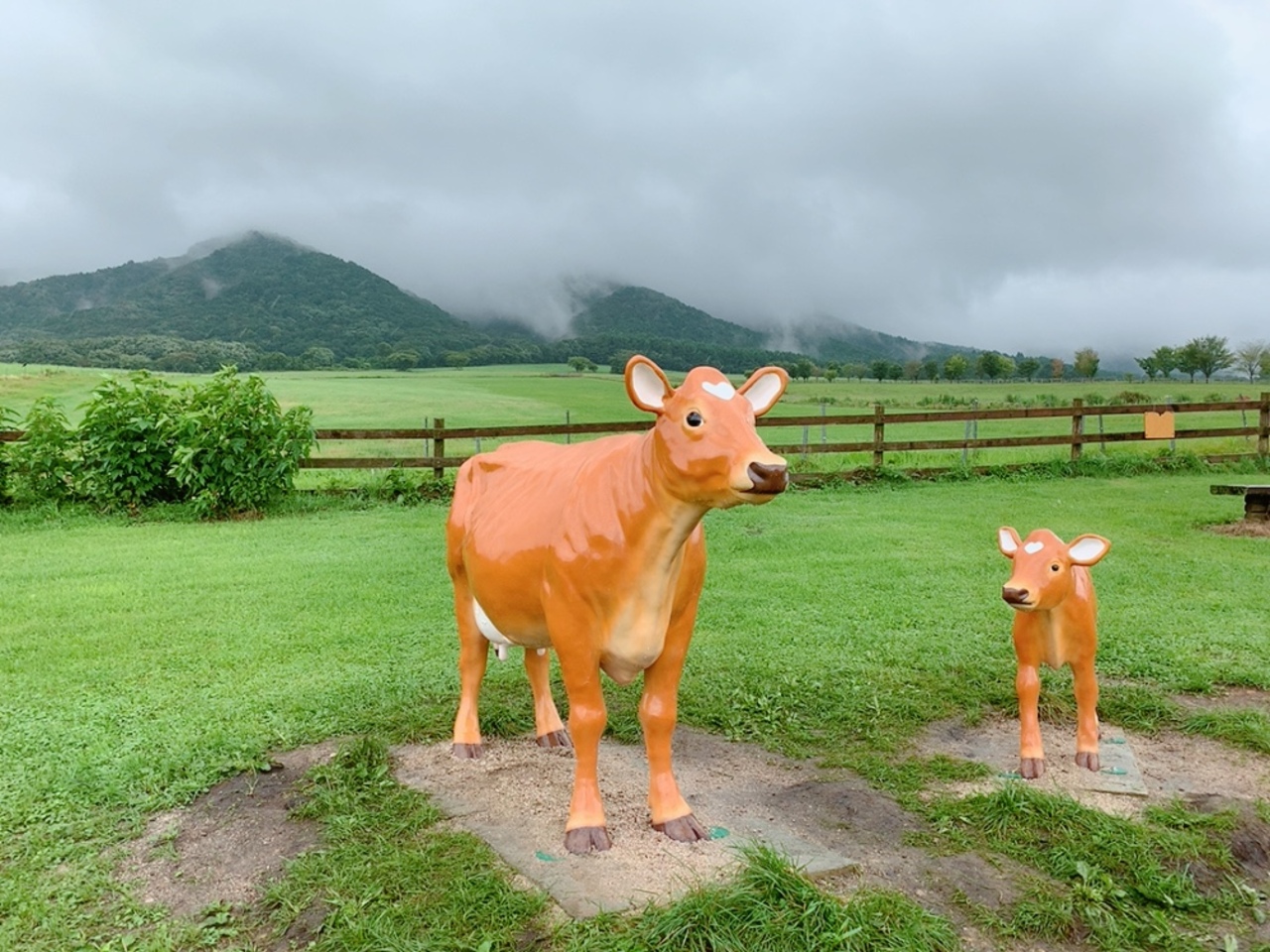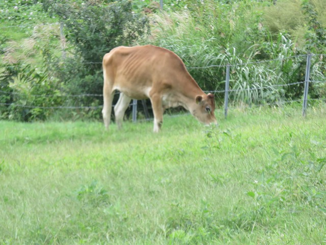 ひるぜんジャージーランドでは、名前の通りジャージー牛を飼育していて、お天気が良ければバックに青空と山を見渡せる、とっても開放的なエリアです。 私が訪れたのはまだ梅雨の時期で、雨模様だったので、素晴らしい景色を望むことは出来ず残念。