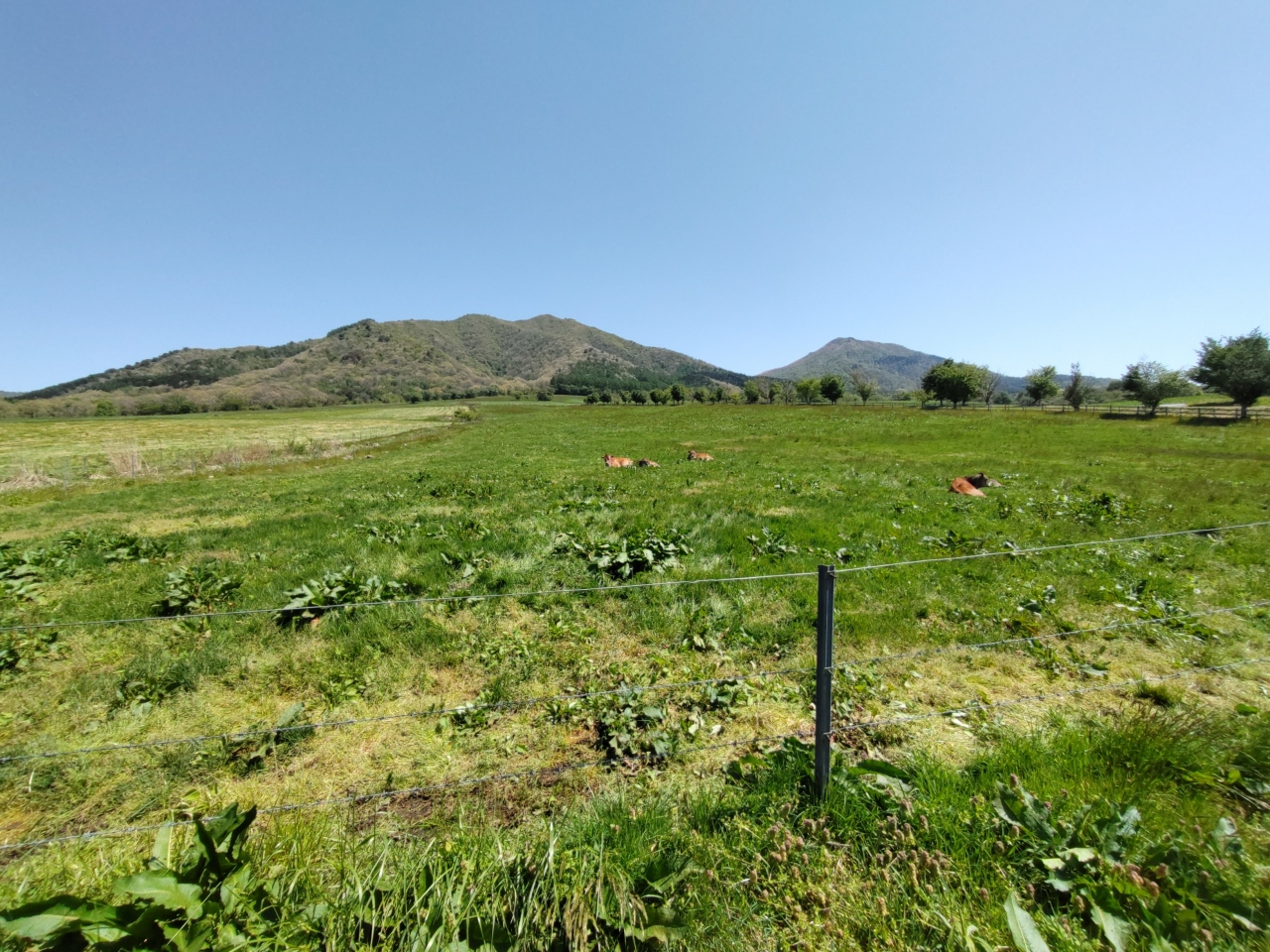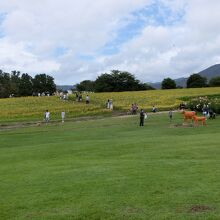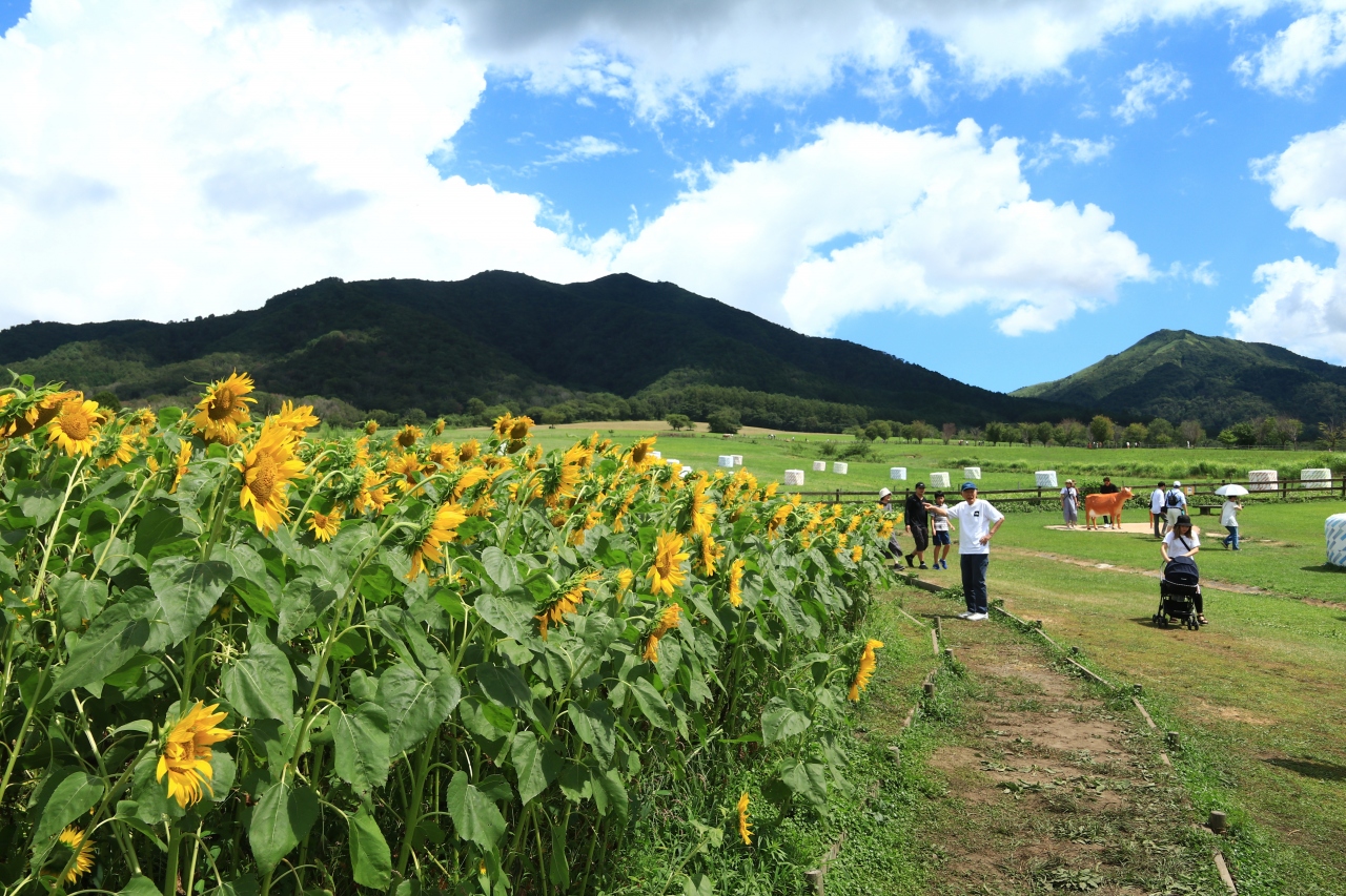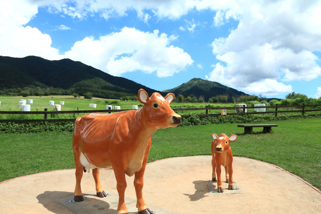 蒜山の裾野に広がる牧草地に、牛や馬がのどかに遊ぶ